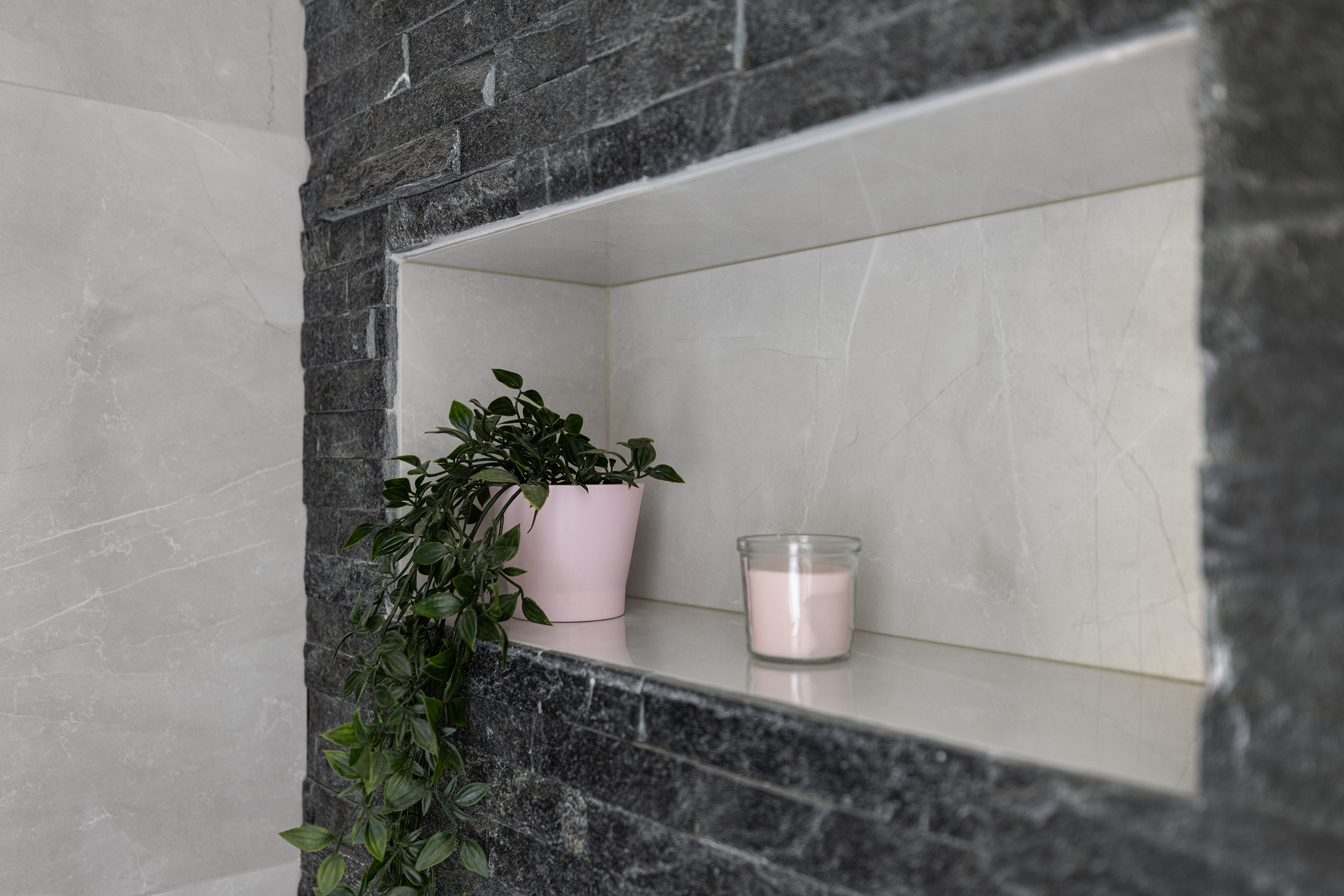 De moderne badkamer (2021) is een luxe wellnessruimte op zich. Volledig betegeld in wit met antraciet en uitgerust met: