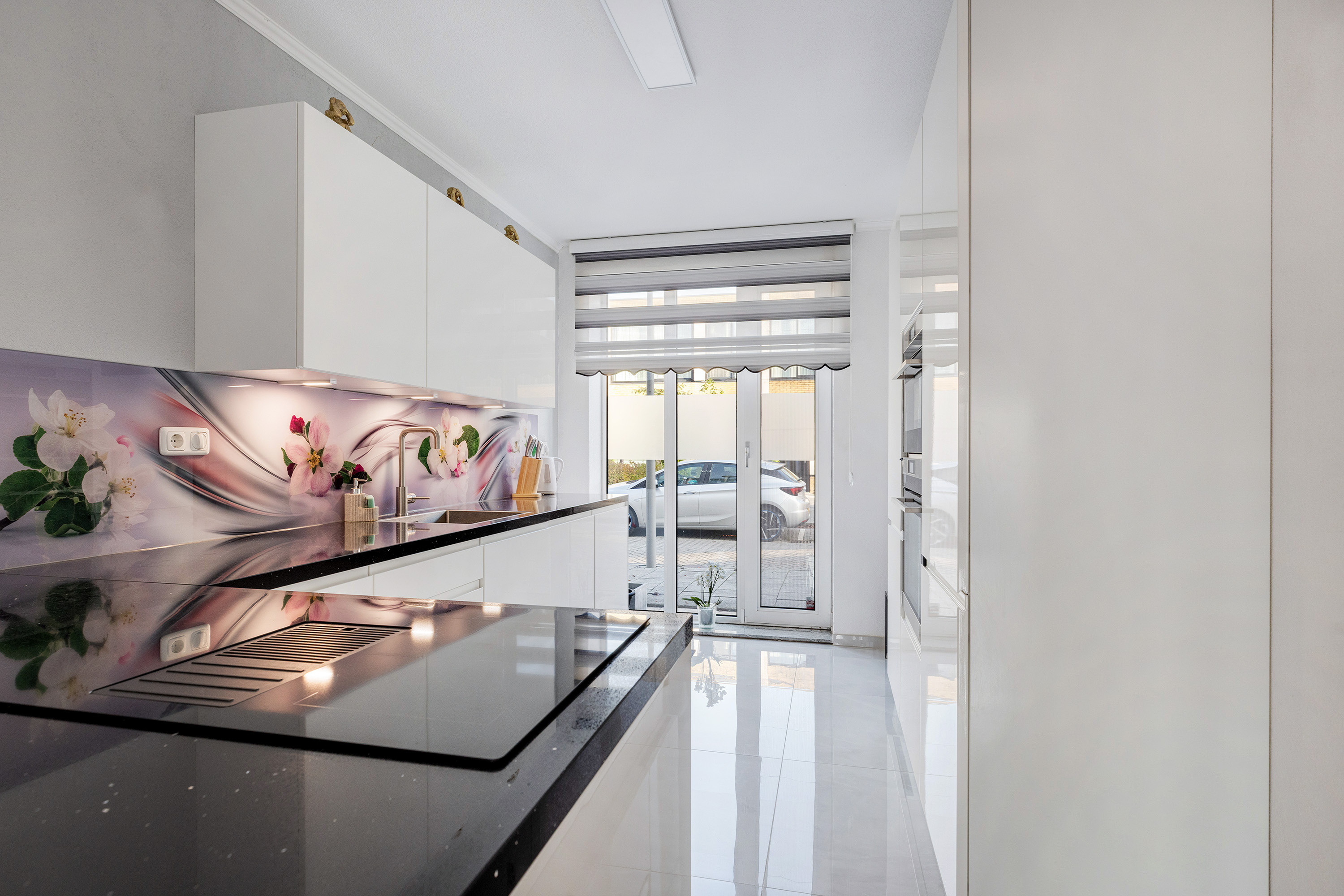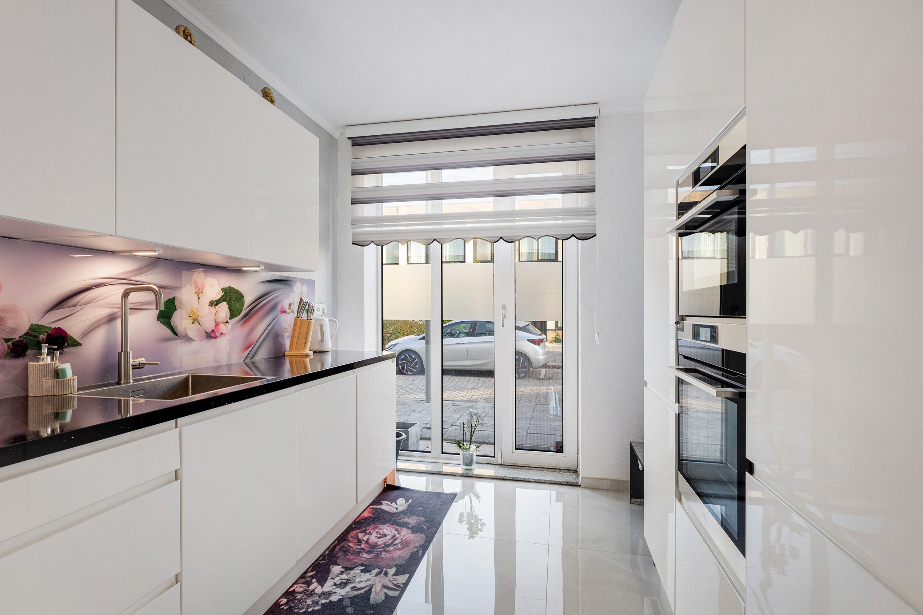 Via openslaande deuren bereikt u de voortuin, waardoor de keuken heerlijk licht is en een fijne verbinding heeft met buiten.