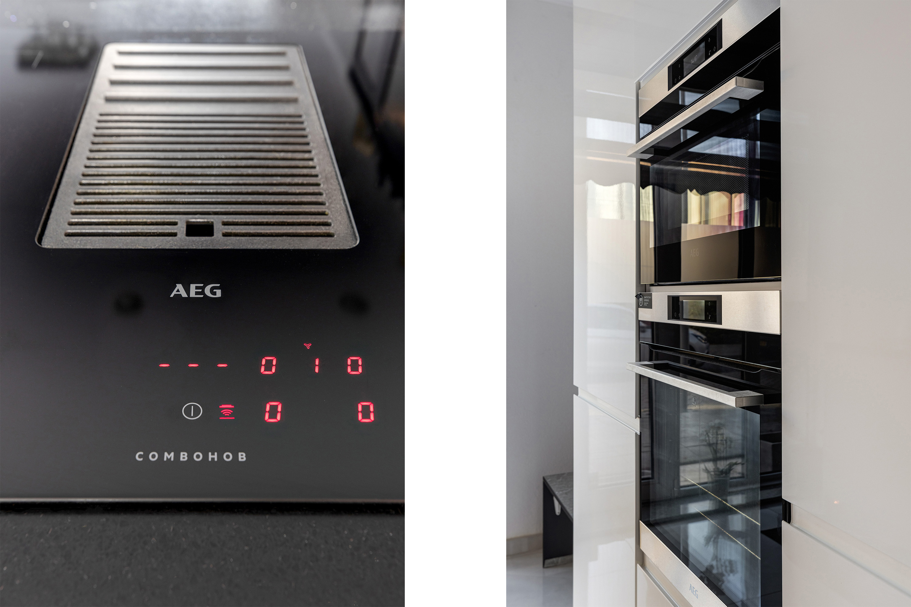 een grote koelkast, een grote vriezer, 4-pits inductiekookplaat met geïntegreerde afzuiging, combi-oven, vaatwasser en een praktische LeMans-carrouselkast
