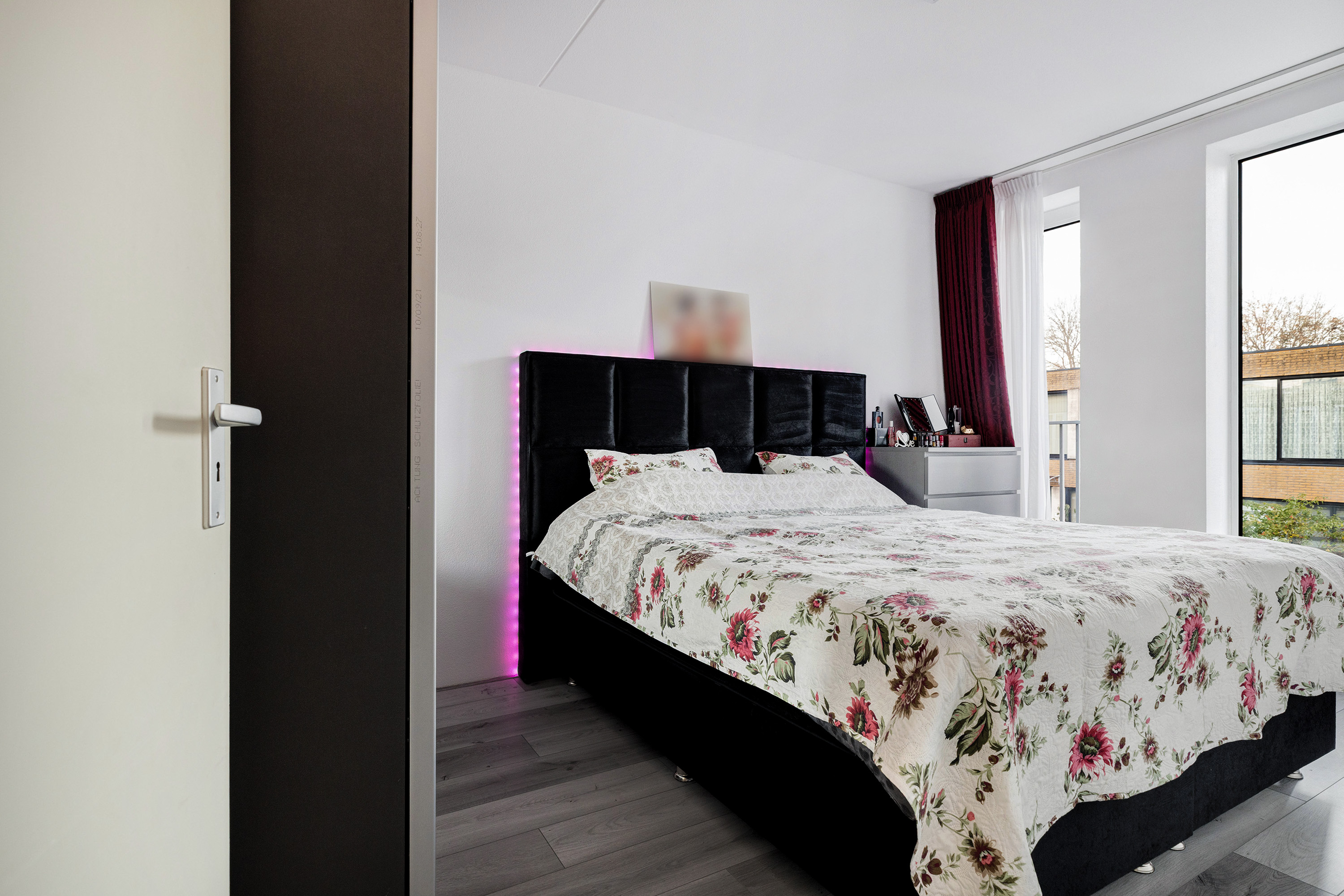 Slaapkamer 1 ligt aan de voorzijde van de woning en is voorzien van twee Franse balkons.