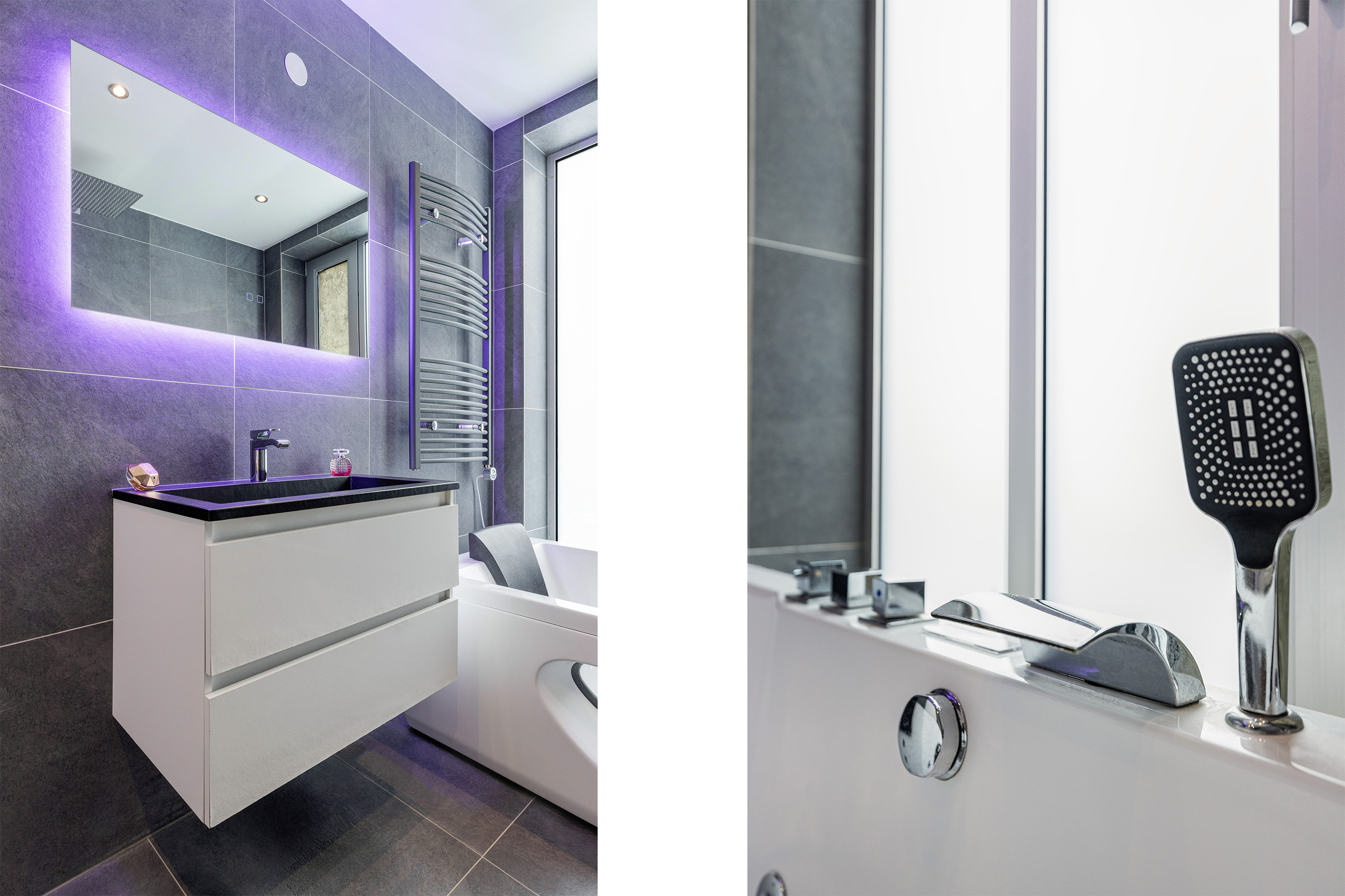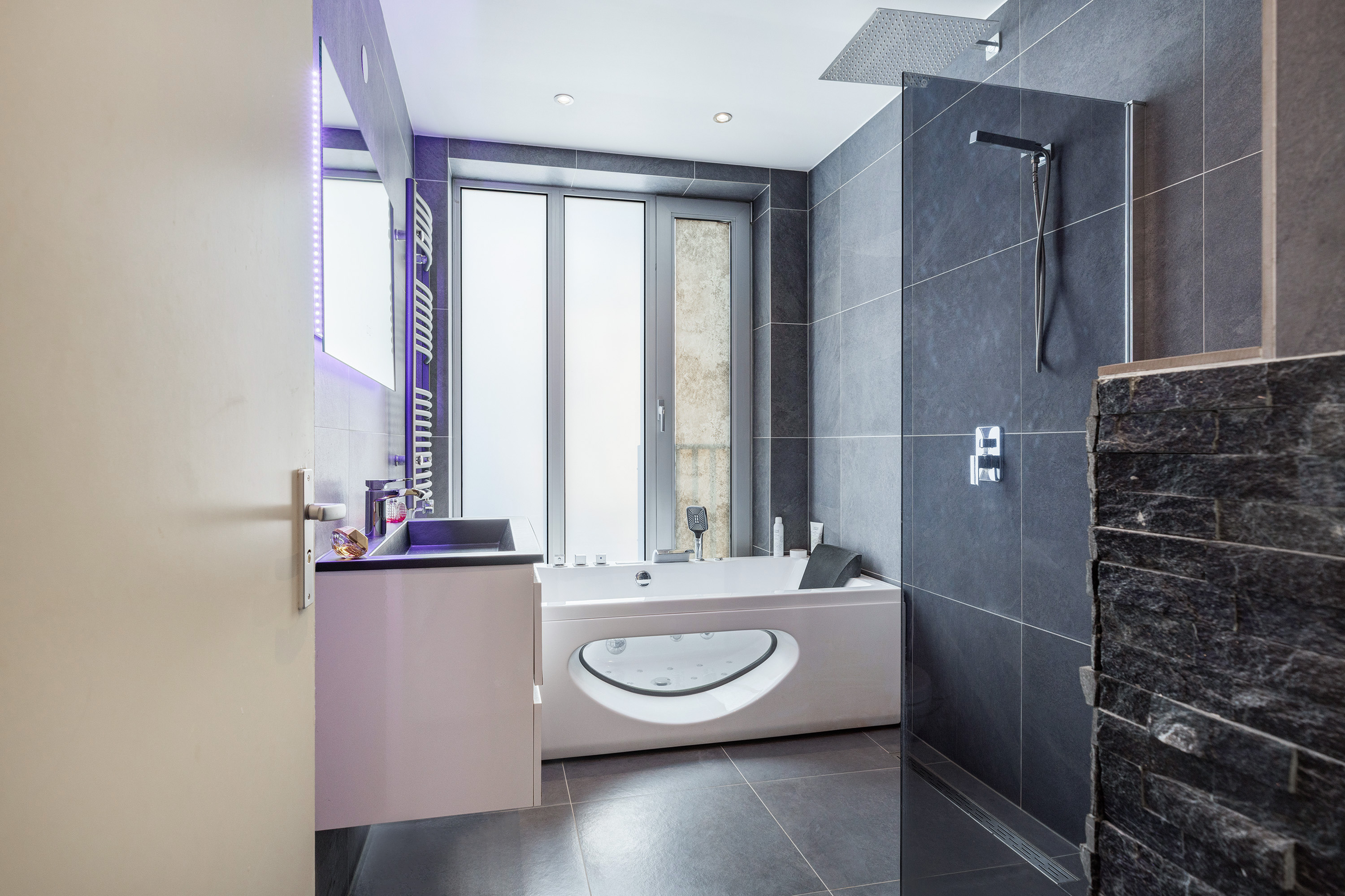 een stijlvol wastafelmeubel, spiegel met verlichting en verwarming, tweede hangend toilet, inloopdouche en een duo-whirlpool met verlichting