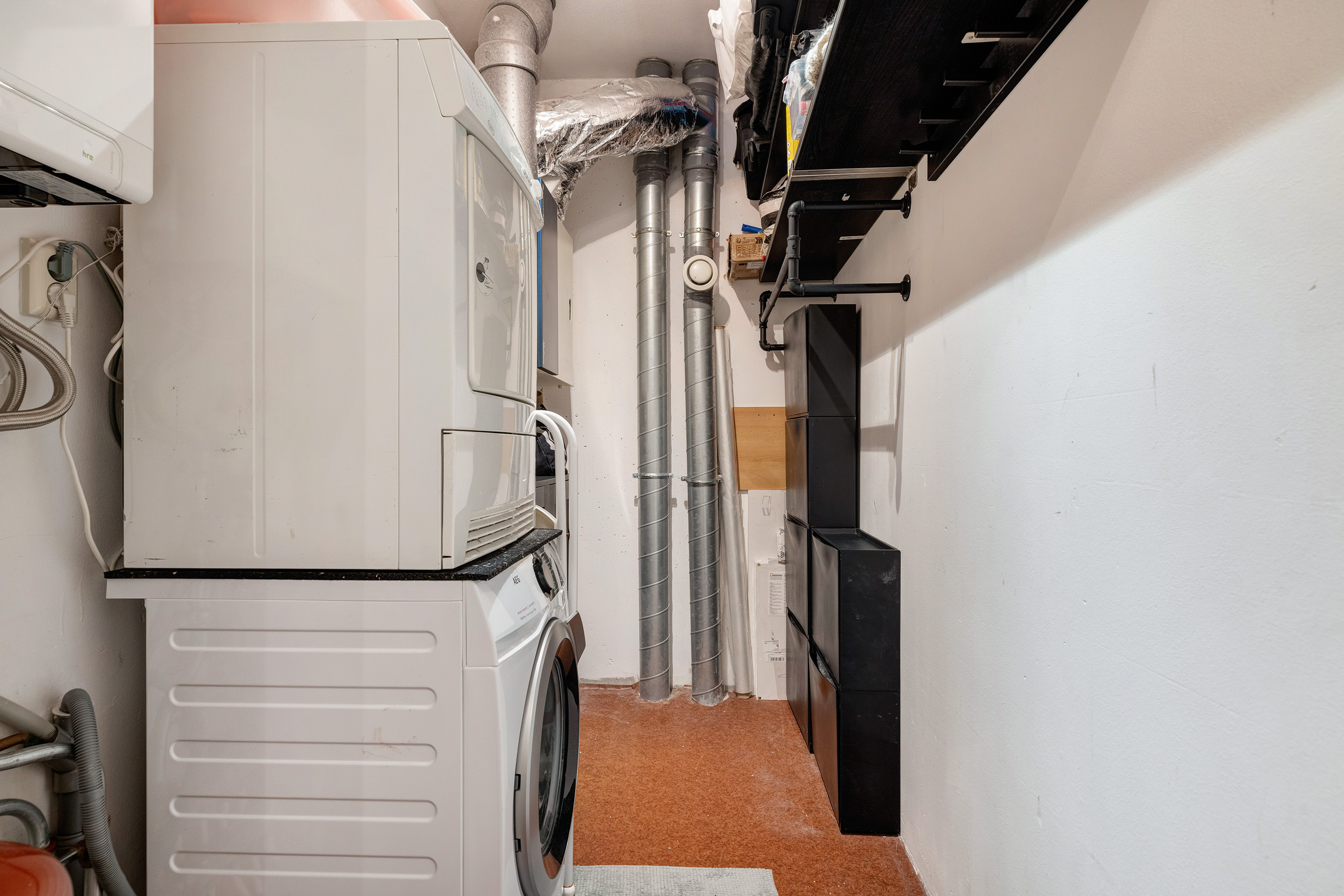 De praktische technische ruimte biedt plaats aan de CV-combiketel, WTW-unit, mechanische ventilatie en aansluitingen voor wasmachine en droger.