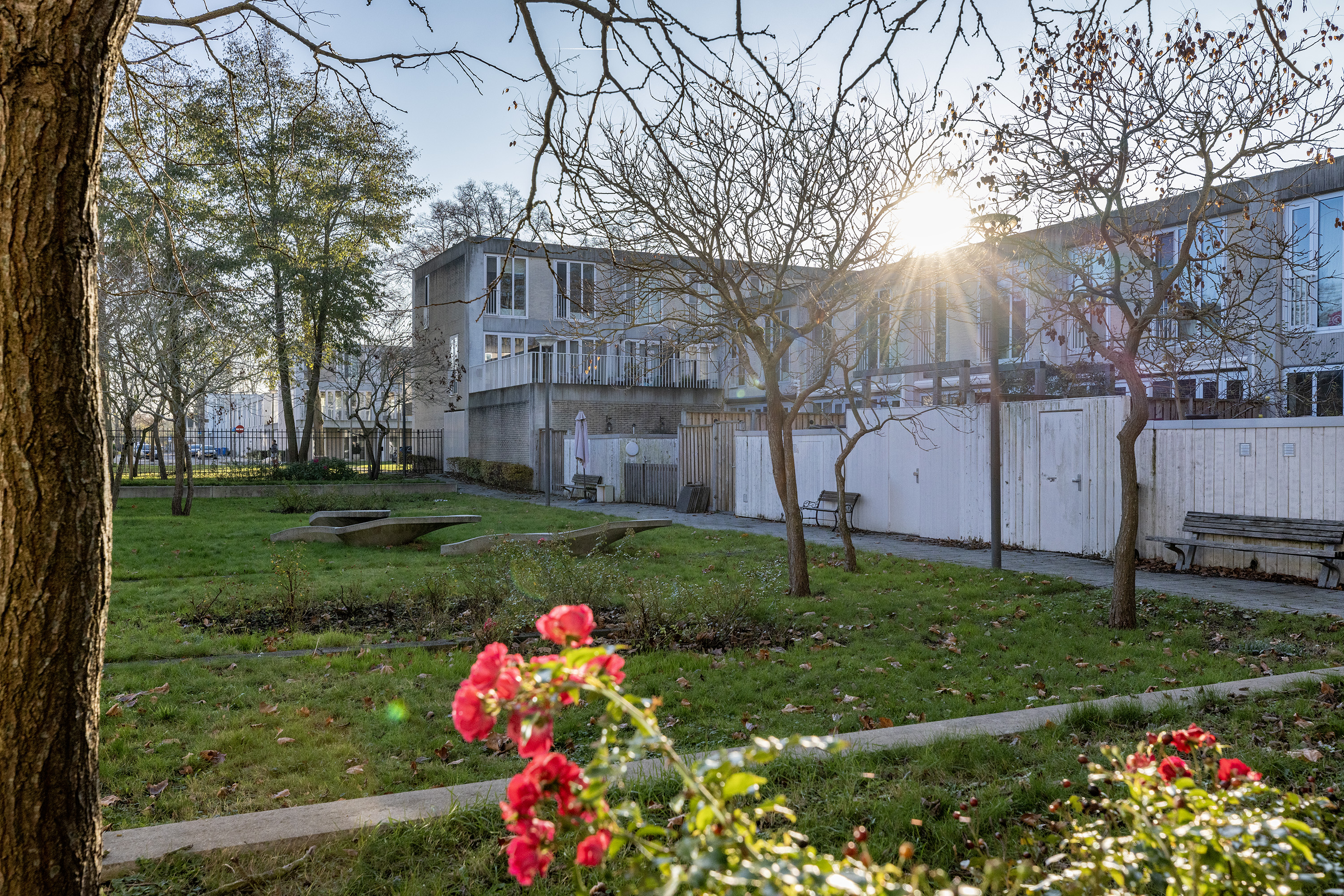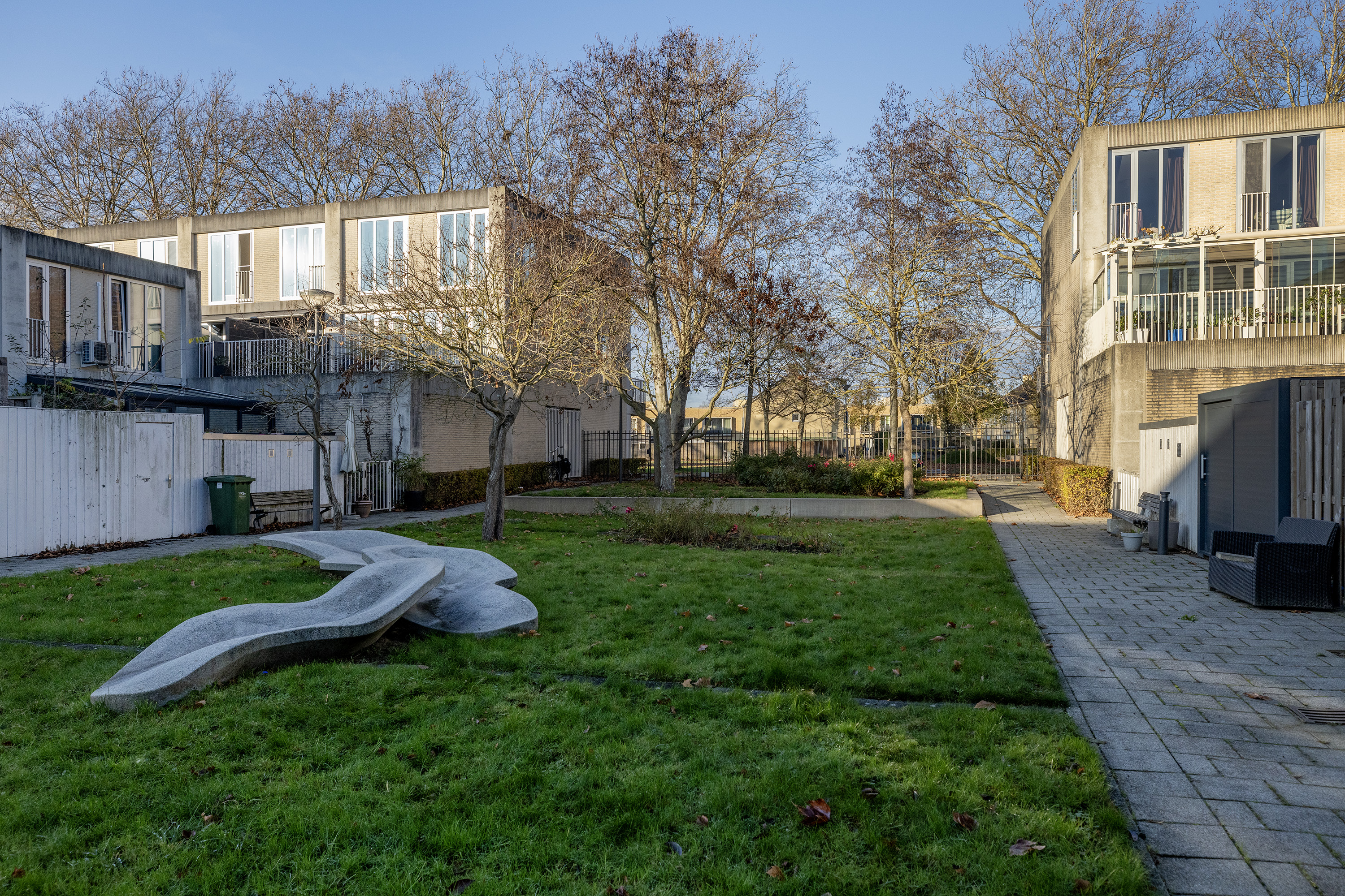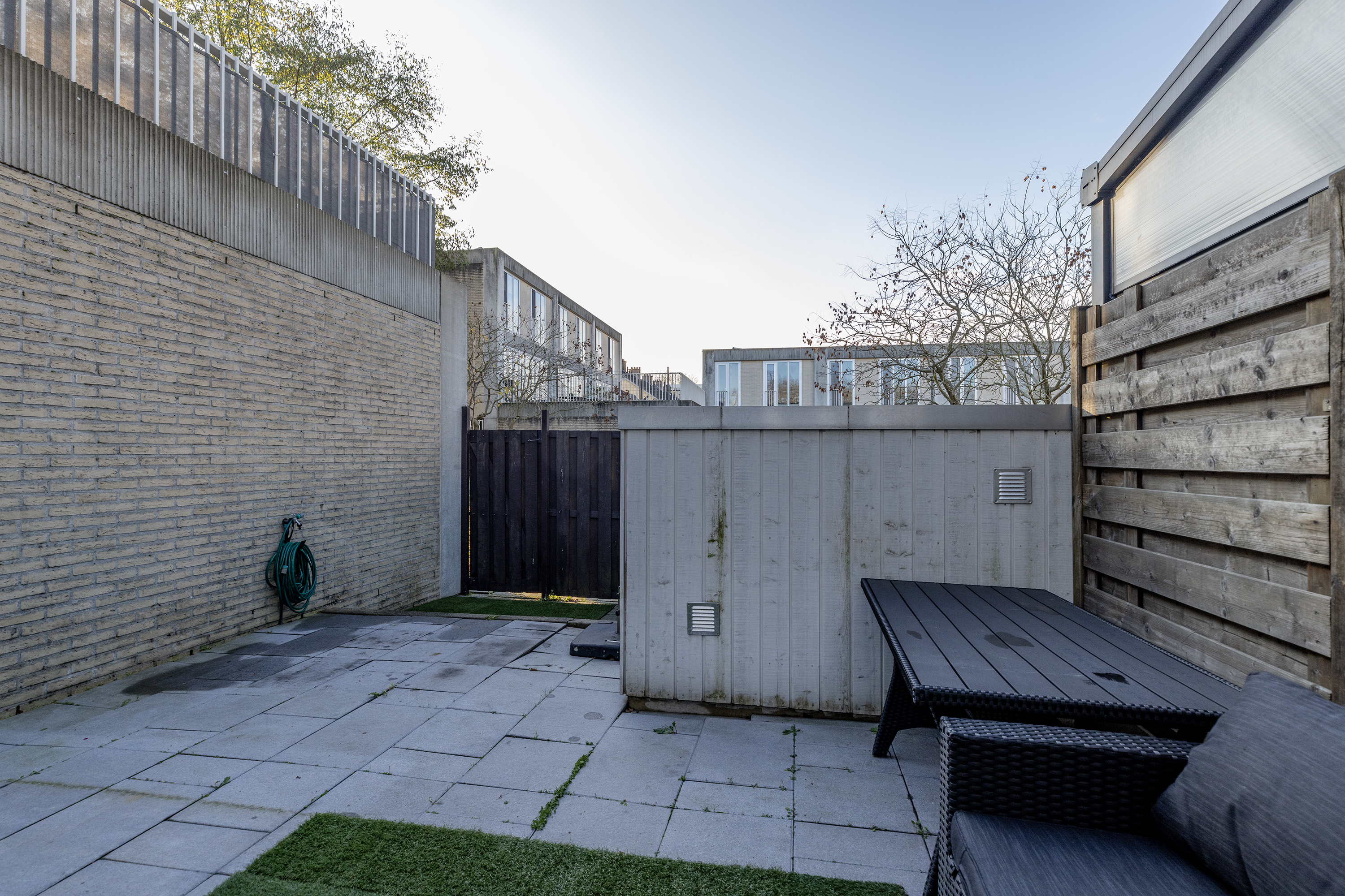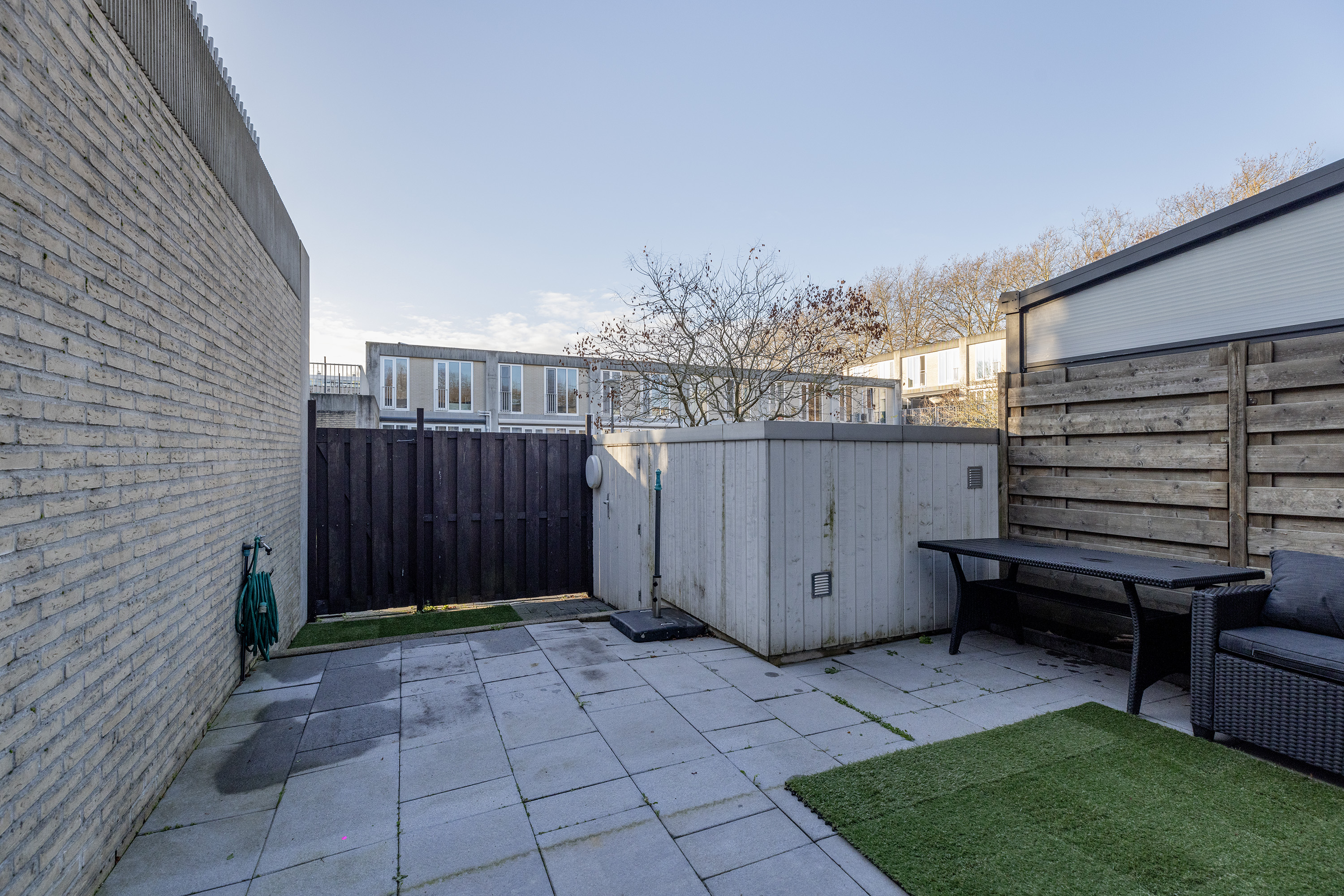 De onderhoudsvriendelijke achtertuin met houten berging ligt op het zonnige westen en is volledig bestraat. Grenzend aan de tuin bevindt zich de afgesloten binnentuin, ideaal als veilige speelplek voor kinderen. Vanuit zowel de achtertuin als via de straat bereikt u de eigen parkeerplaats in de overdekte, afgesloten parkeergarage.