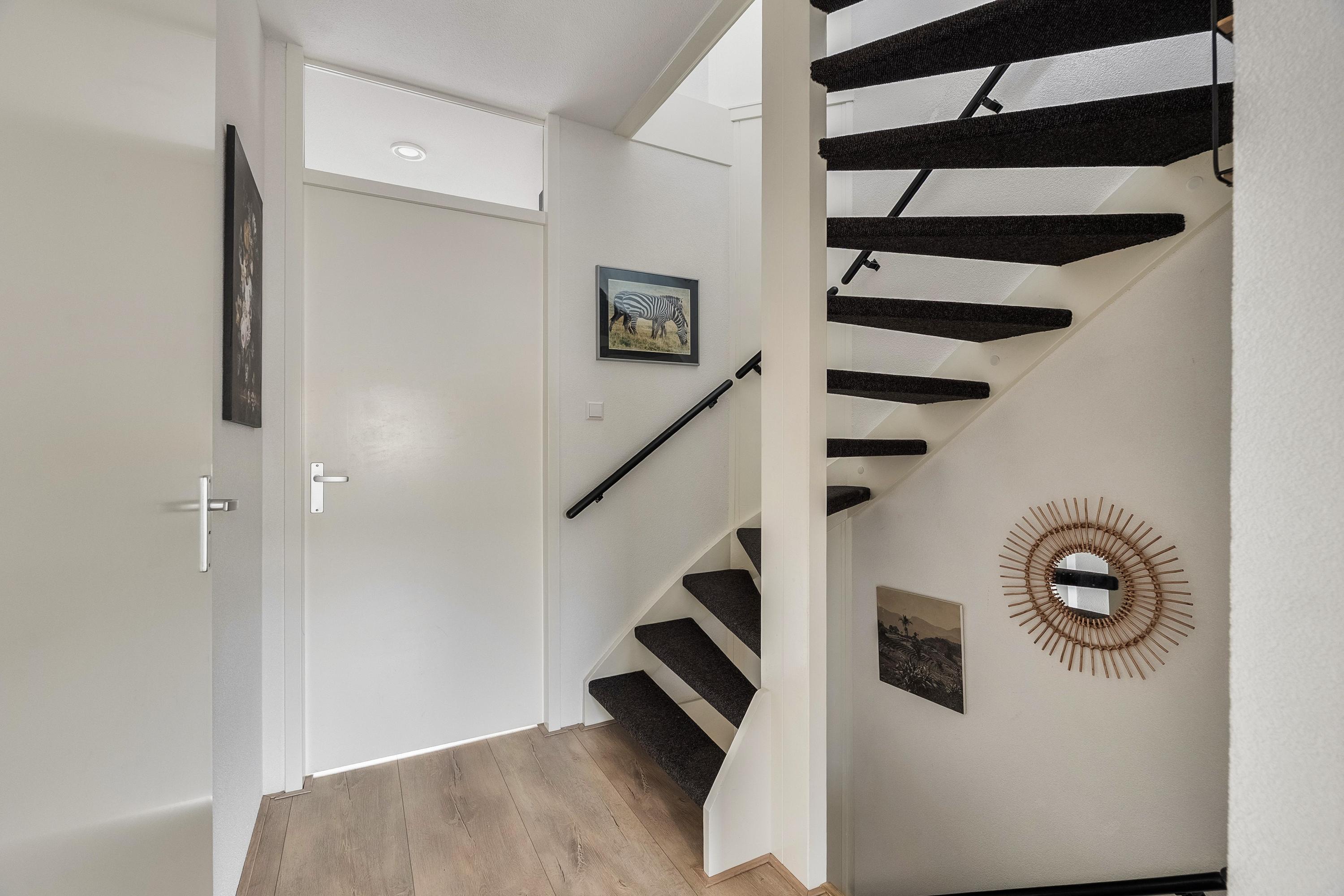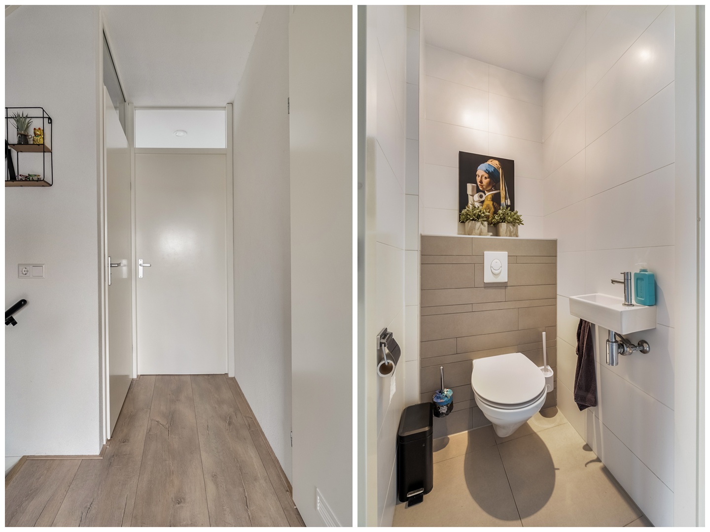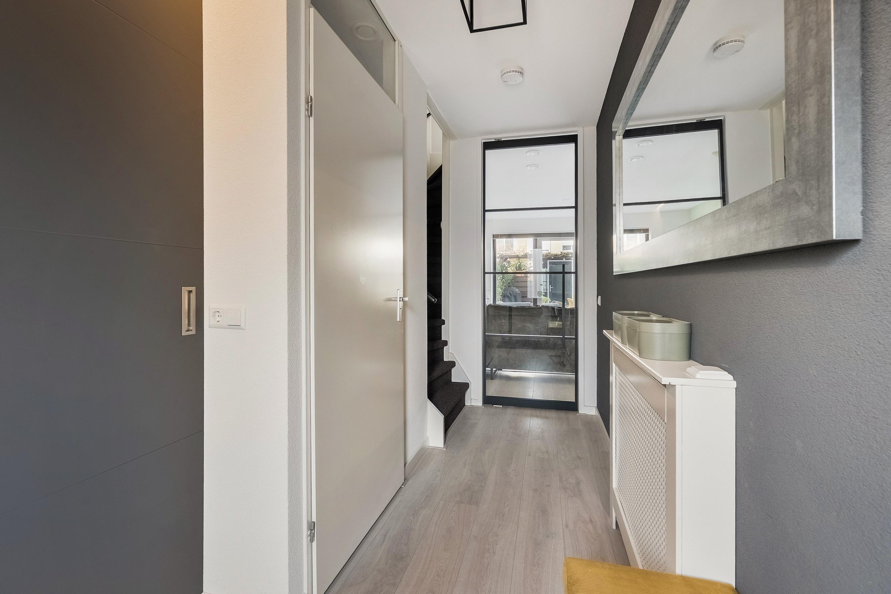 Via de sfeervolle voortuin betreedt u de woning. De ruime hal is praktisch ingericht met schuifkasten voor de meterkast en garderobe. De toiletruimte is modern afgewerkt met een hangend toilet en fonteintje, volledig betegeld in een stijlvolle wit/grijze kleurstelling.