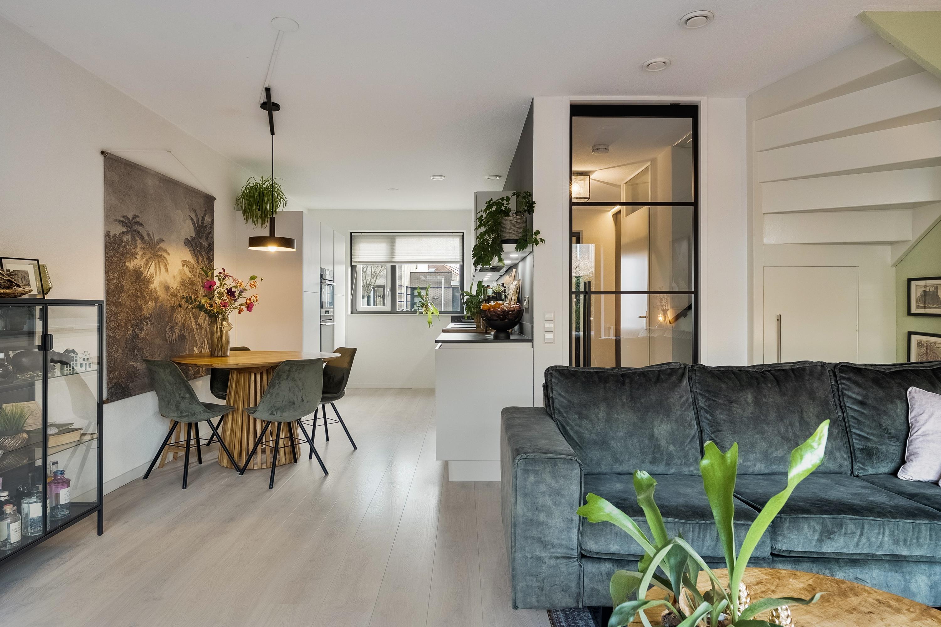 De woonkamer is bereikbaar via een fraaie zwart stalen taatsdeur en voelt direct licht en uitnodigend aan dankzij de grote raampartijen en de openslaande deuren naar de achtertuin. De laminaatvloer zorgt voor een warme en moderne uitstraling. Daarnaast beschikt de woonkamer over een handige bergruimte onder de trap.