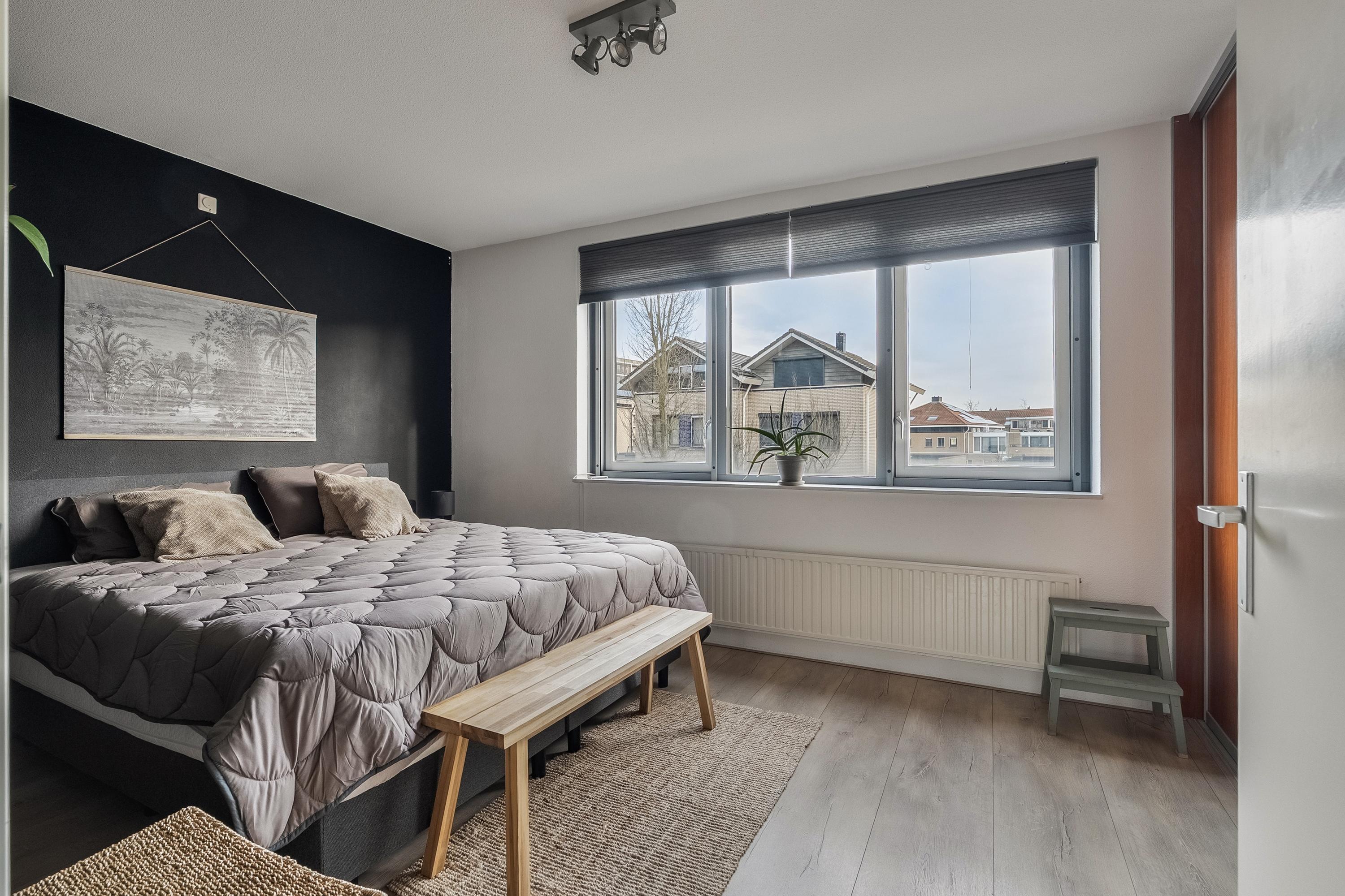 Slaapkamer 1 (voorzijde): voorzien van elektrisch bedienbaar rolluik, twee horren en vaste schuifkastenwand.