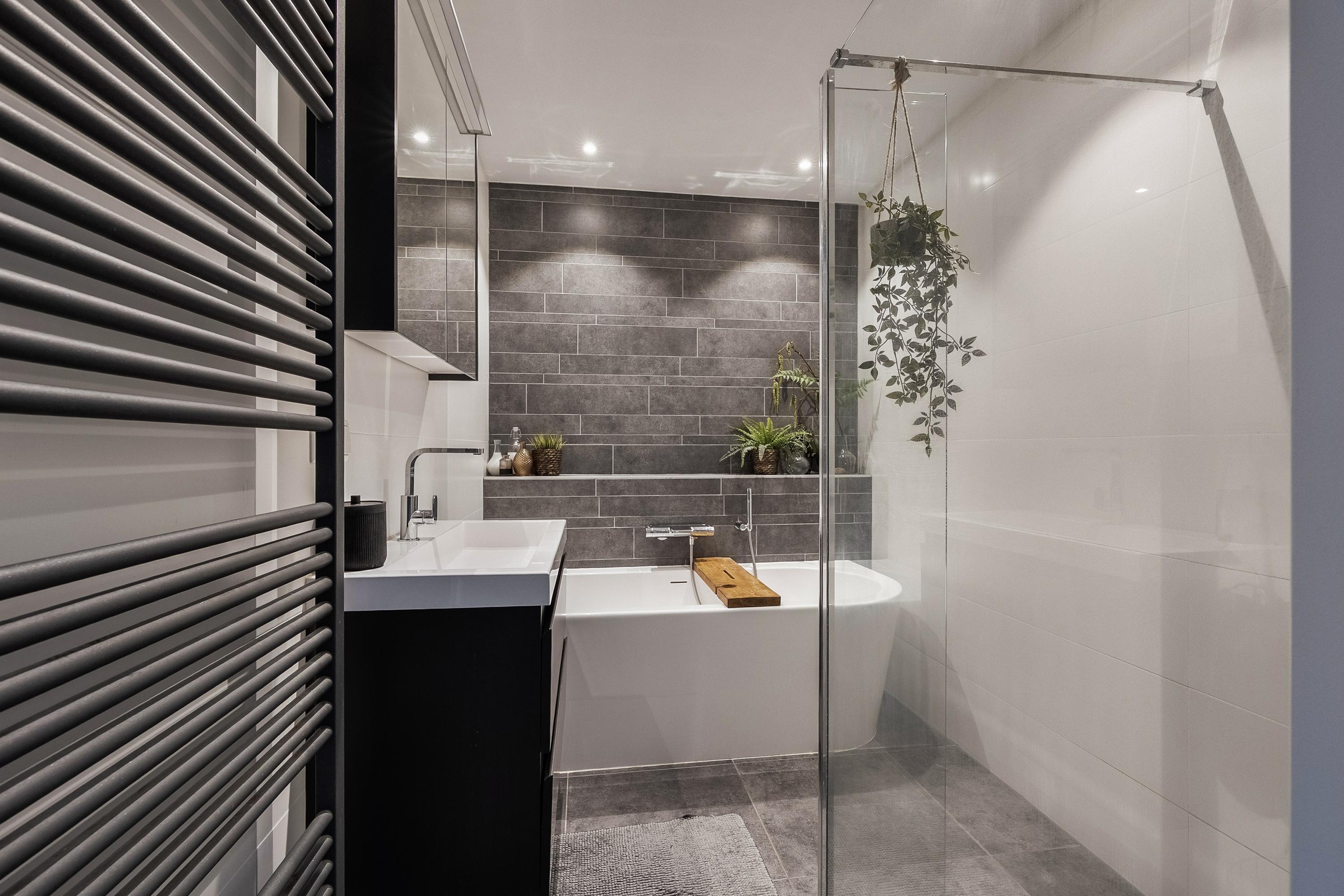 De moderne badkamer is compleet ingericht met een half vrijstaand ligbad, een inloopdouche cabine, een wastafelmeubel met spiegelkast en dimbare spotverlichting in het plafond. De gehele verdieping is afgewerkt met een sfeervolle laminaatvloer.