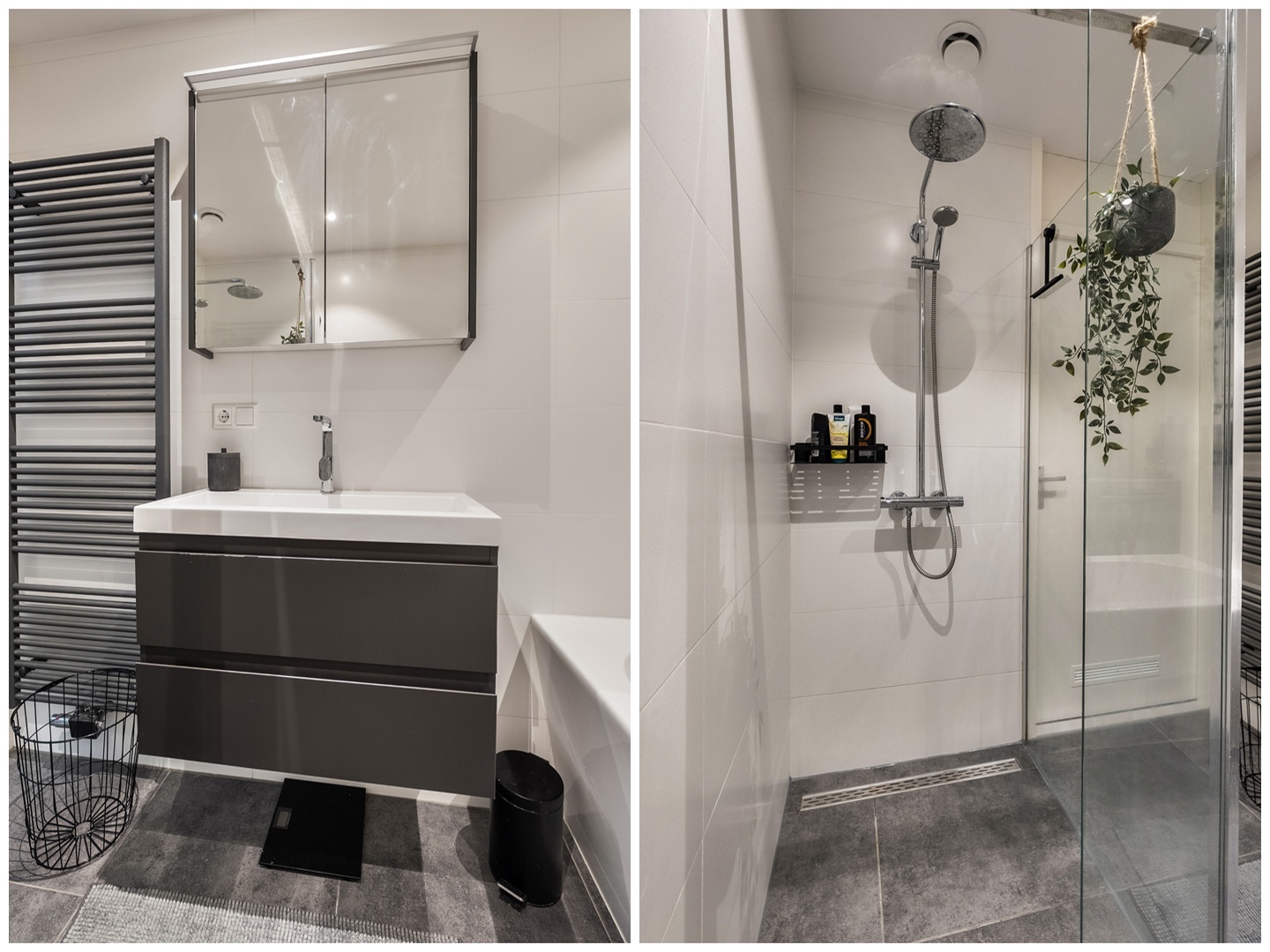 De overloop geeft toegang tot twee ruime slaapkamers, de badkamer en een apart toilet (eveneens met hangend toilet en fonteintje, in dezelfde wit/grijze tegelstijl).