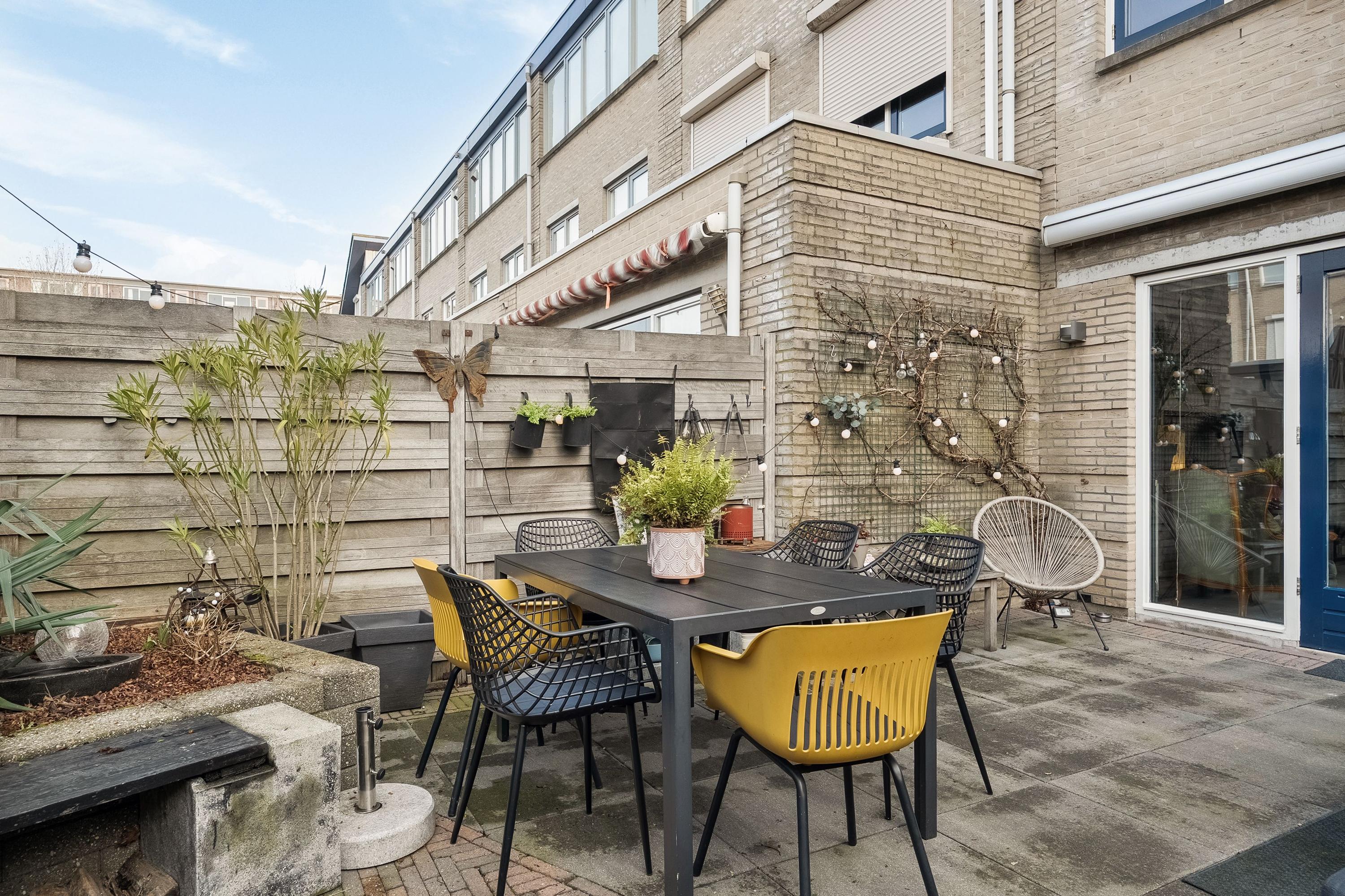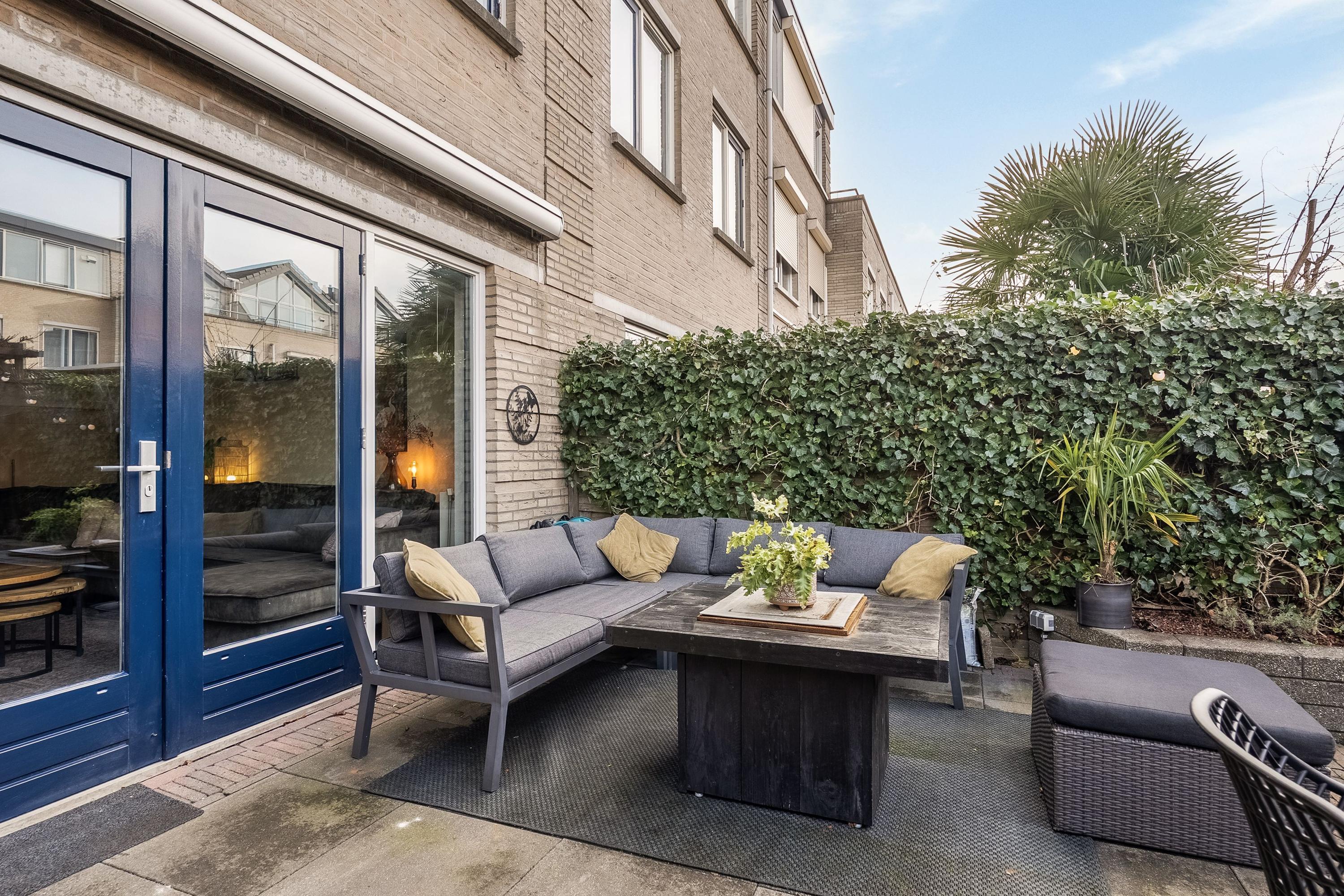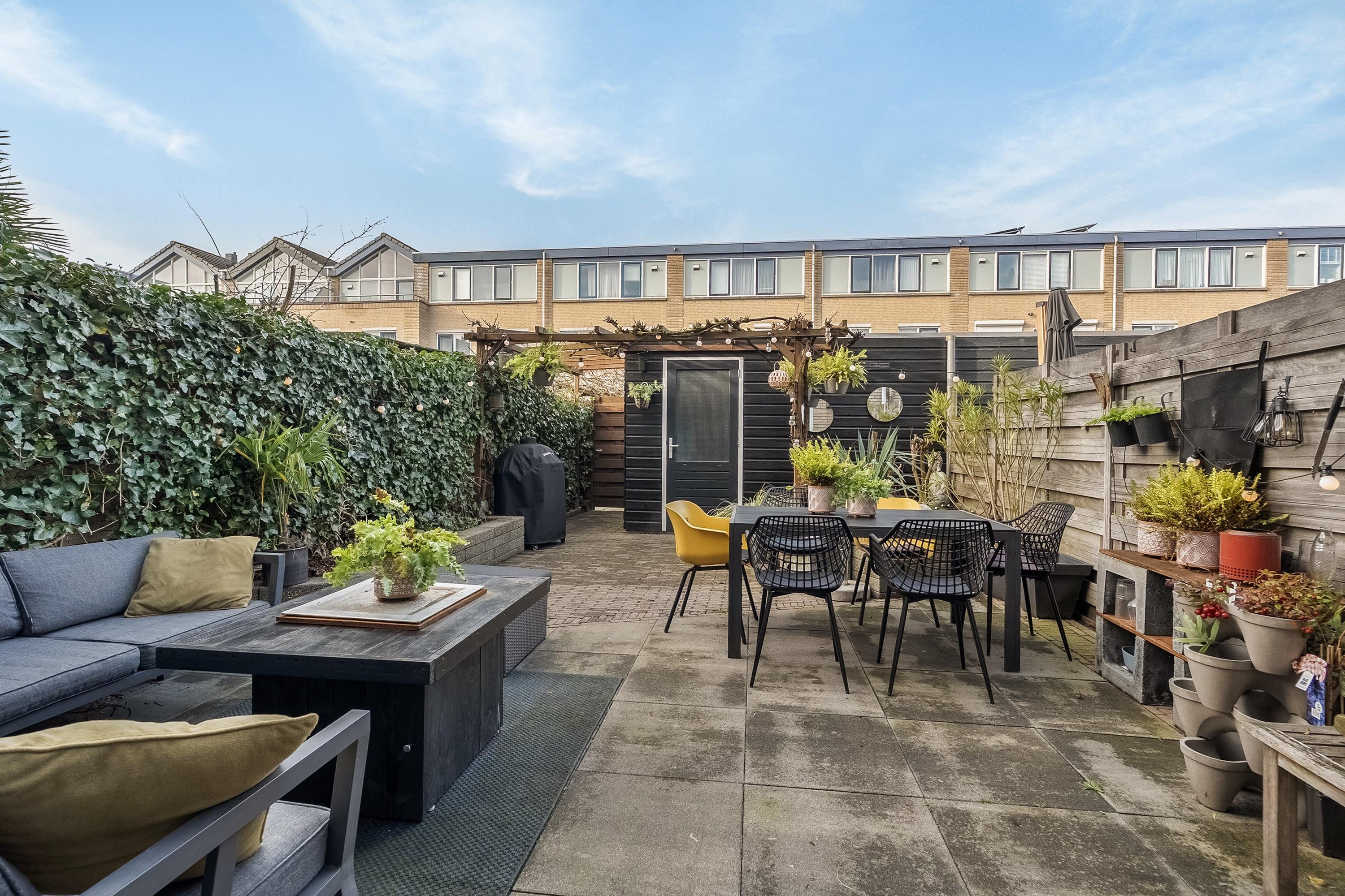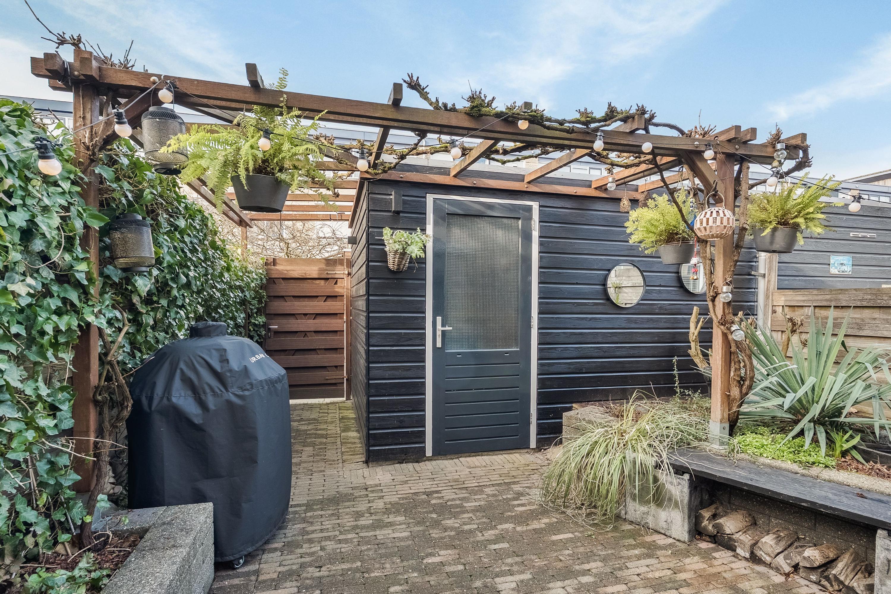 De achtertuin op het noordwesten is een heerlijke plek om te ontspannen. Volledig omsloten door houten schuttingen en een groene haag, biedt de tuin veel privacy. Er zijn meerdere zitplekjes, een pergola met een druivenrank die in de zomer rijkelijk druiven draagt, een houten berging en een elektrisch bedienbaar zonnescherm.