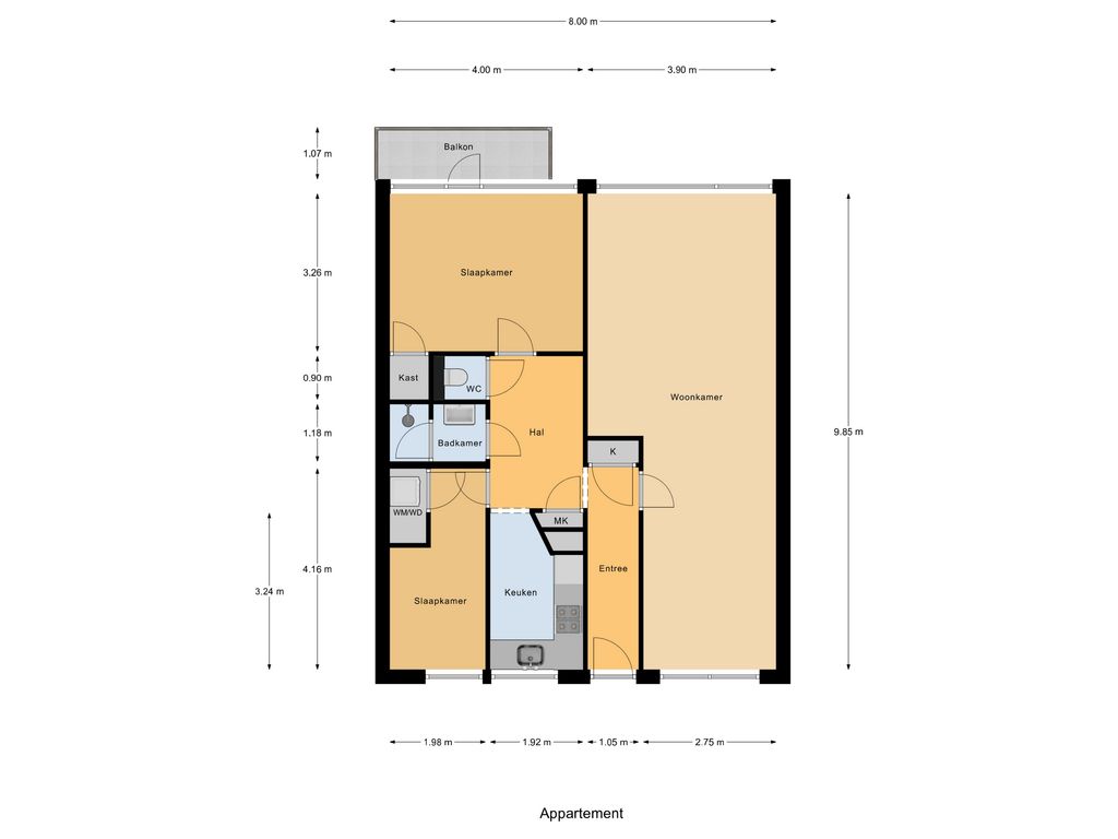 Vanuit de hal heb je toegang tot de twee slaapkamers, het toilet en de badkamer. De hoofdslaapkamer bevindt zich aan de rustige achterzijde en heeft een royale oppervlakte van ca. 12 m². Vanuit hier loop je via een deur zo het zonnige balkon op het westen op, waar je na een lange dag heerlijk kunt ontspannen in de avondzon. De tweede slaapkamer aan de voorzijde is ca. 8 m² groot en beschikt over een handige inbouwkast waar de wasmachine en warmwaterboiler zijn opgesteld. Beide kamers zijn perfect in te delen als slaapkamer, kinderkamer, werkkamer of hobbyruimte.