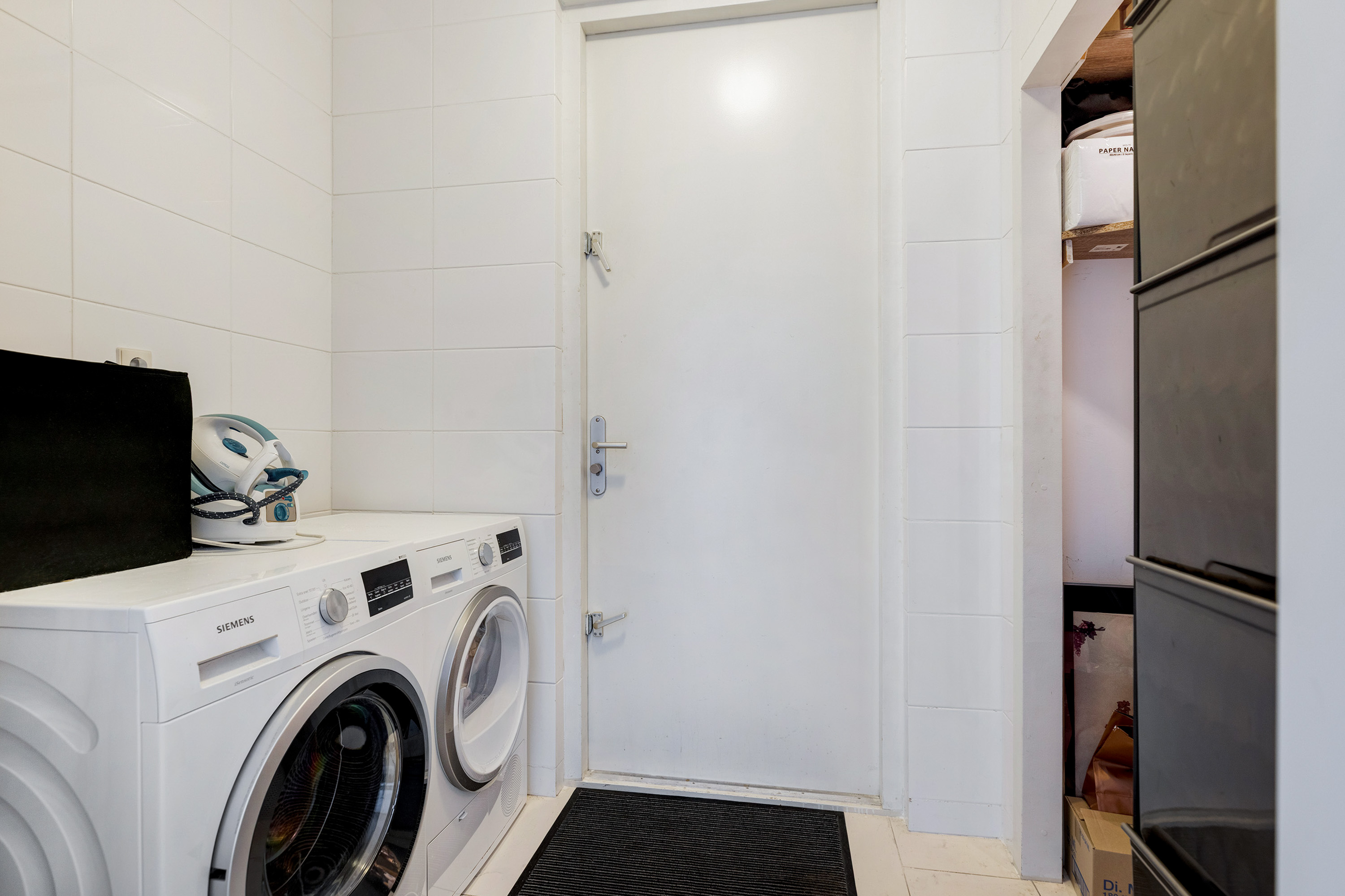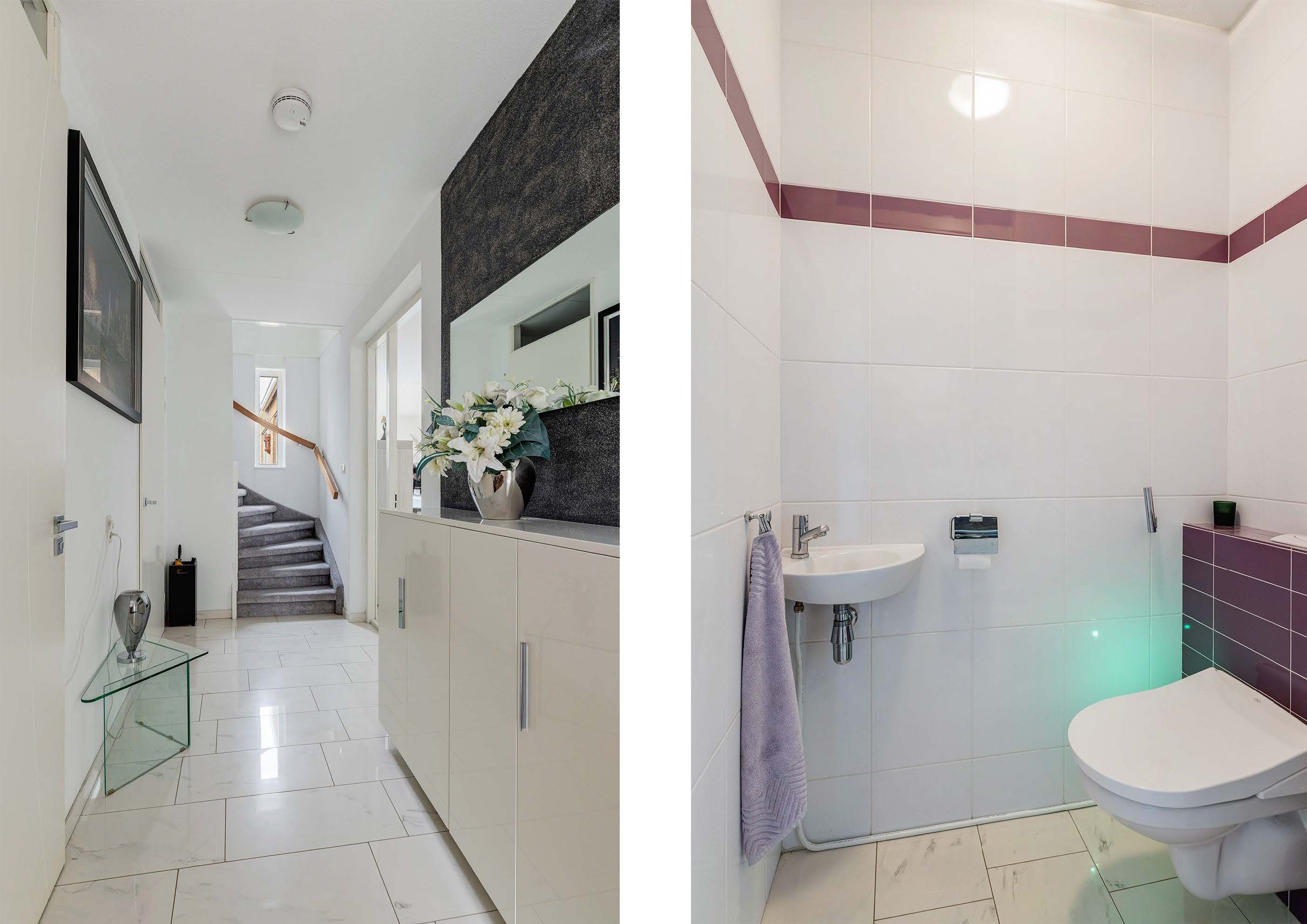 Binnenkomst in de ruime hal, met toegang tot de meterkast, toiletruimte, een aparte bergruimte met aansluiting voor wasmachine en droger en toegang tot de garage, en de toegang naar de woonkamer.