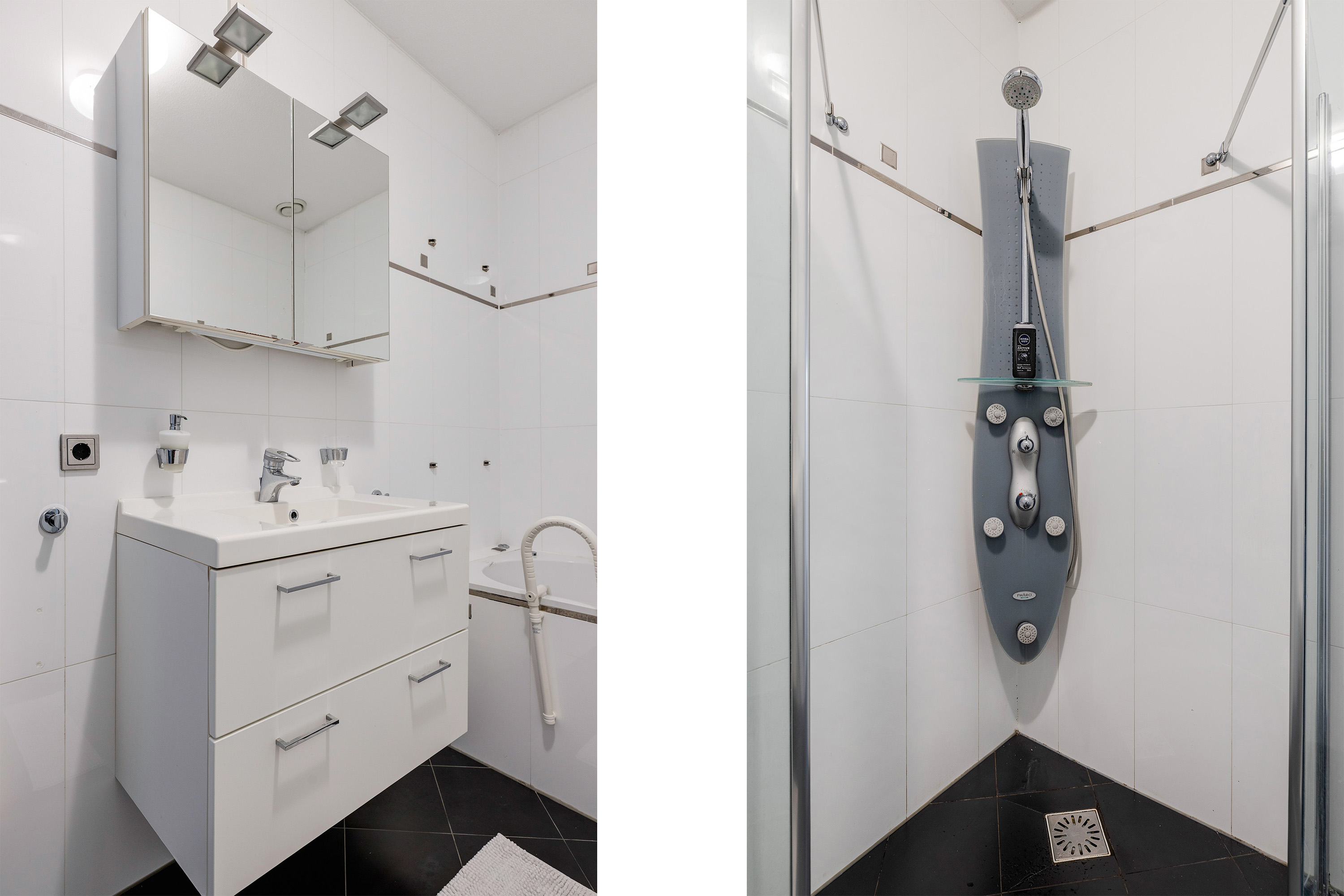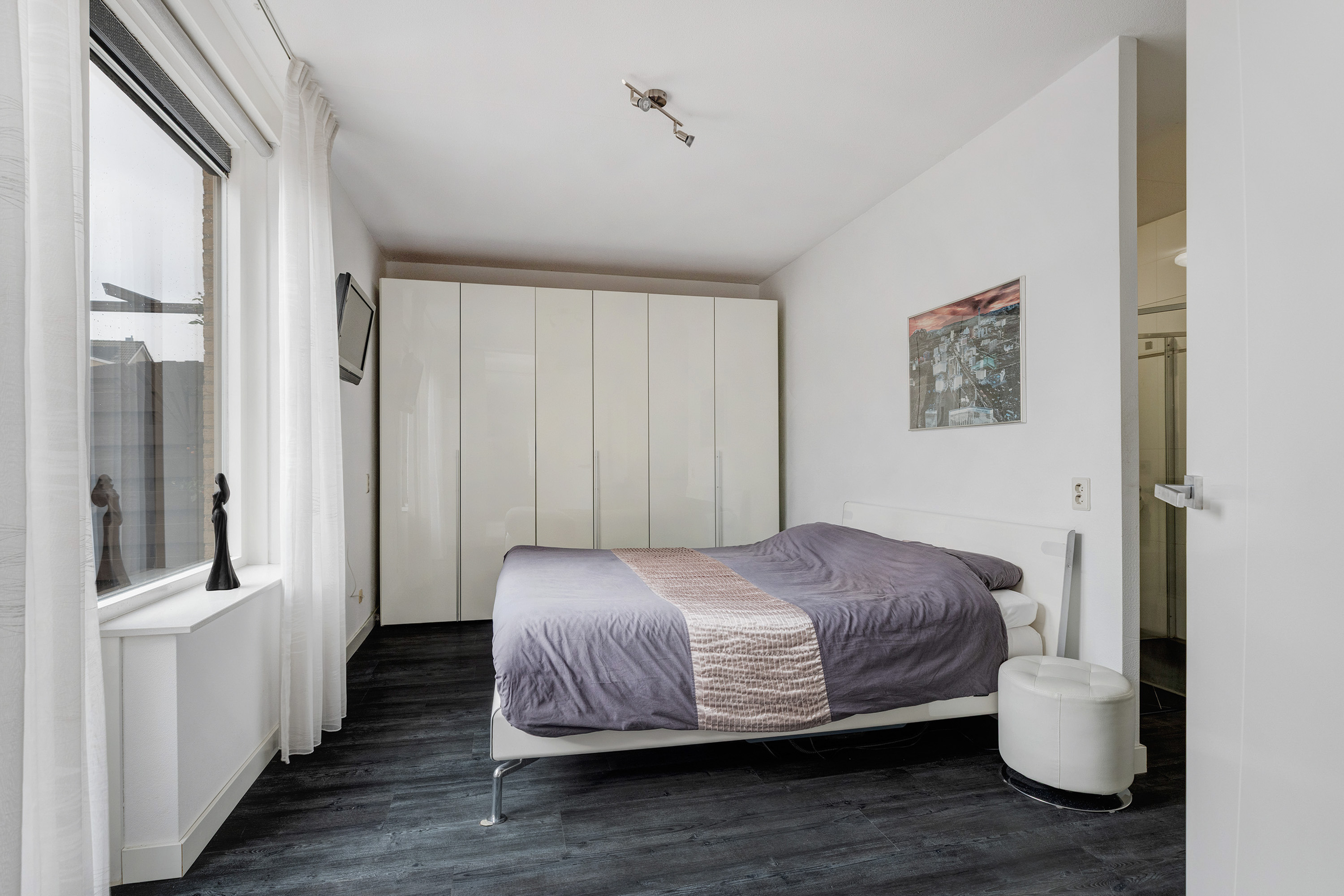 Vanuit de keuken is er toegang tot de master bedroom met vaste kastenwand met de opstelplaats voor CV-ketel en zonneboiler en directe toegang tot de luxe badkamer. Deze is voorzien van een ligbad, douchecabine met jetstreams, hangend toilet en een modern wastafelmeubel.