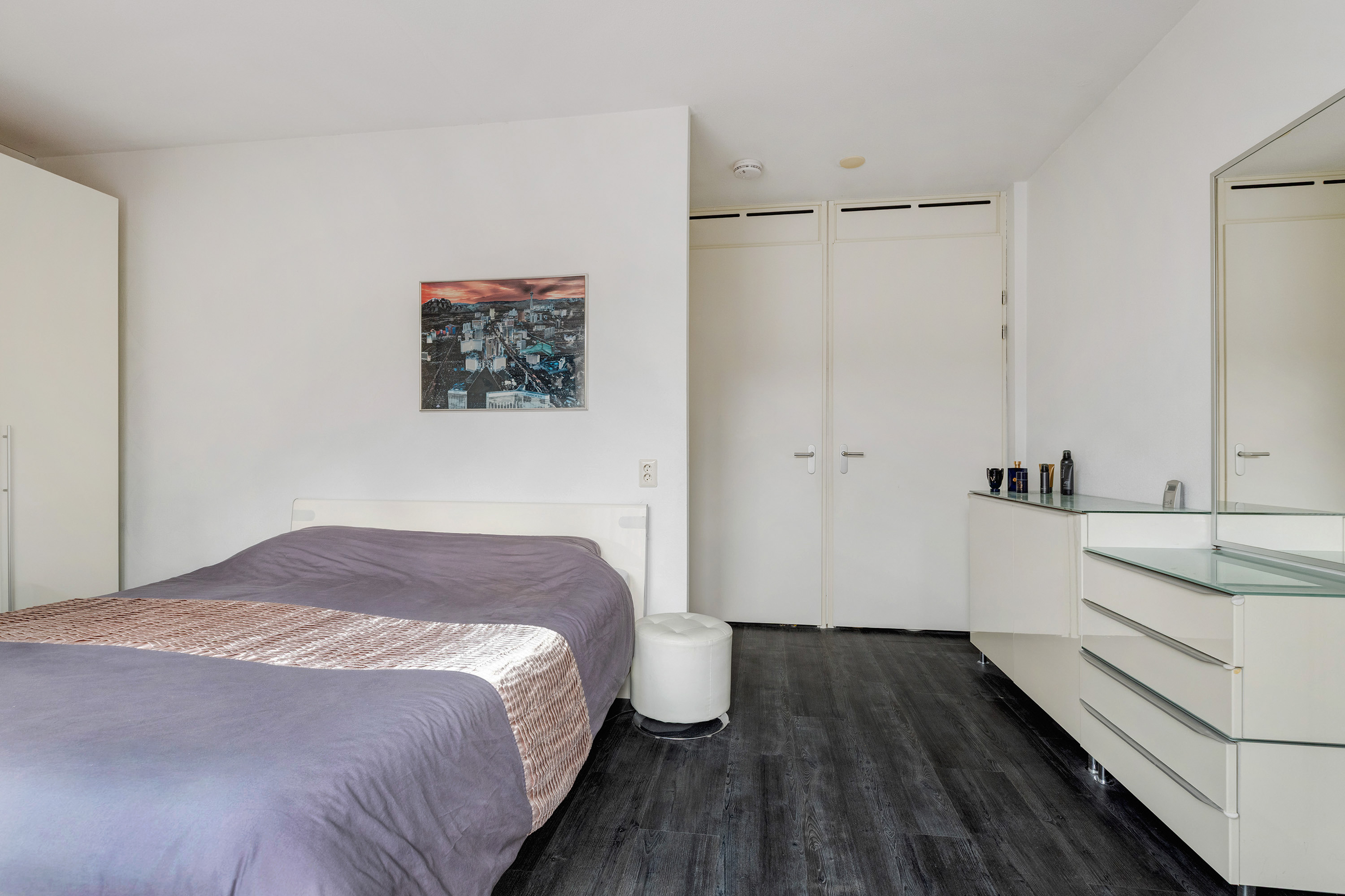 Via de hal bereikt u de trap naar de eerste verdieping. Hier bevindt zich een royale tweede slaapkamer (voorheen 2 slaapkamers), voorzien van twee openslaande deuren – één naar het dak en één naar het charmante Franse balkon.