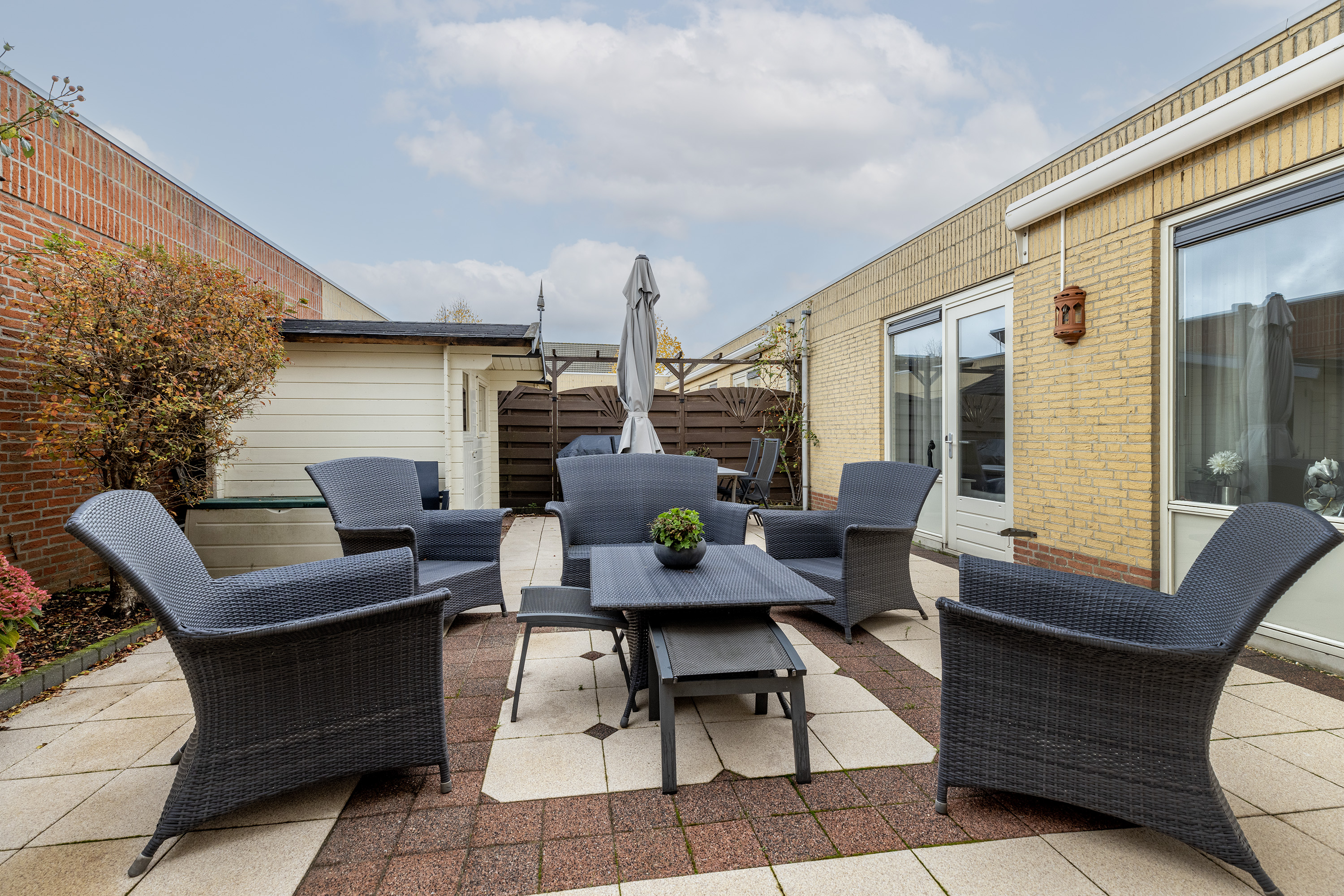 De patiotuin is een waar verlengstuk van de woonkamer – ruim, zonnig en gelegen op het westen. Hier geniet u in alle privacy van de middag- en avondzon. De tuin is onderhoudsvriendelijk ingericht met sierbestrating, vaste plantenborders, een houten berging en een elektrisch zonnescherm.