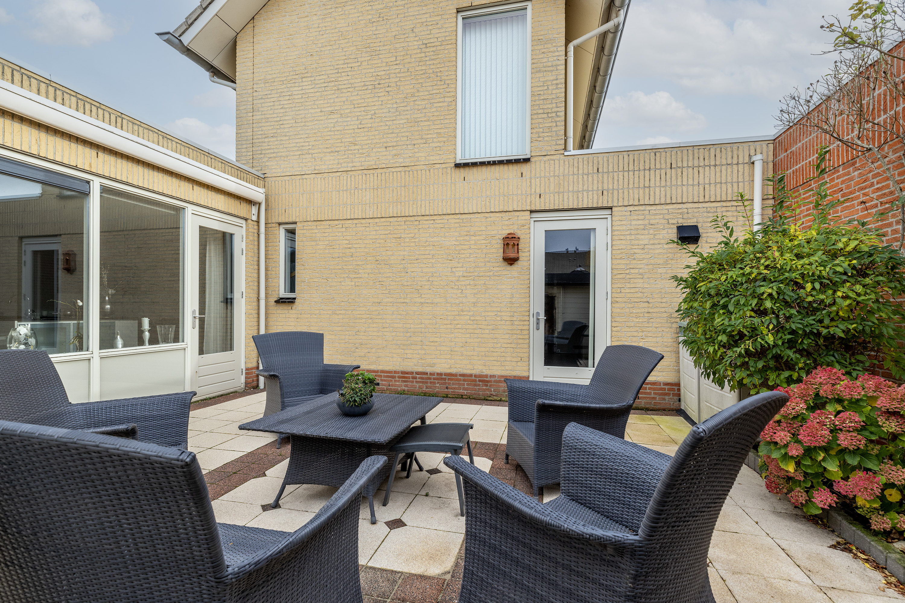 Via de ruime oprit met plaats voor twee auto’s bereikt u de entree van de woning én de garage. De verzorgde voortuin is voorzien van vaste plantenborders en biedt voldoende ruimte voor een zitje op het ruime terras.