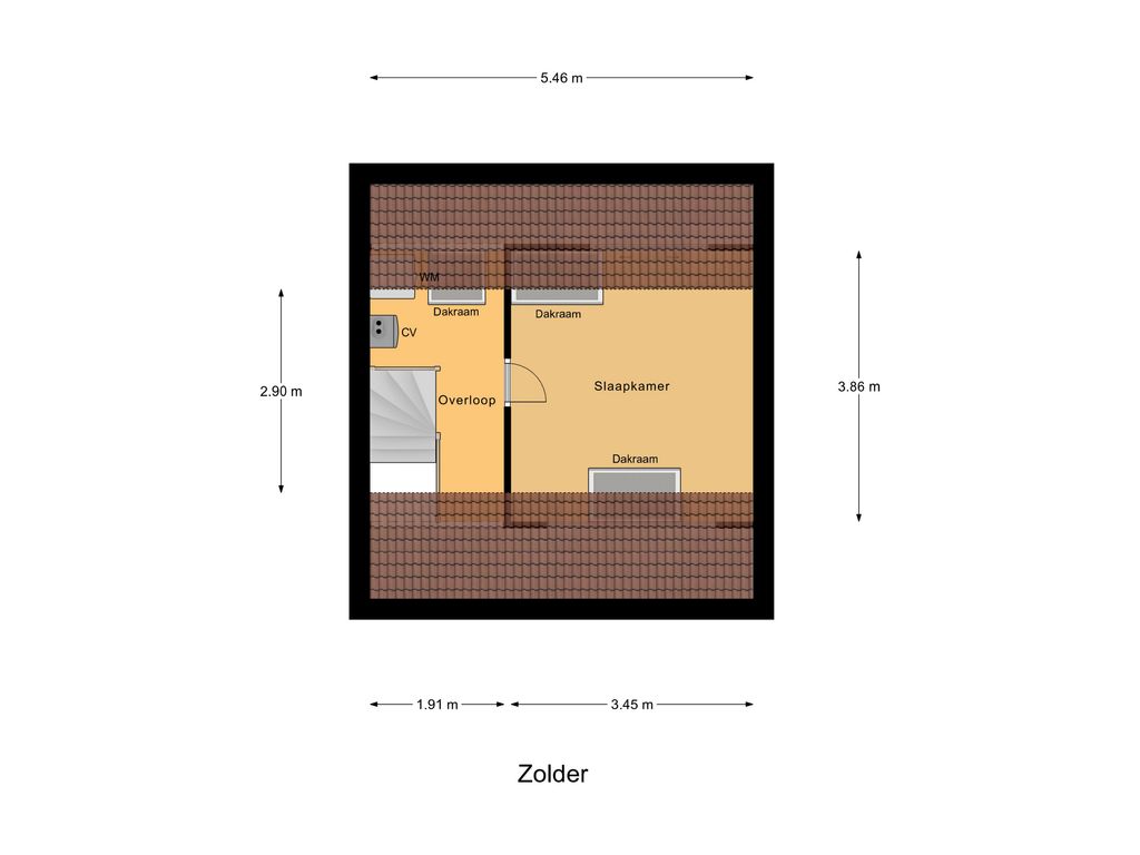 Met de trap loop je naar de tweede verdieping. Op de overloop is bergruimte onder de schuine kap en vind je de aansluitingen voor wasmachine en droger, evenals de cv-installatie (Intergas HRE, 2025). Achter de deur ligt de vierde slaapkamer van ruim 10 m², met zowel een dakraam aan de voor- als achterzijde en extra bergruimte achter de knieschotten.