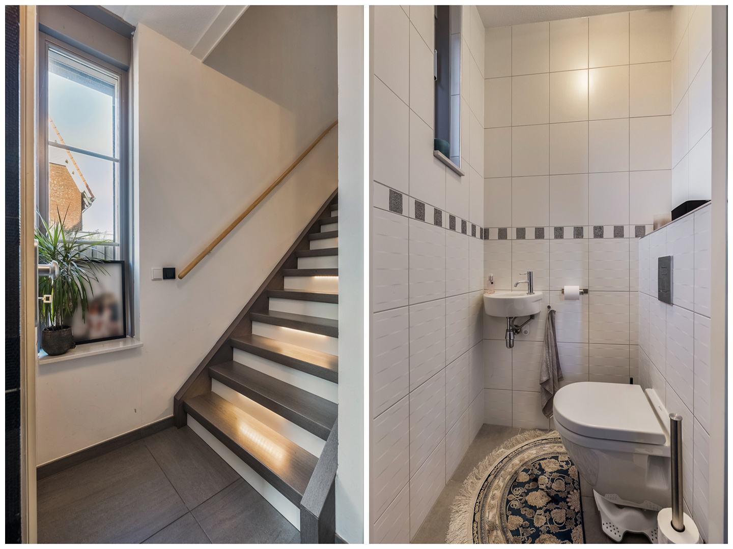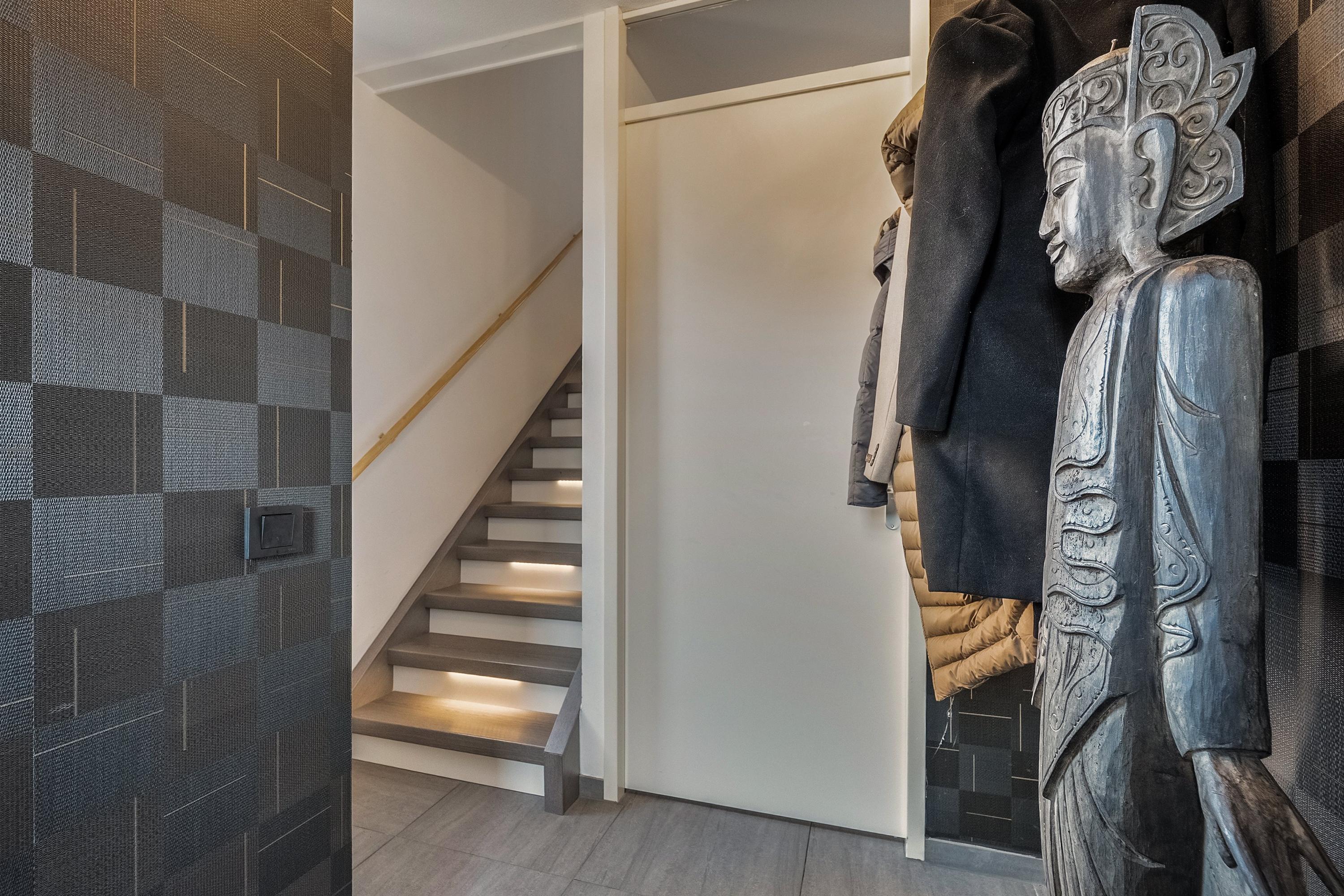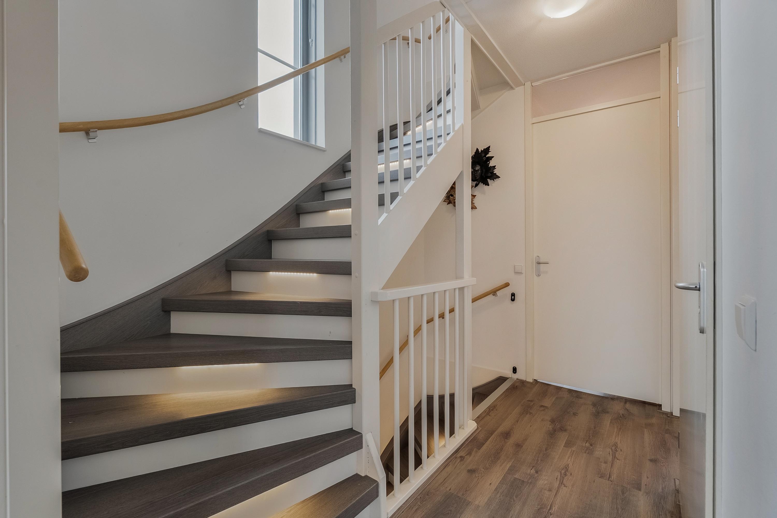Je parkeert op eigen oprit en loopt via de verzorgde voortuin naar de voordeur. De voortuin is ruim van opzet en doordat deze in de middag gunstig op de zon ligt, is dit een fijne plek om buiten te zitten. In de hal vinden we de meterkast, de toiletruimte met hangcloset en de trap naar de eerste verdieping, subtiel voorzien van ledverlichting.