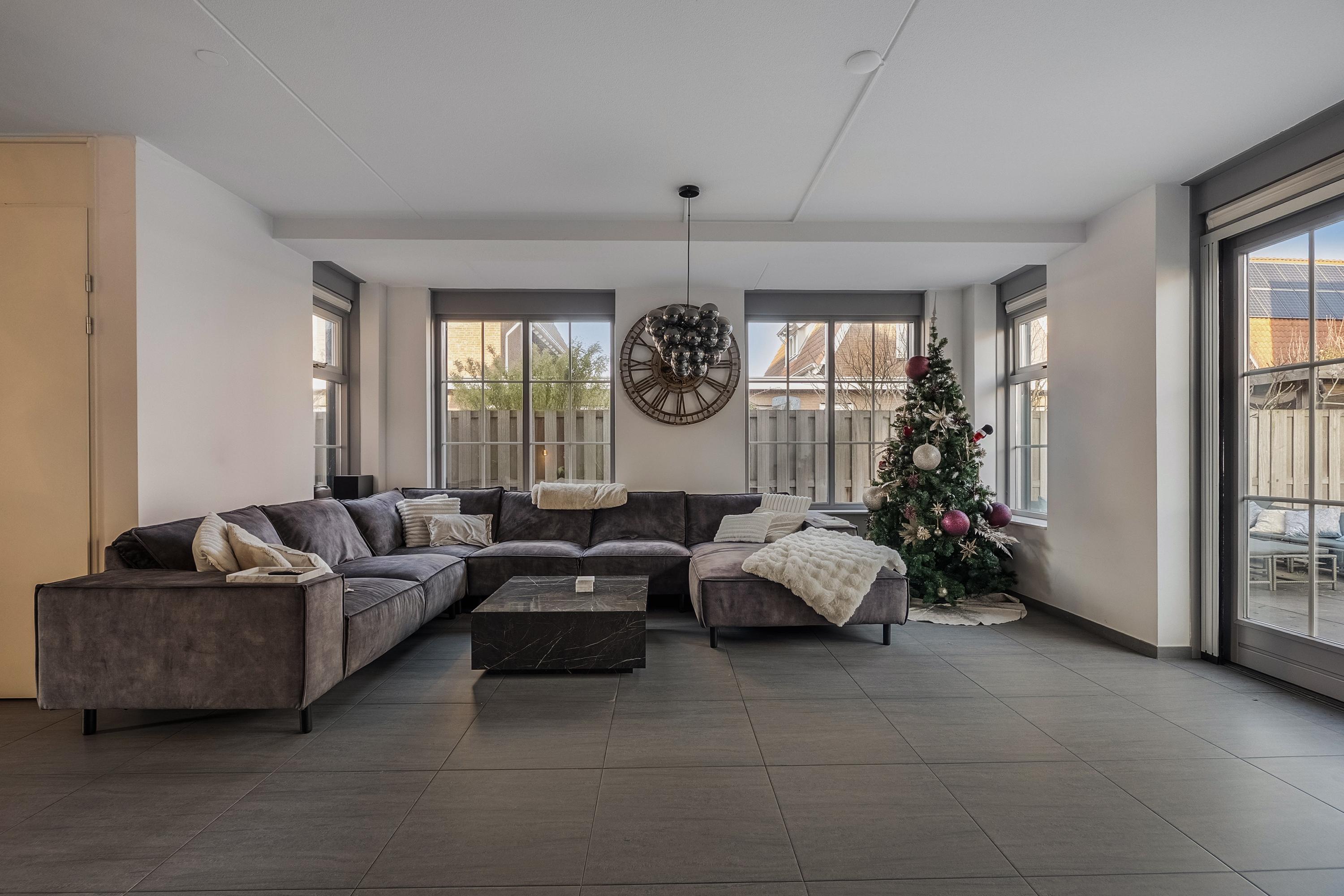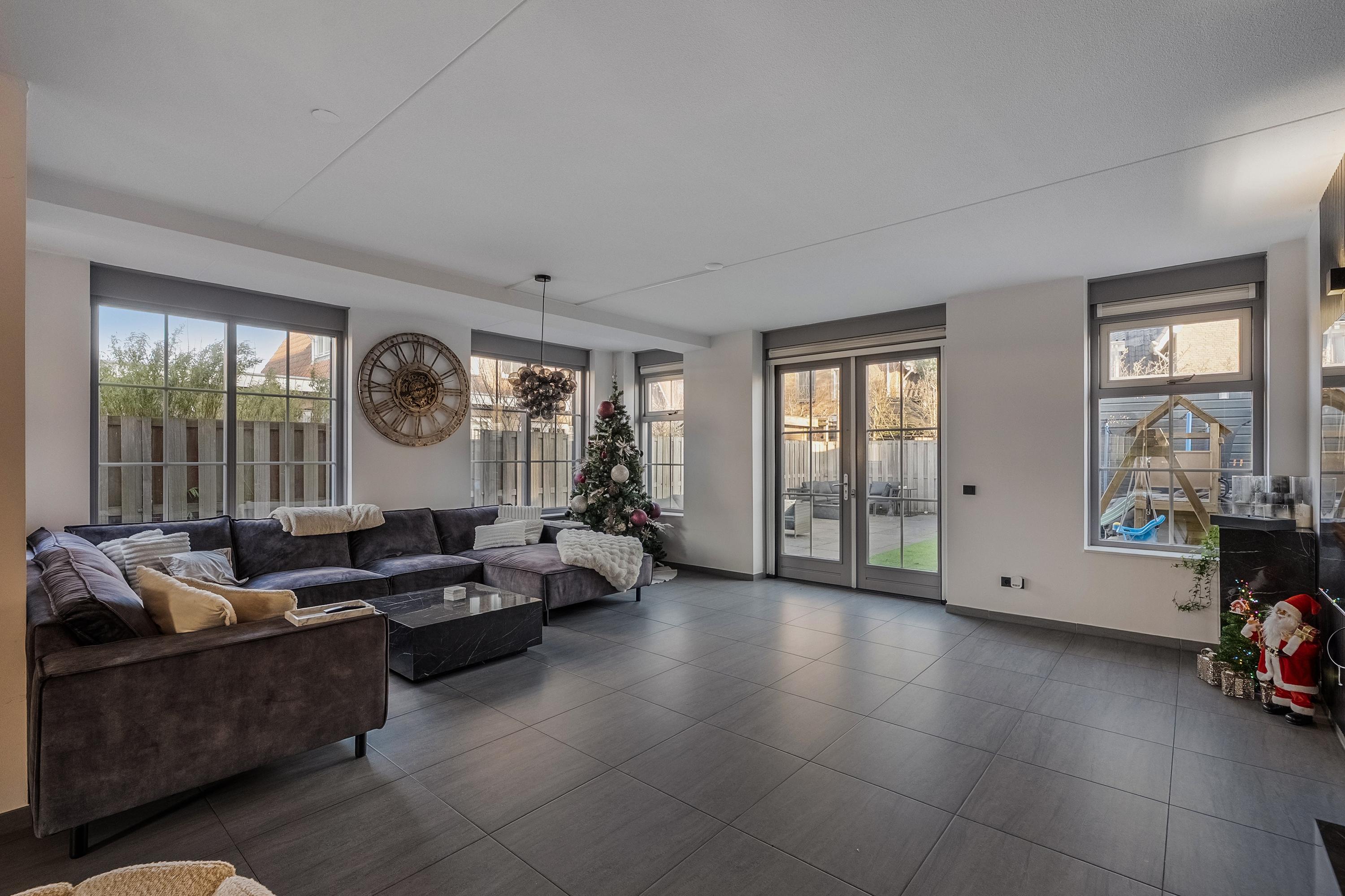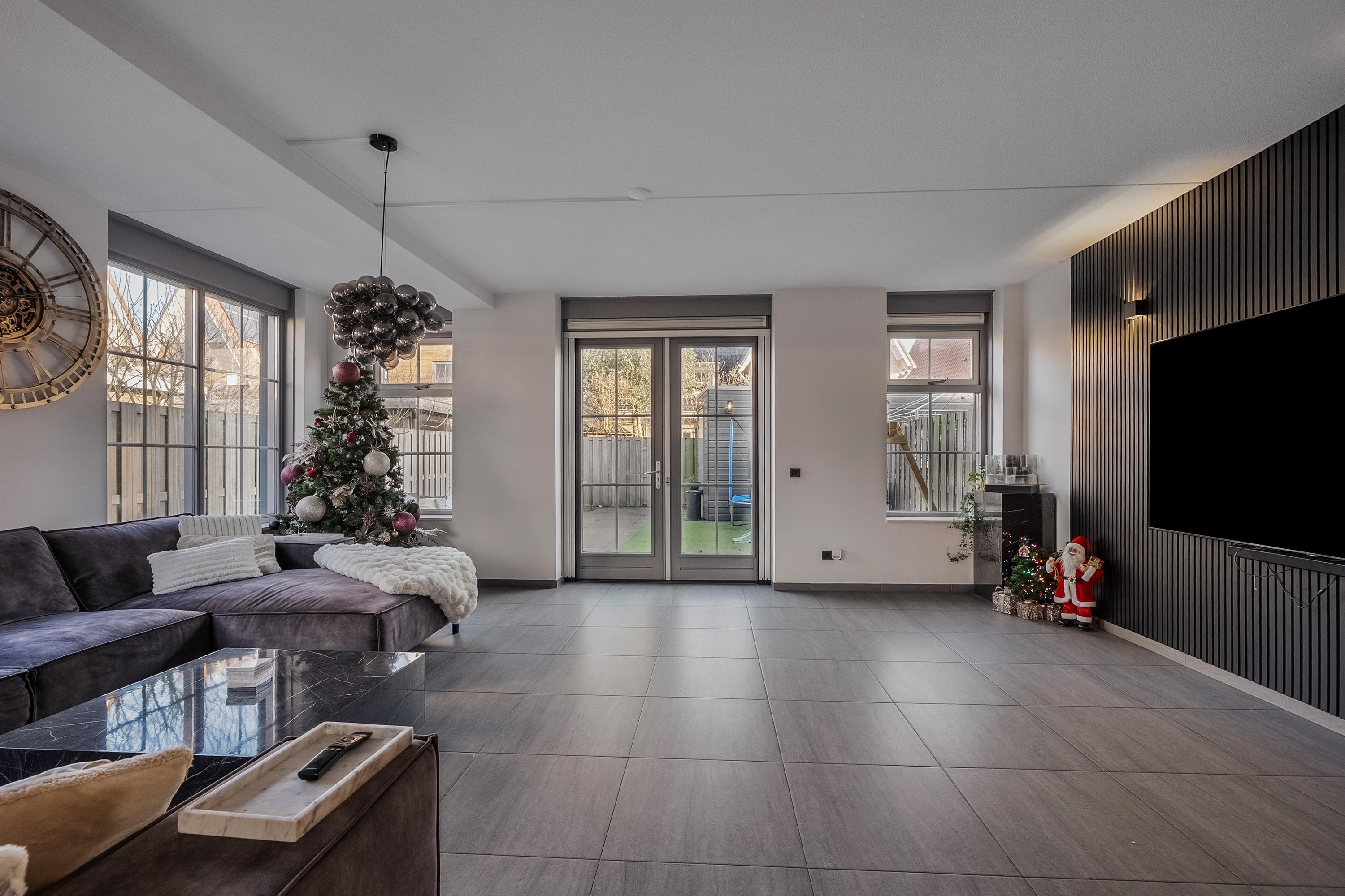 We lopen door naar de woonkamer. Wat direct opvalt, is het licht en de ruimte. Door de uitbouw aan zowel de zij- als achterzijde is hier een royale leefruimte ontstaan. De openslaande deuren verbinden de woonkamer prettig met de tuin.