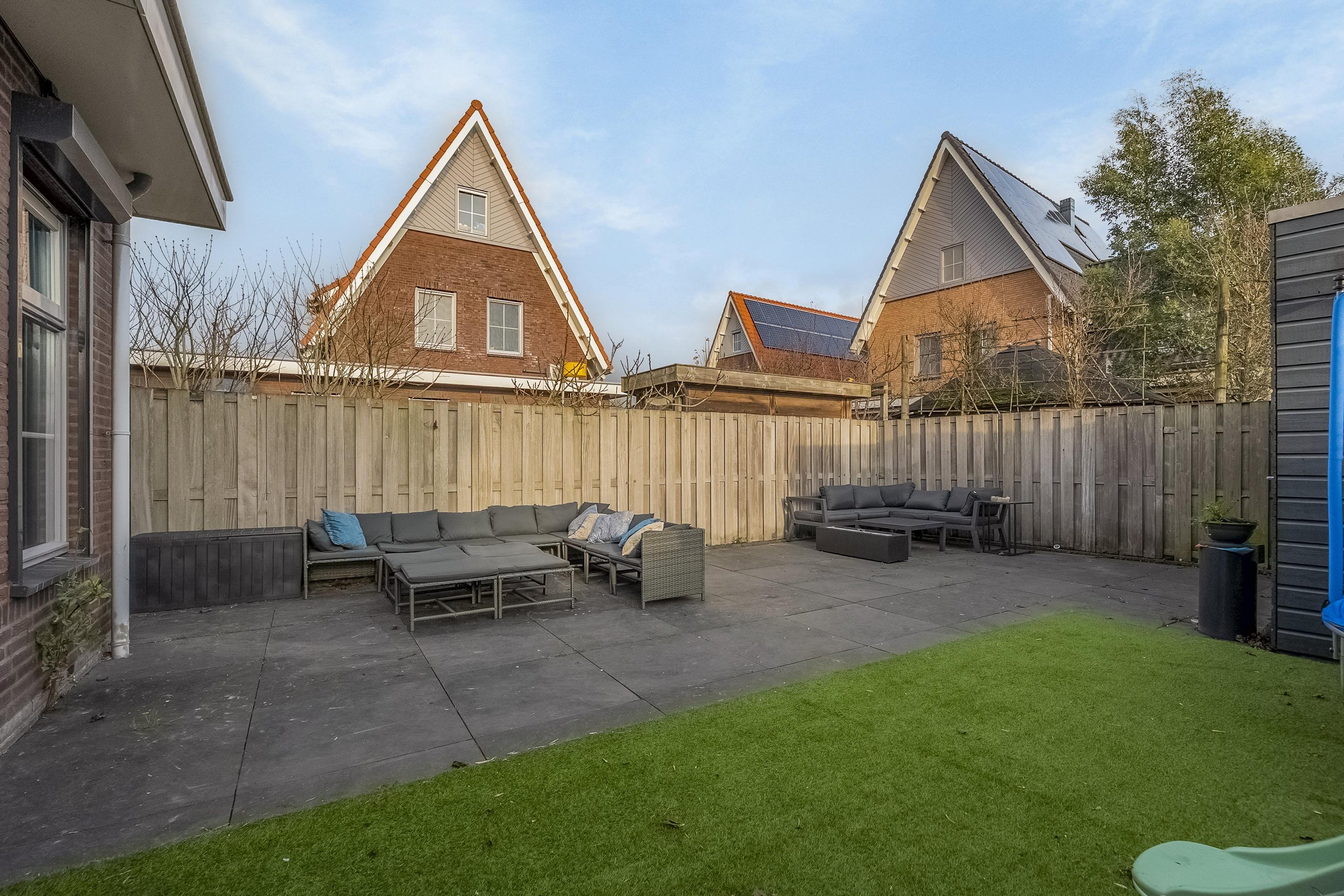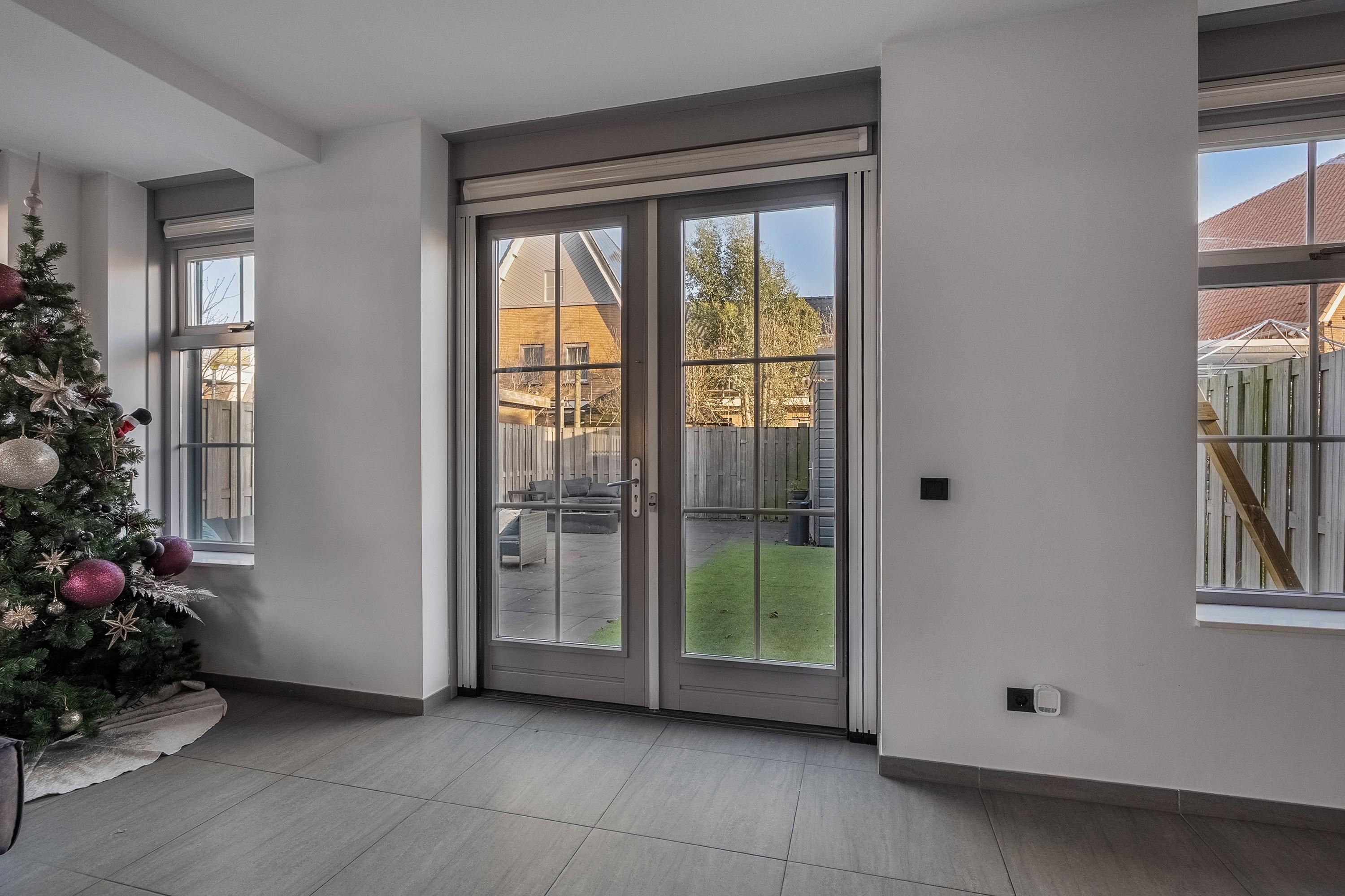 Via deze deuren stappen we de achtertuin in. De tuin is fraai aangelegd, onderhoudsarm en gelegen op het zuidoosten. De grote keramische tegels van 81 x 81 cm geven de tuin een rustige en verzorgde uitstraling. Een fijne plek om buiten te zitten, zonder veel onderhoud. Fietsen, tuinspullen en kussens berg je op in de schuur, die zowel via het zijpad als via de achterom bereikbaar is.