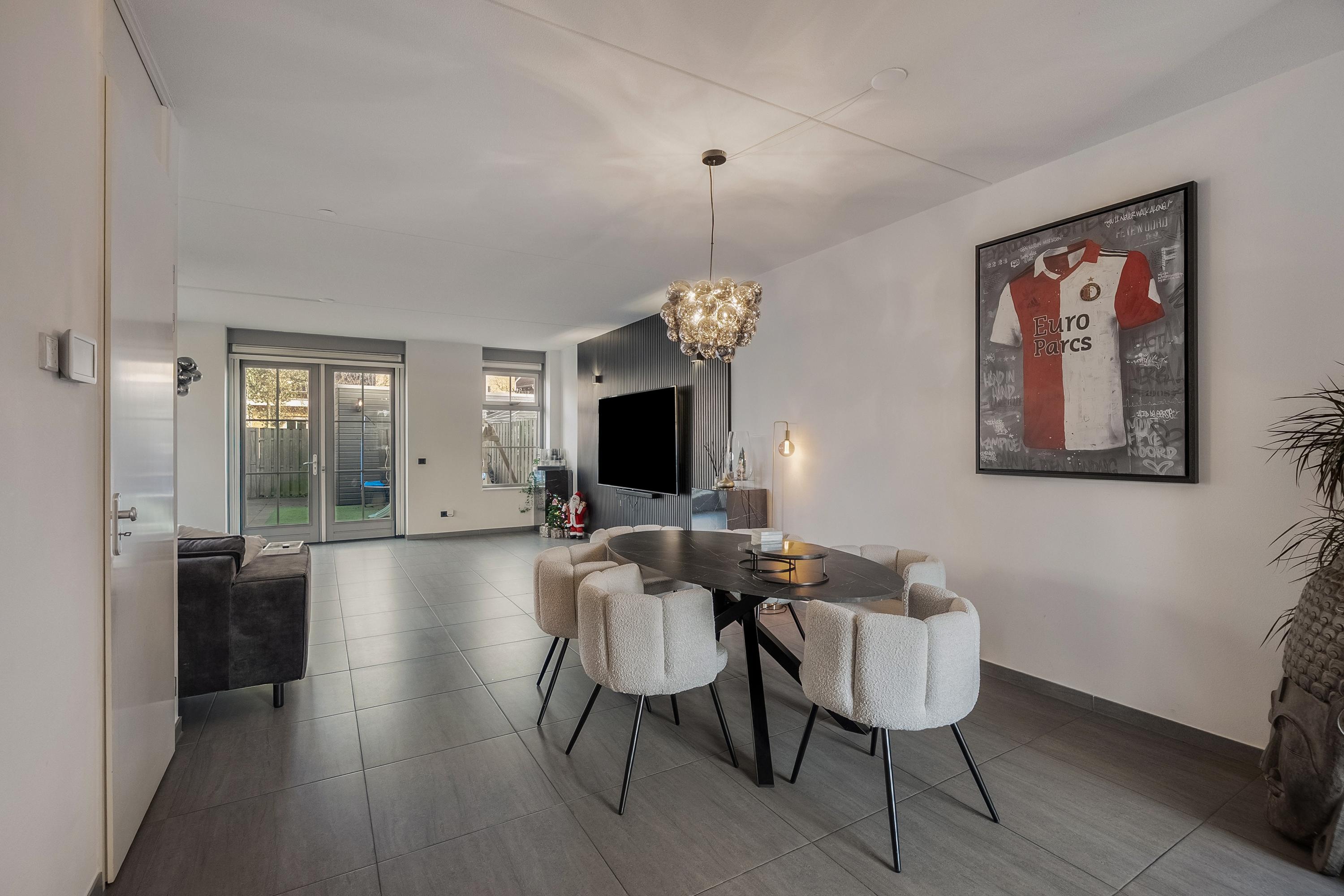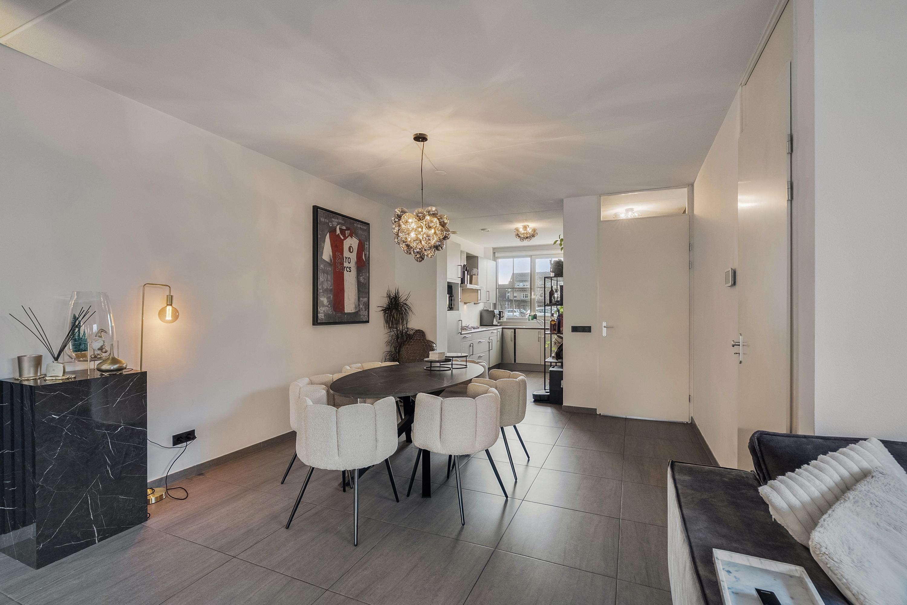 De gehele begane grond is voorzien van een lichte plavuizen vloer met vloerverwarming. Wanden en plafonds zijn strak gestukt en de praktische trapkast zorgt voor extra opbergruimte.