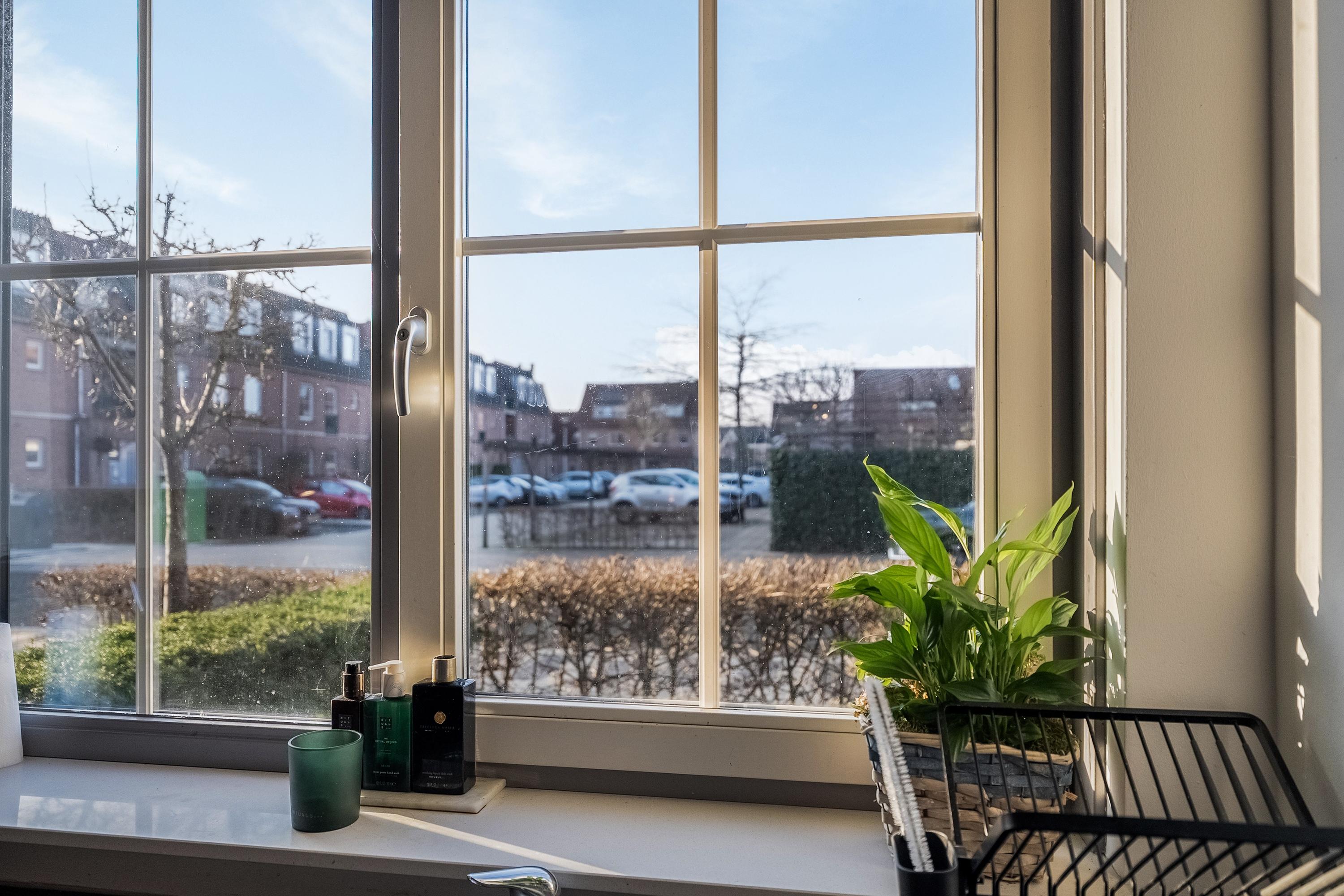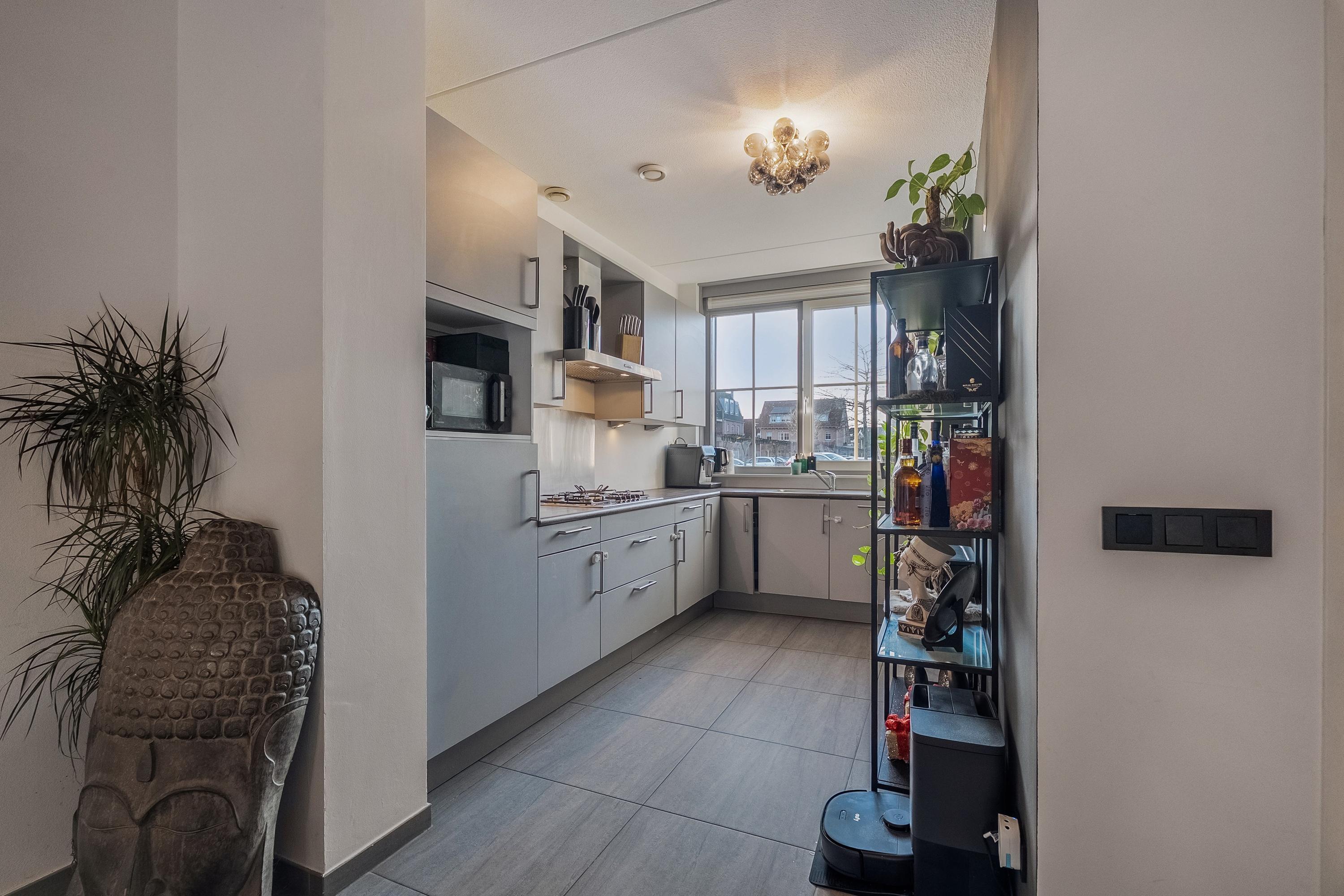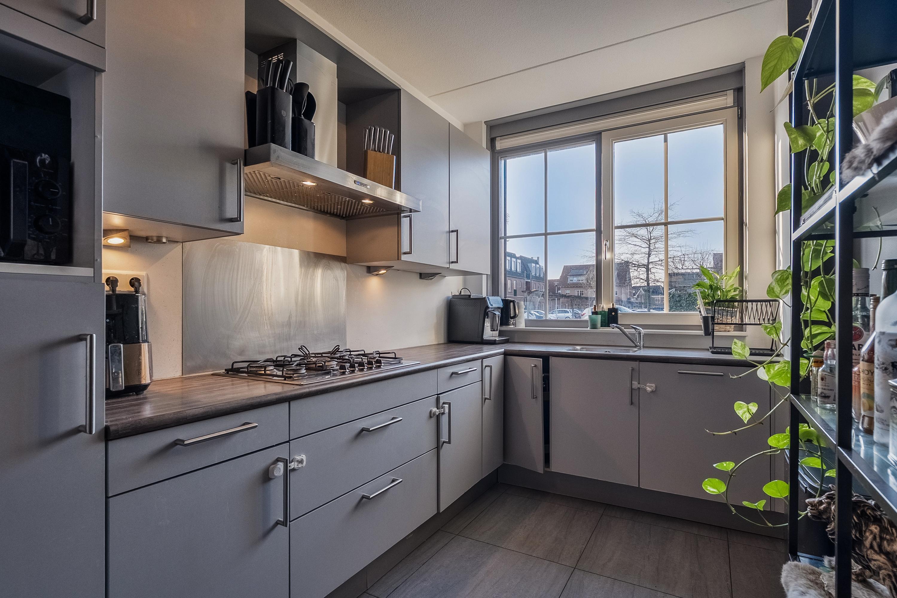 Aan de voorzijde van de woning bevindt zich de open keuken. Deze is uitgevoerd in een L-opstelling onder het raam en afgewerkt in een rustige wit-grijze kleurstelling met een houtkleurig werkblad. De keuken beschikt over diverse inbouwapparatuur, waaronder een koelkast, vaatwasser, 5-pits gaskookplaat, afzuigkap, combi-oven en een Miele stoomoven. Een prettige, lichte keuken waar alles logisch is ingedeeld en waar je door het raam vrij wegkijkt over de straat.