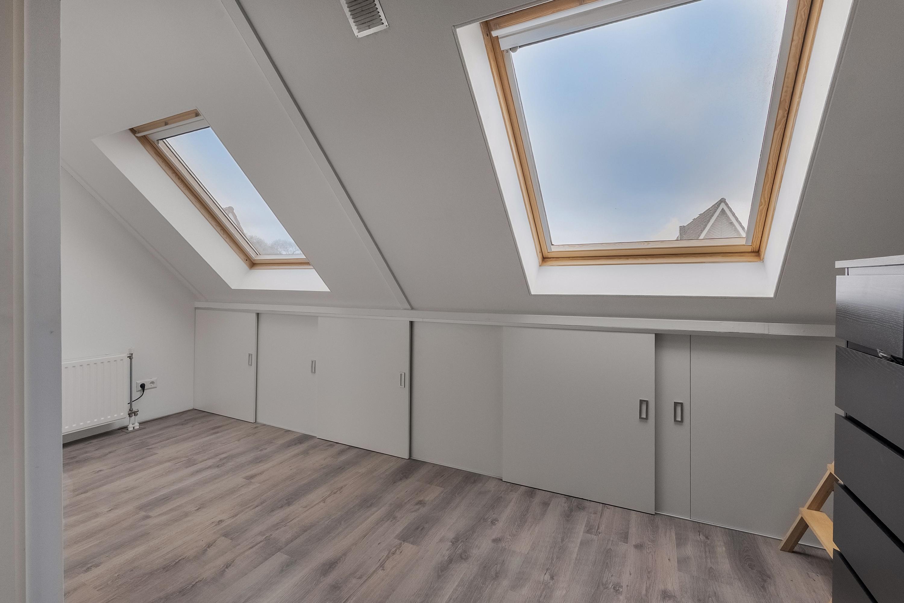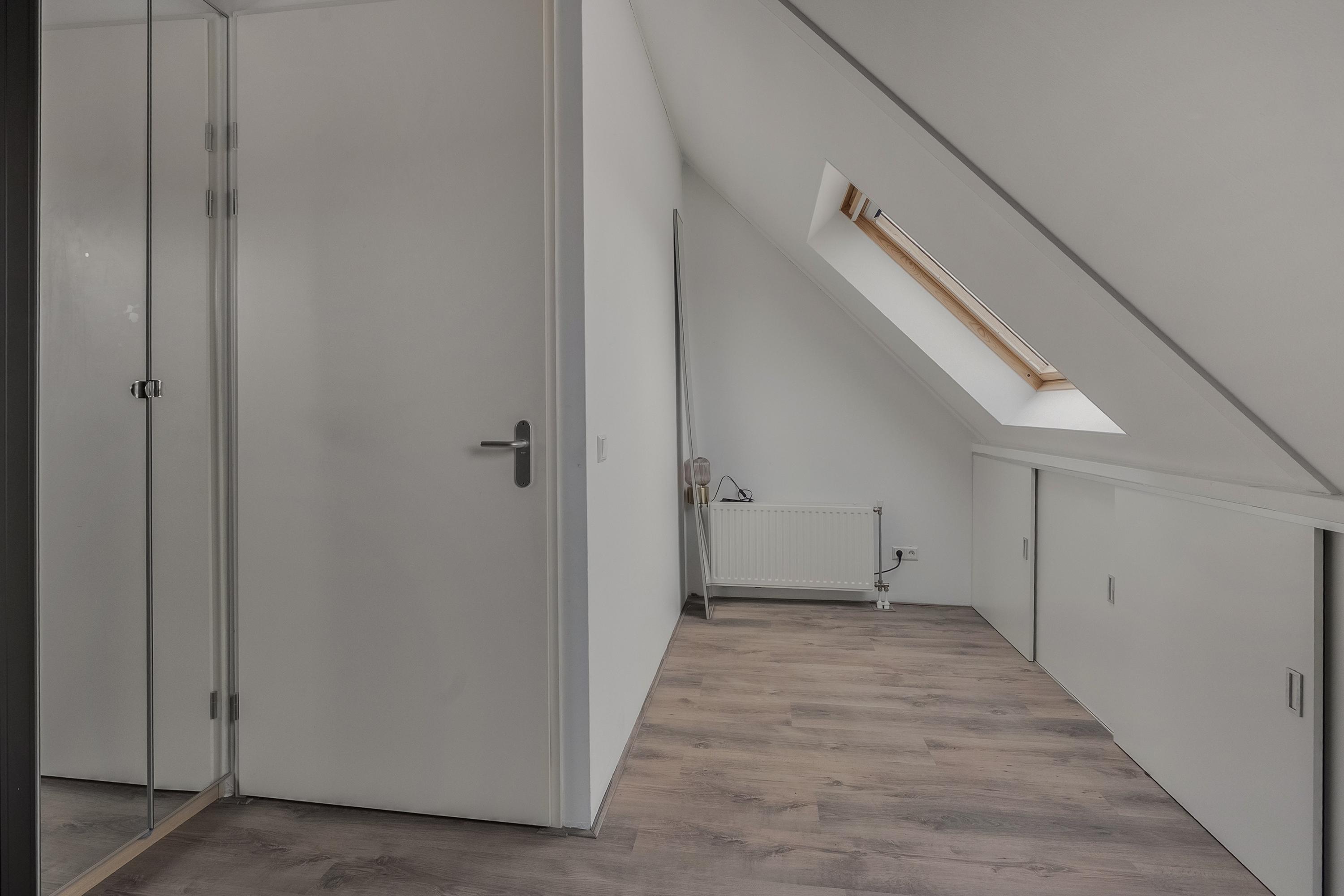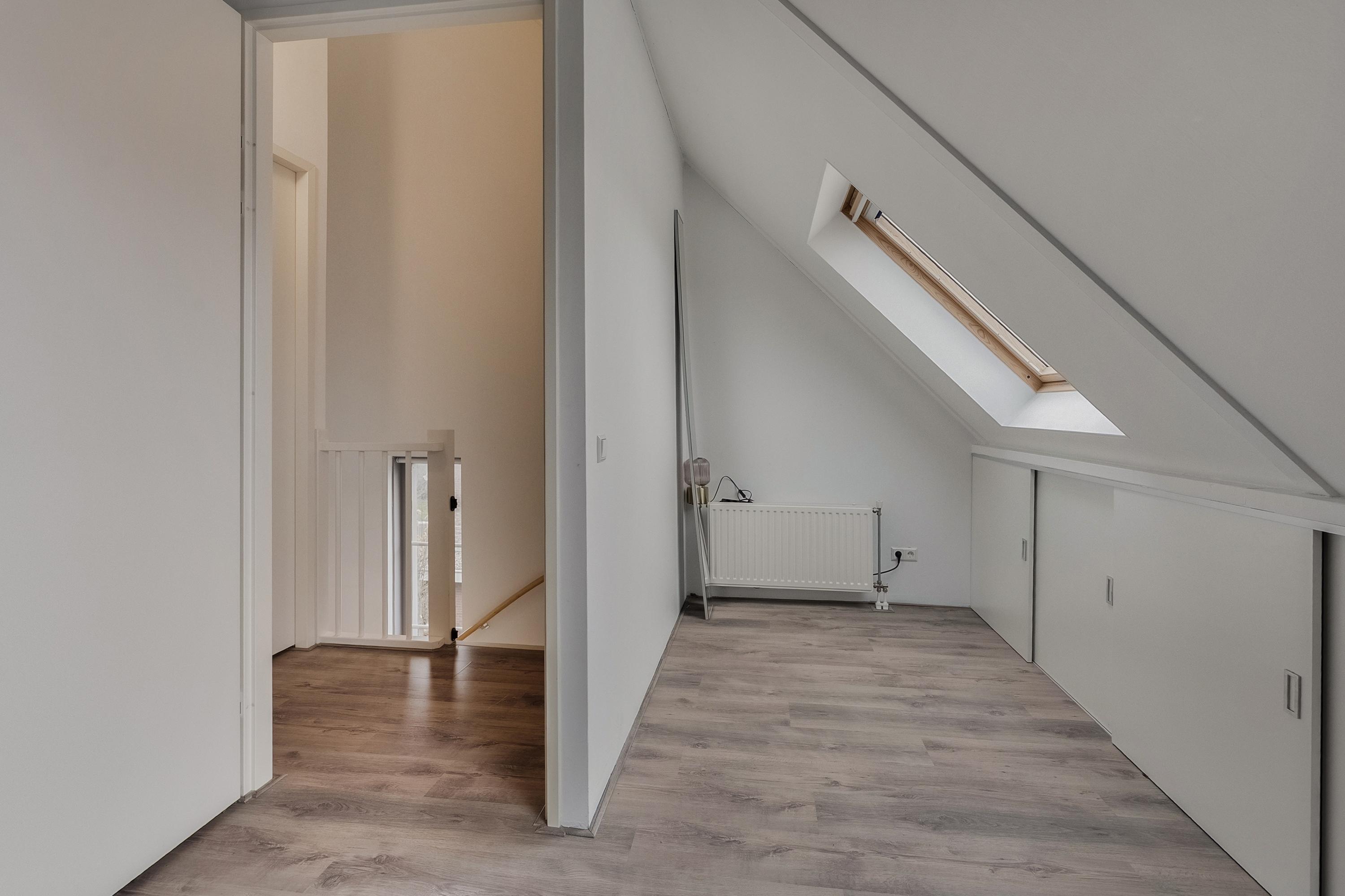 Via de vaste trap komen we op de tweede verdieping. Aan de achterzijde bevindt zich slaapkamer vier, voorzien van twee Velux dakramen die zorgen voor prettig daglicht.