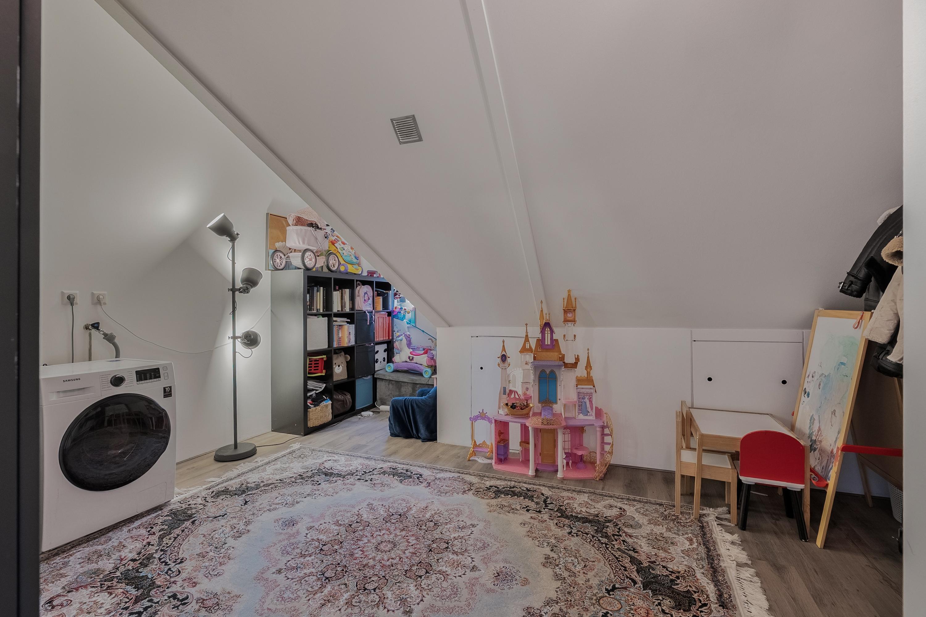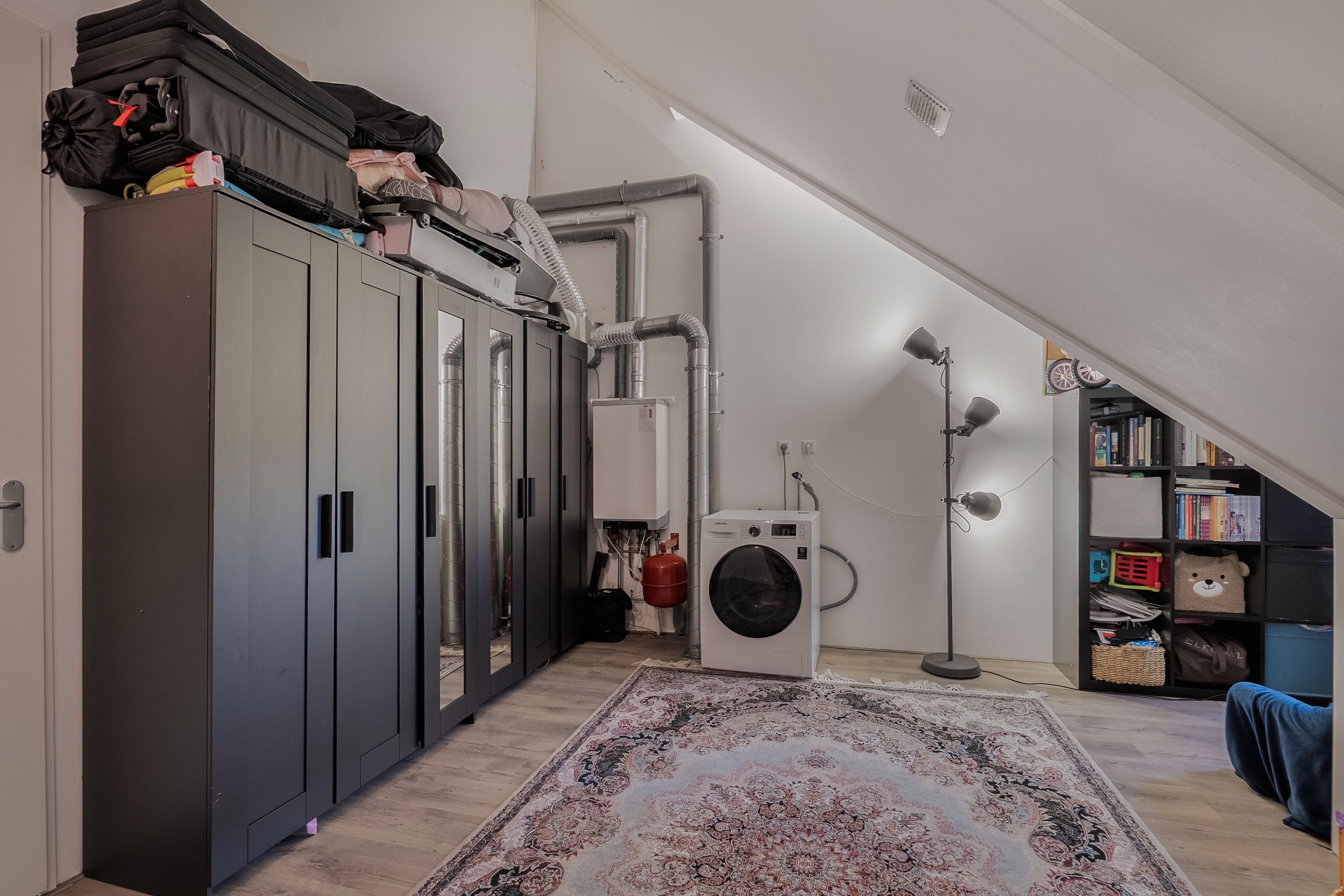 Aan de voorzijde ligt de was-/stookruimte. Deze is praktisch ingericht met aansluitingen voor wasmachine en droger en de opstelplaats van de CV-ketel (2009). Deze ruimte biedt bovendien de mogelijkheid om een vijfde slaapkamer te realiseren of, zoals nu, te gebruiken als speelkamer voor de kinderen.
