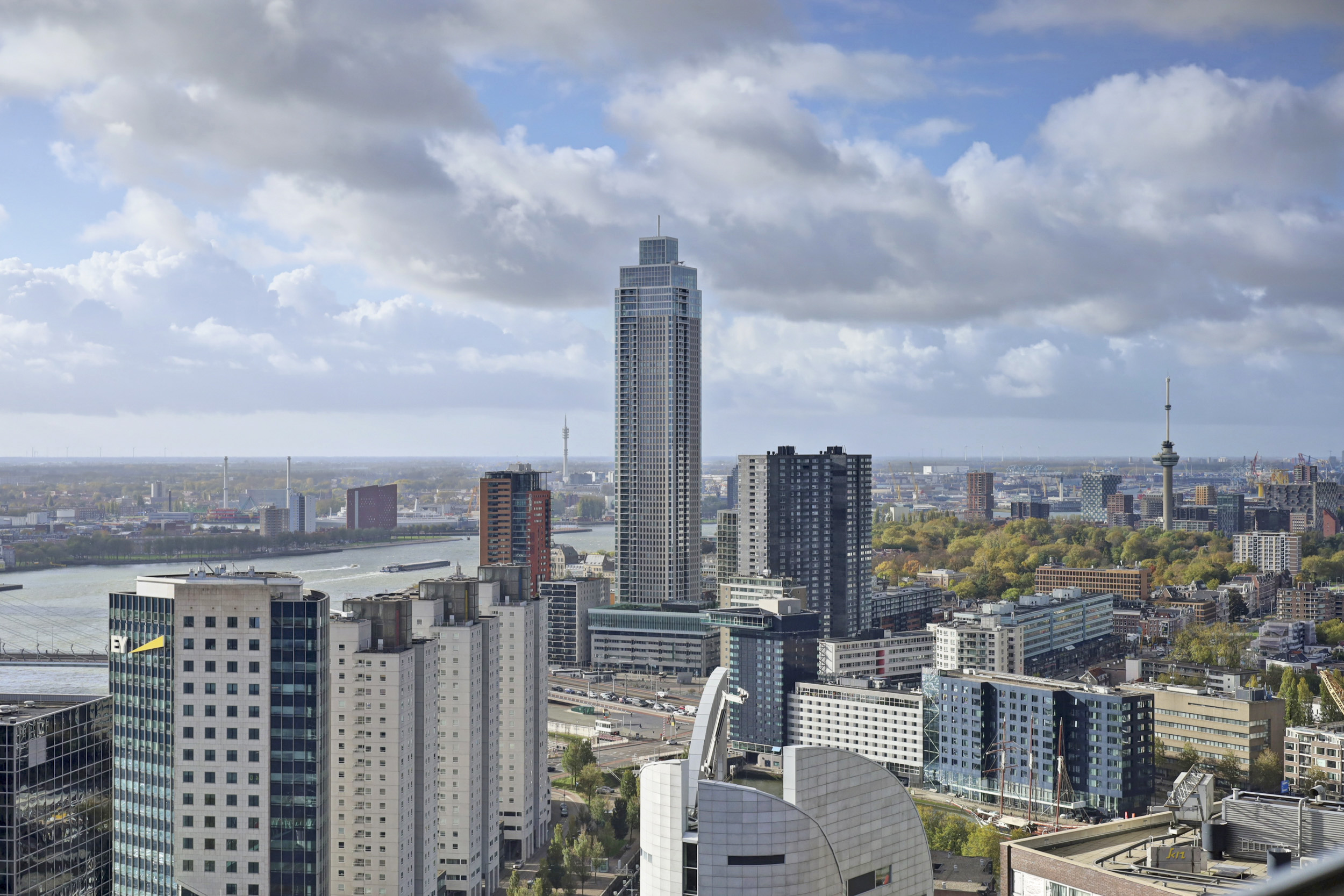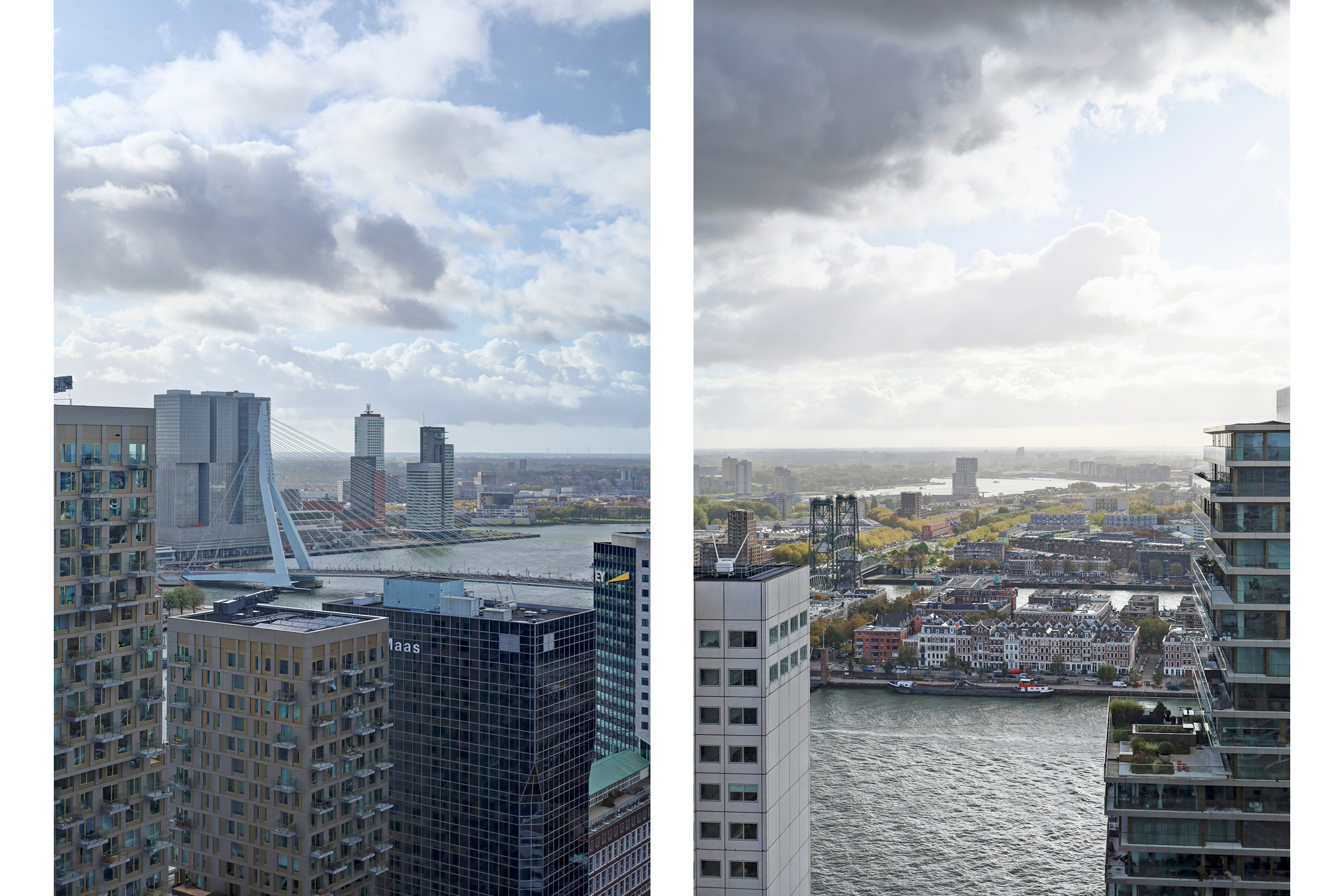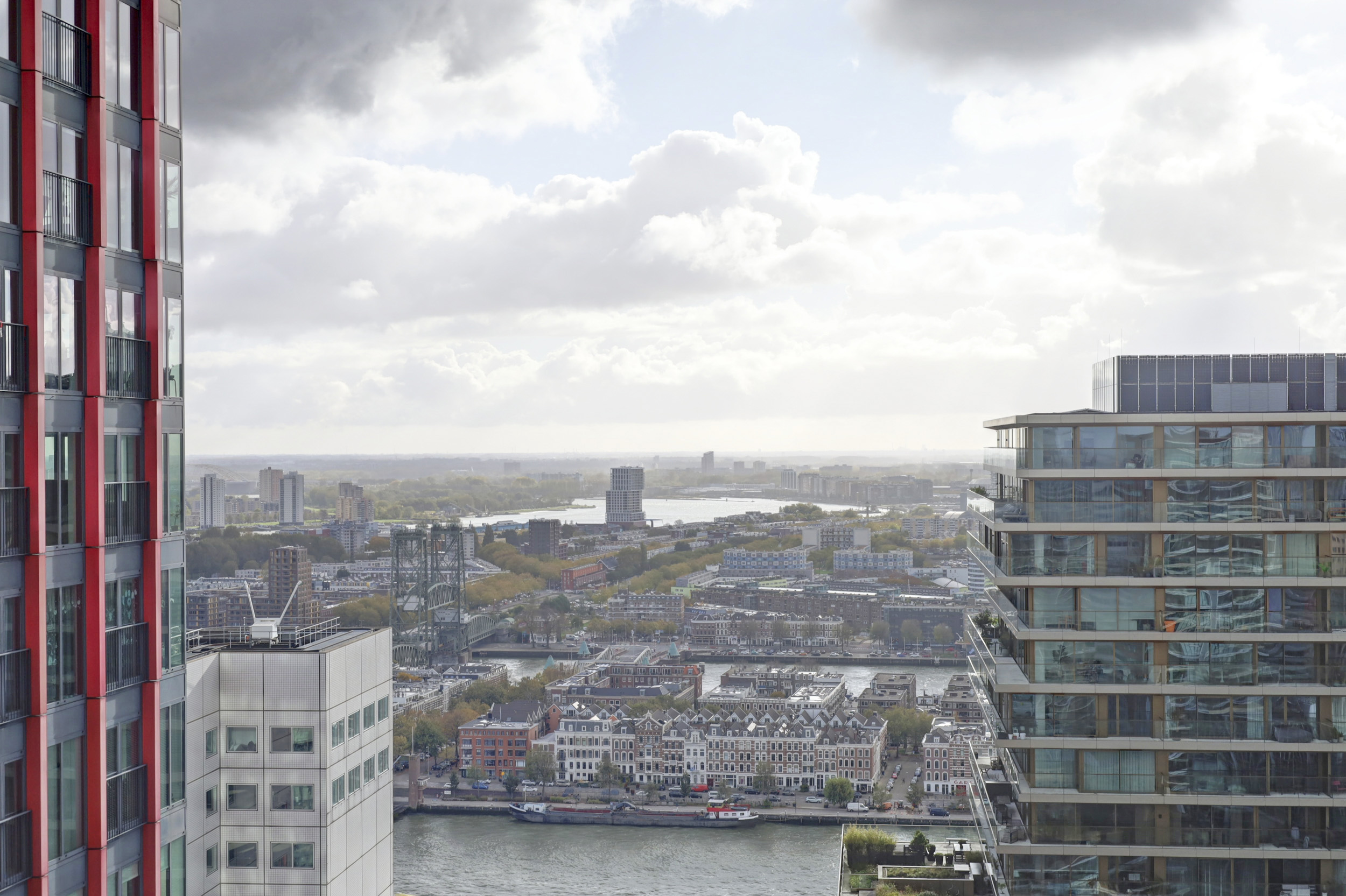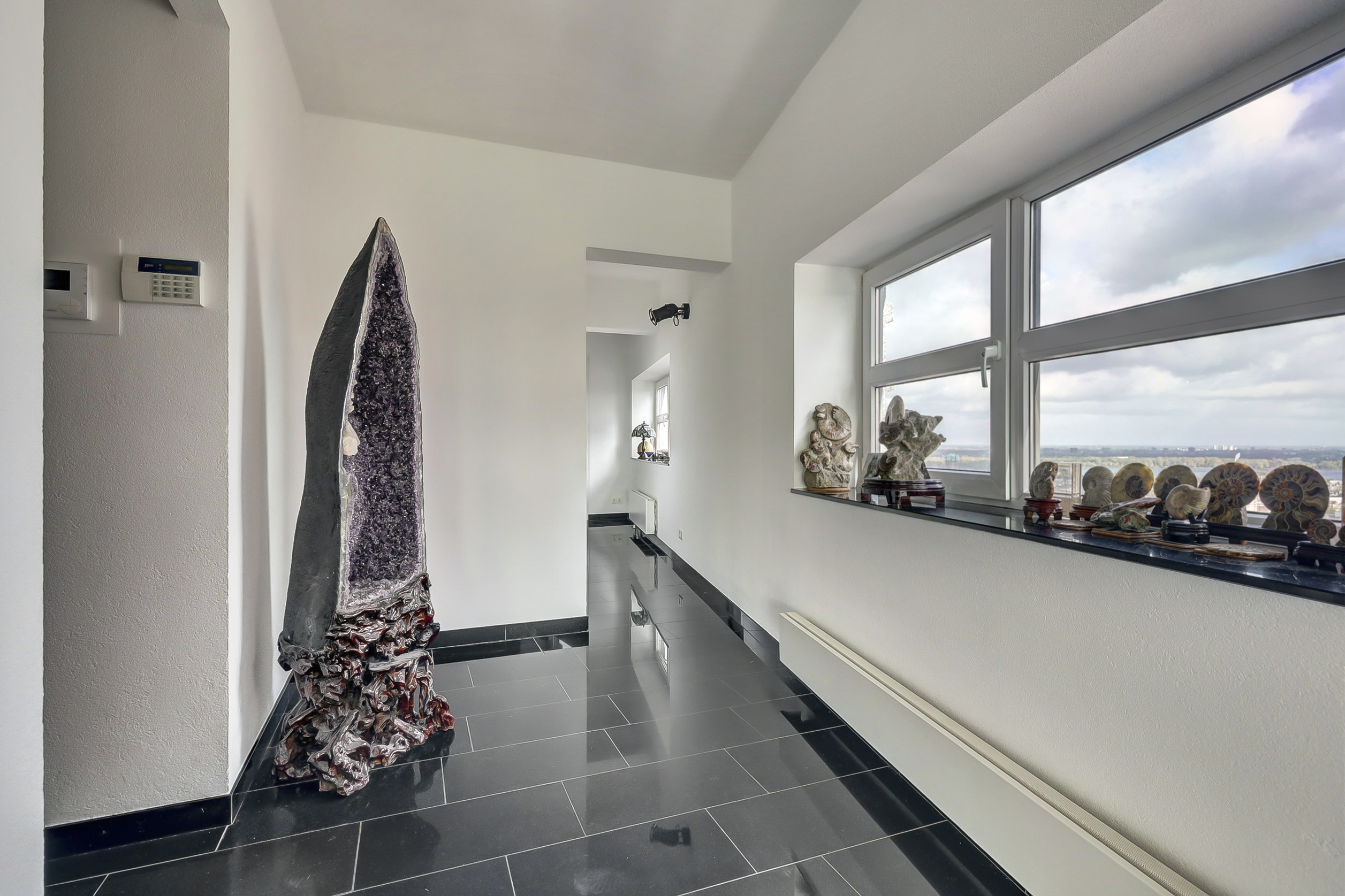 The Apartment On the ground floor, you pass by the mailboxes to enter the central hall where the two elevators are located. On the 36th floor, you step out of the elevator and walk to the left toward your own front door. Behind the door, you enter the hallway with a spacious wardrobe, the meter cupboard, and the toilet. From the hallway, you are immediately treated to stunning views of East Rotterdam. Rotterdam, you are truly beautiful! You can see the city center and Kralingen with a view over Kralingse Plas—magnificent!