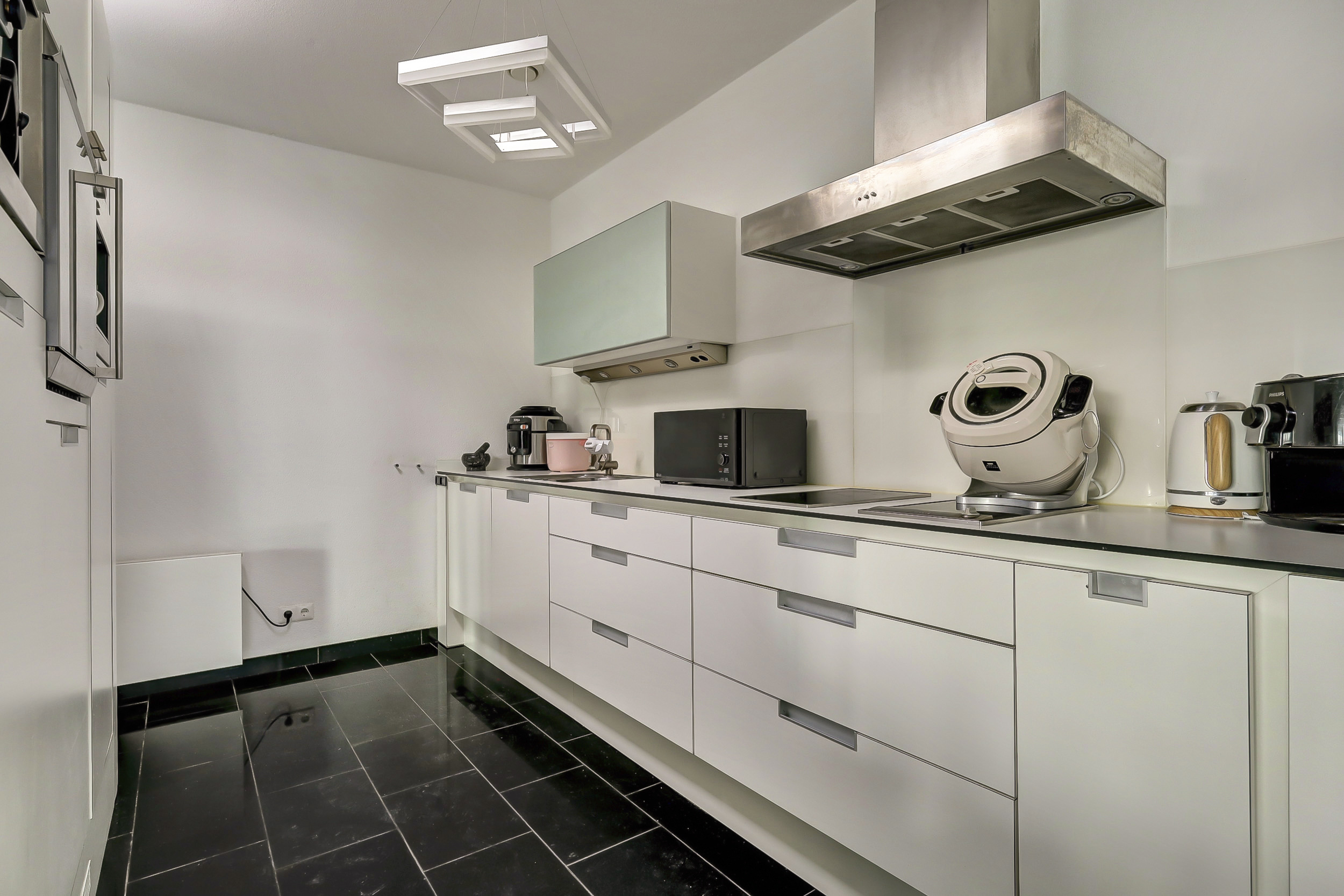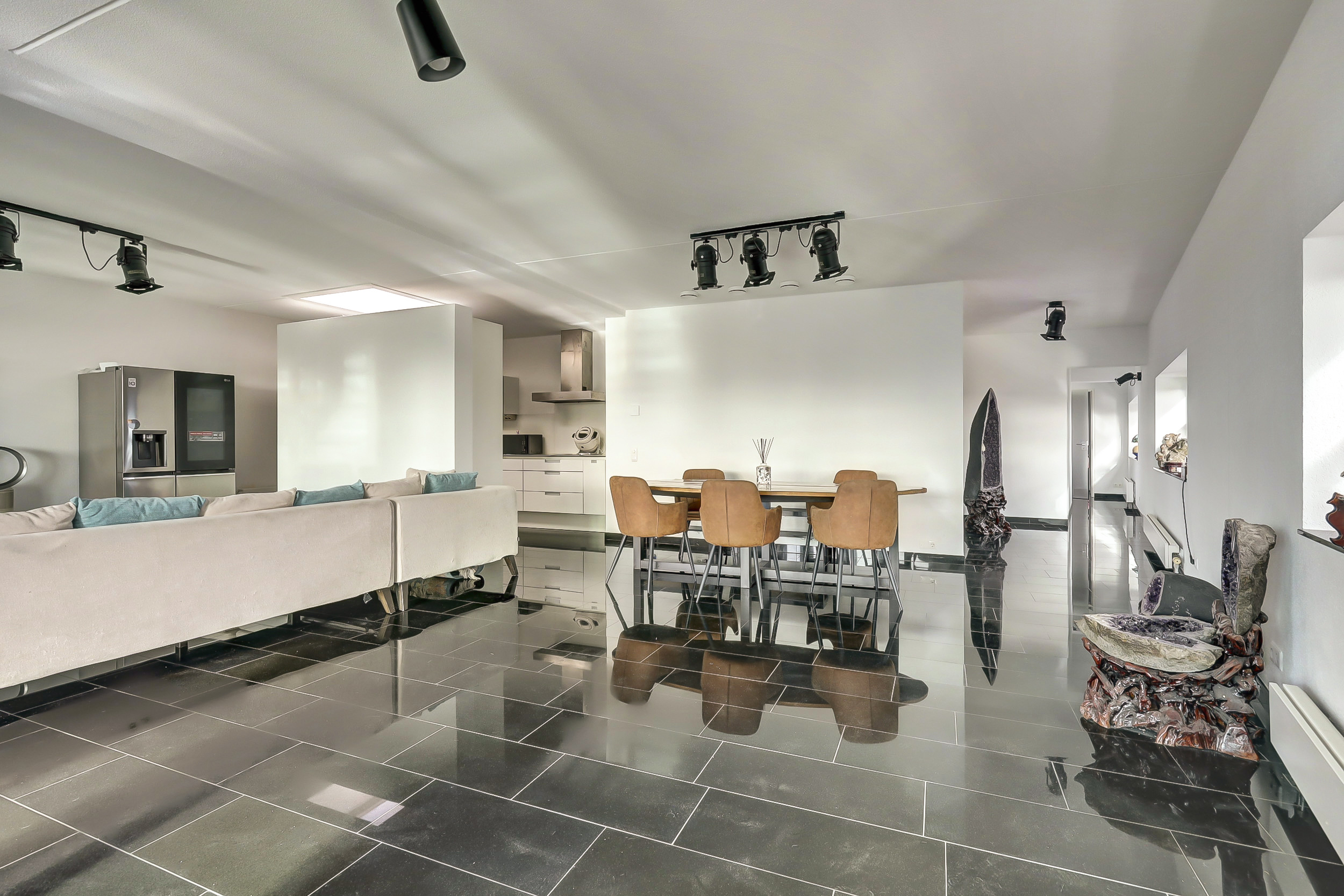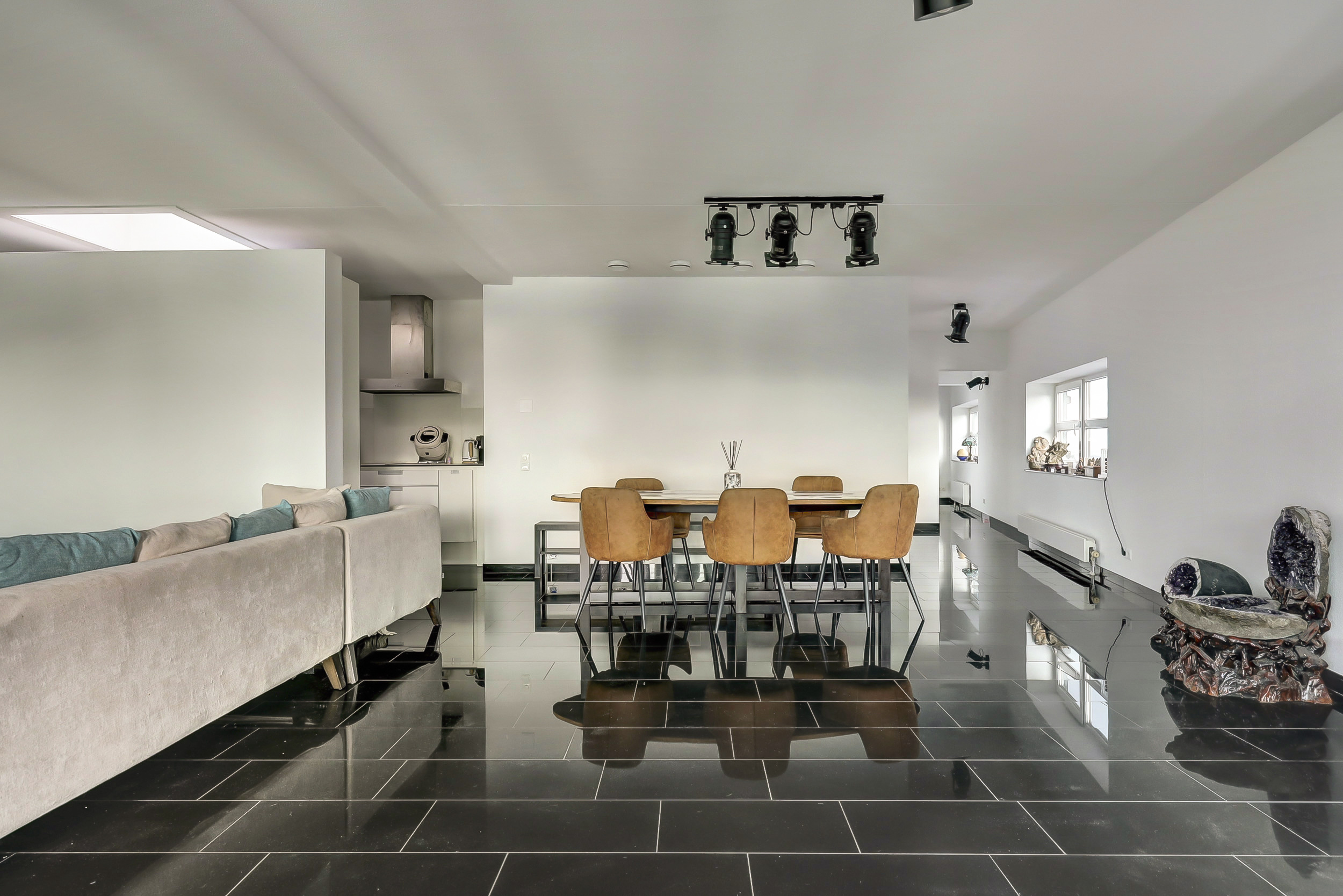 De woonkamer is heerlijk ruim en op dit moment ingedeeld in een ruime eethoek en een gezellige zithoek. De woonkamer beschikt over een luxe en compleet ingerichte open keuken.