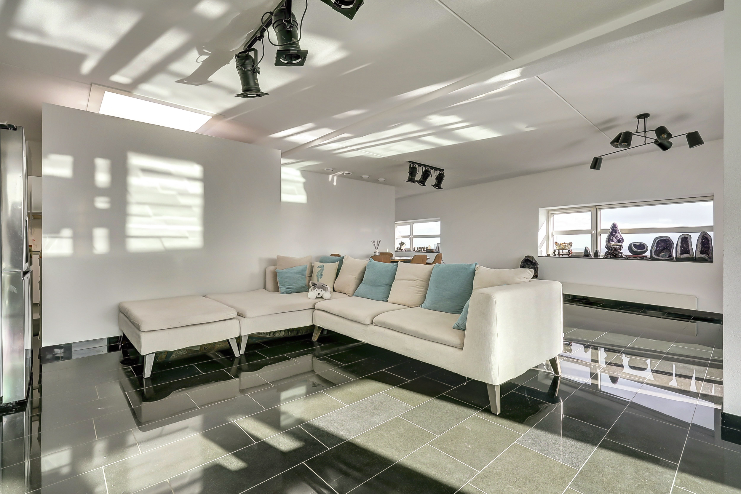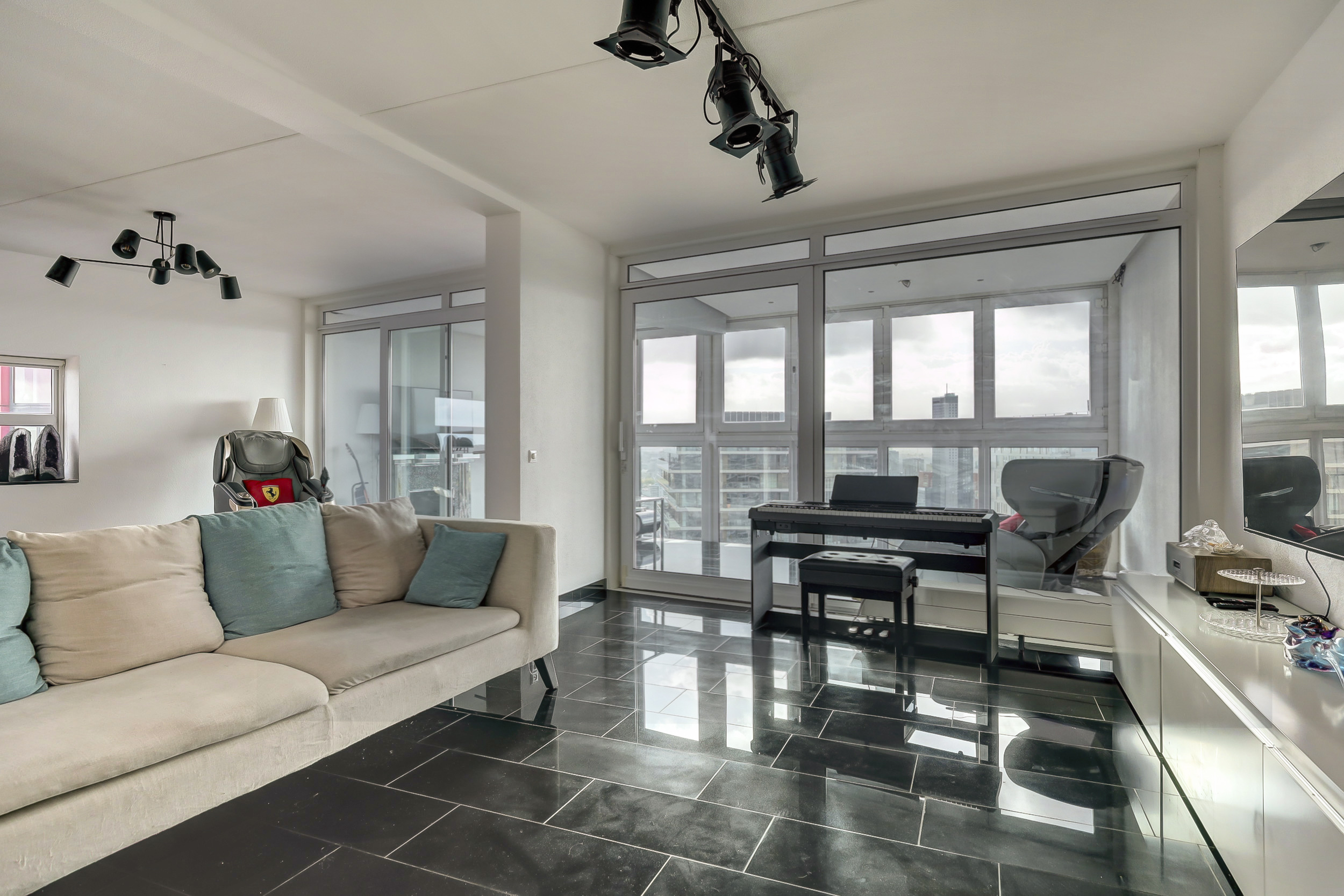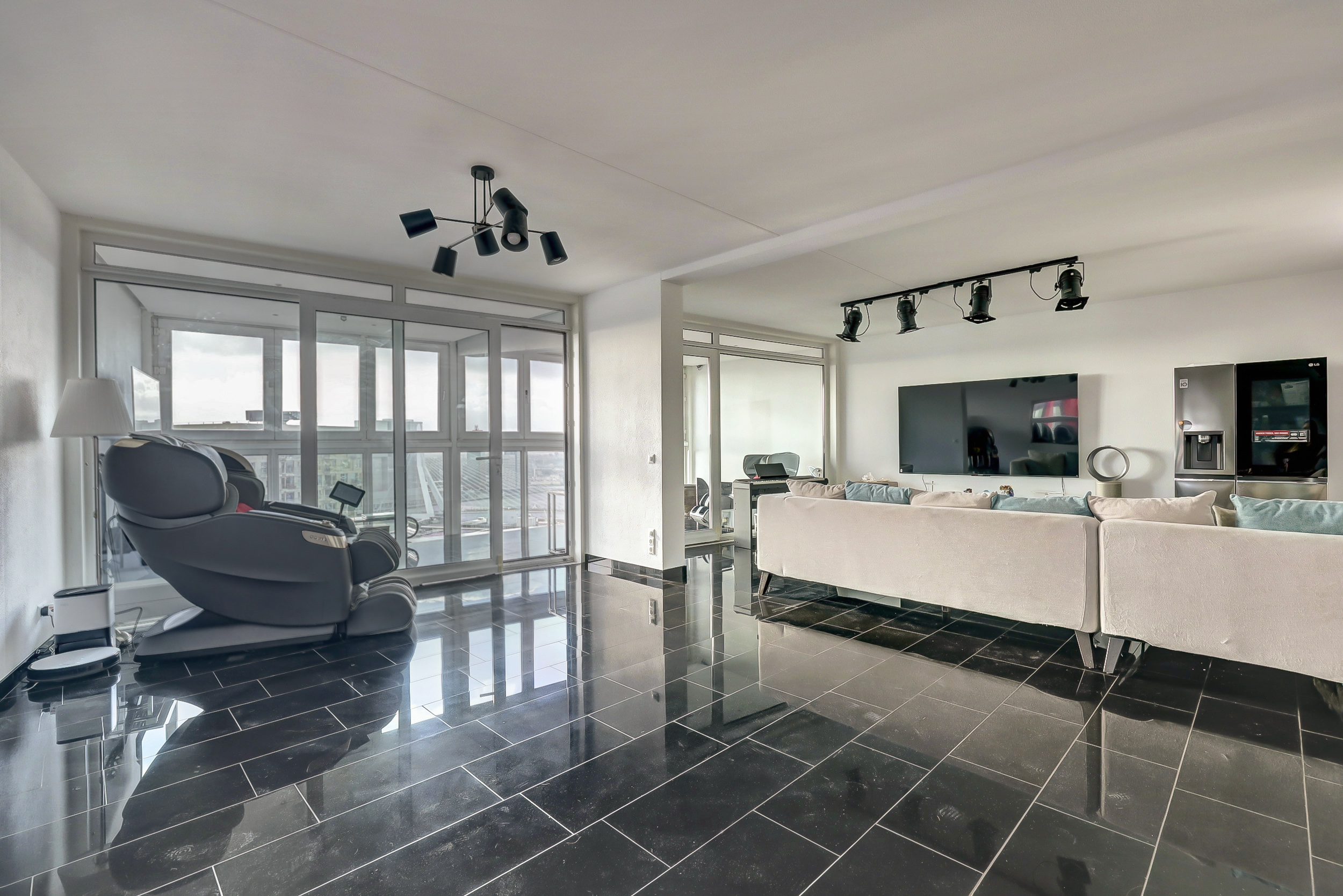 To the right, you enter the living room of over 85 m². The black tiled floor creates a stunning reflection of the constantly changing skies outside! This naturally draws you to the loggia, where the windows stretch from floor to ceiling. It offers you a wide, beautiful view that you can gaze at for hours. In the loggia, there is both a relaxation area and a workspace. The windows are equipped with heat-resistant film, making this one of the best workspaces in Rotterdam, even in the height of summer. It feels almost cinematic!