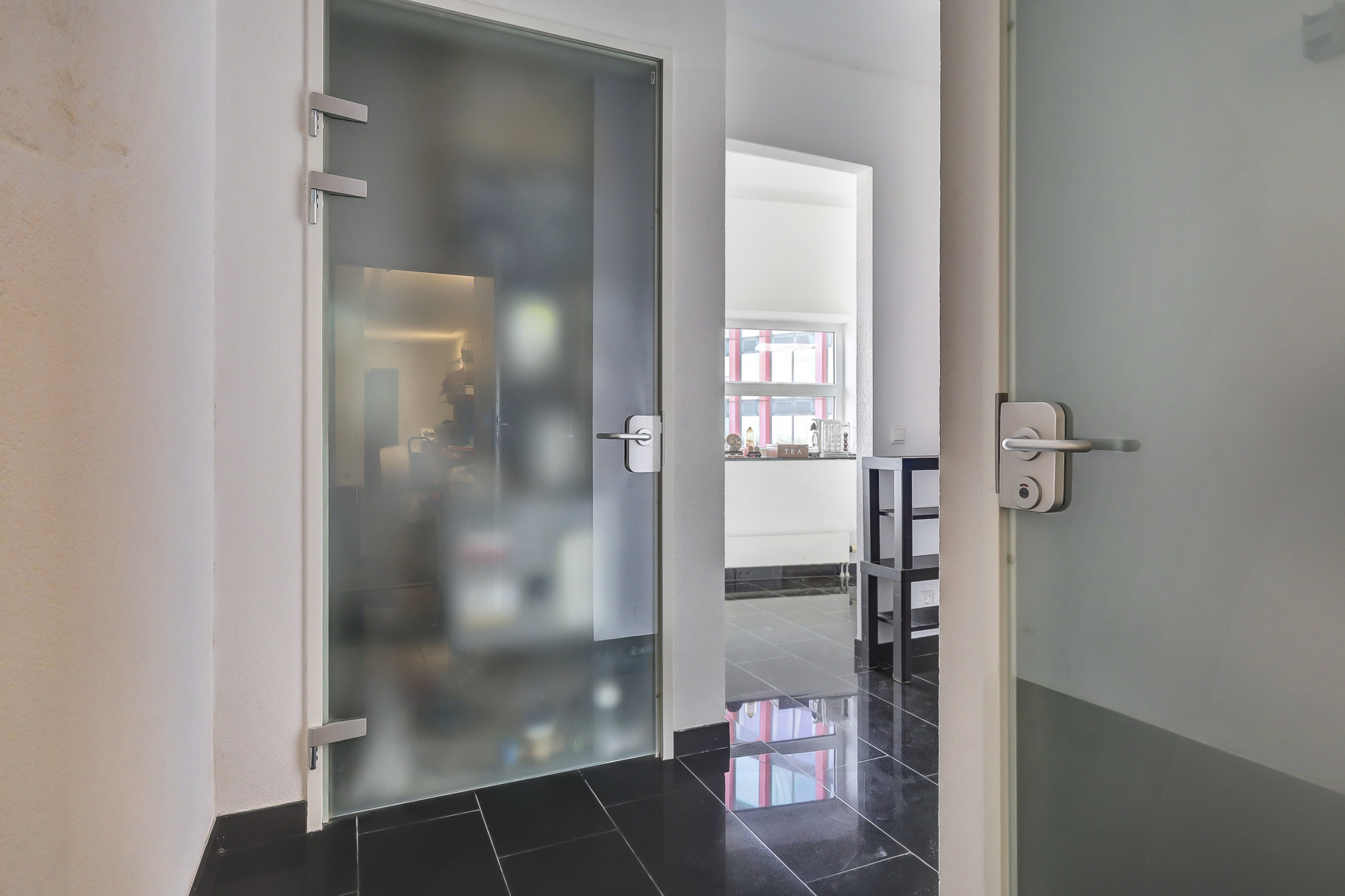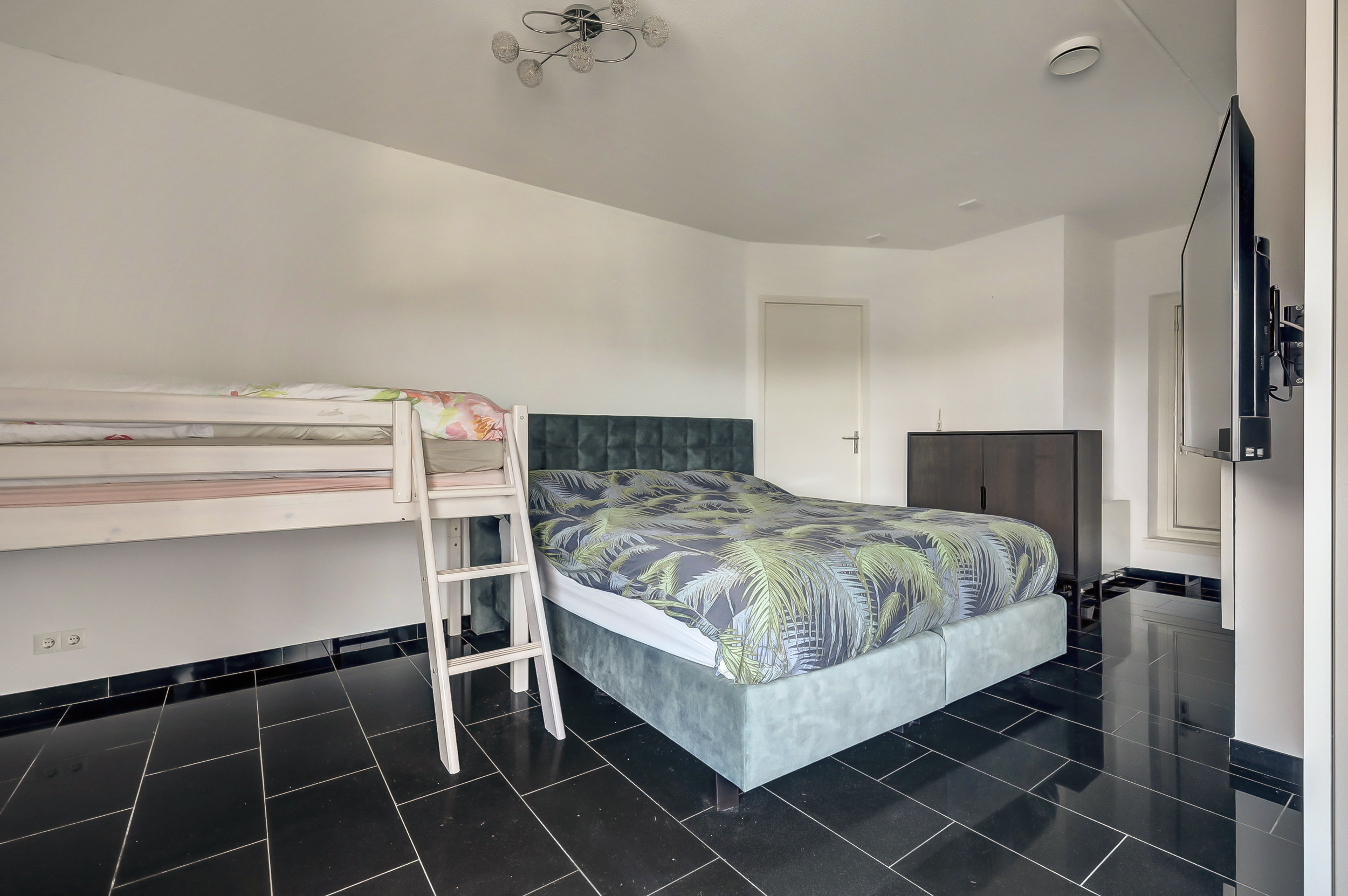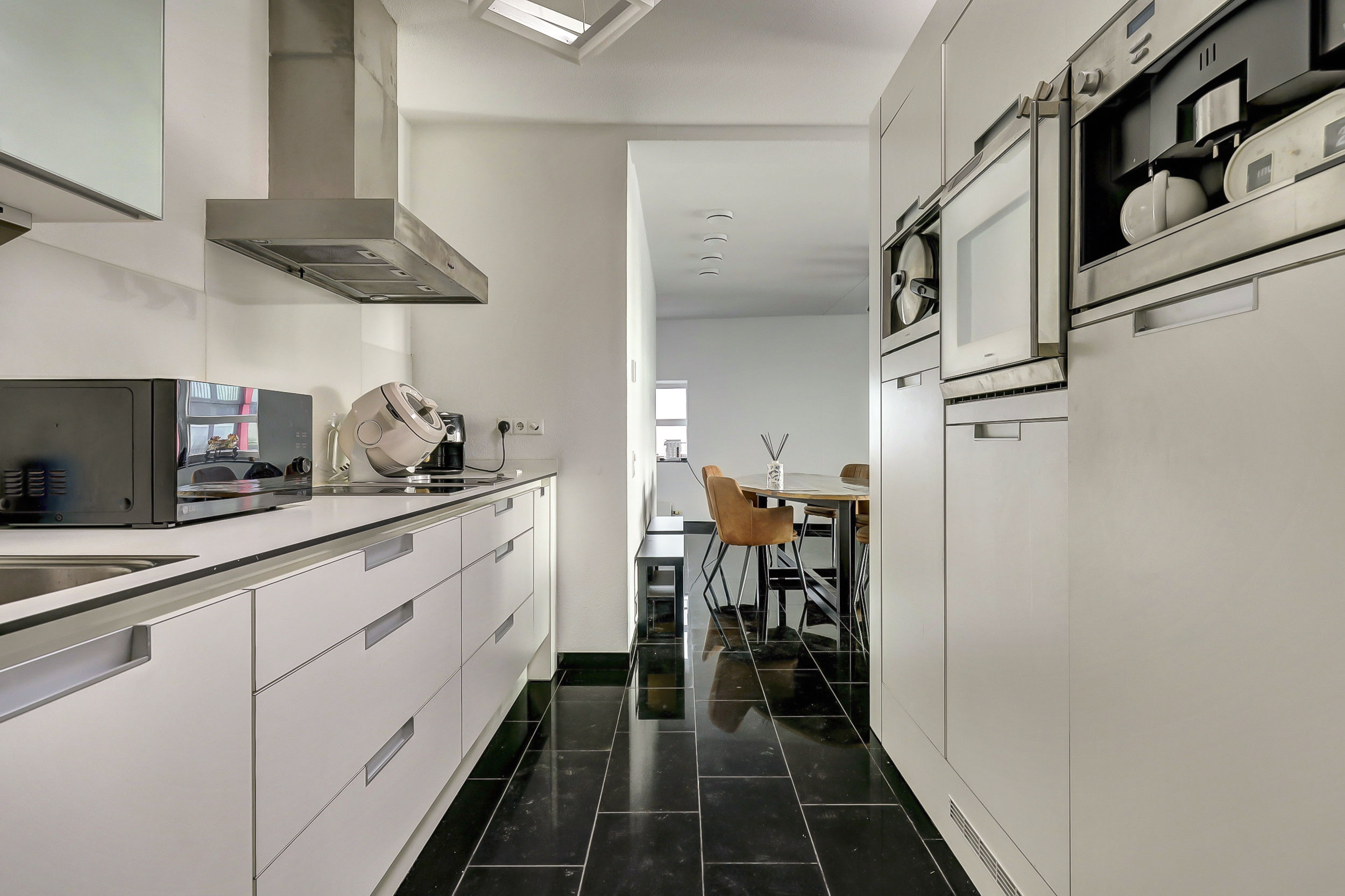 To the right, you enter the living room of over 85 m². The black tiled floor creates a stunning reflection of the constantly changing skies outside! This naturally draws you to the loggia, where the windows stretch from floor to ceiling. It offers you a wide, beautiful view that you can gaze at for hours. In the loggia, there is both a relaxation area and a workspace. The windows are equipped with heat-resistant film, making this one of the best workspaces in Rotterdam, even in the height of summer. It feels almost cinematic!