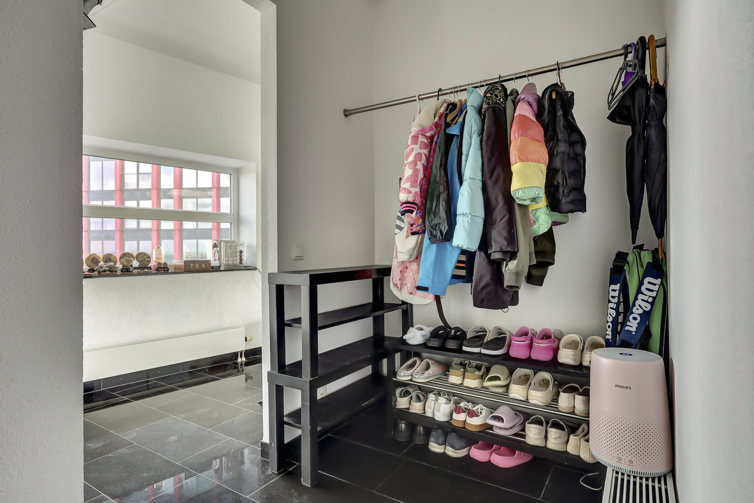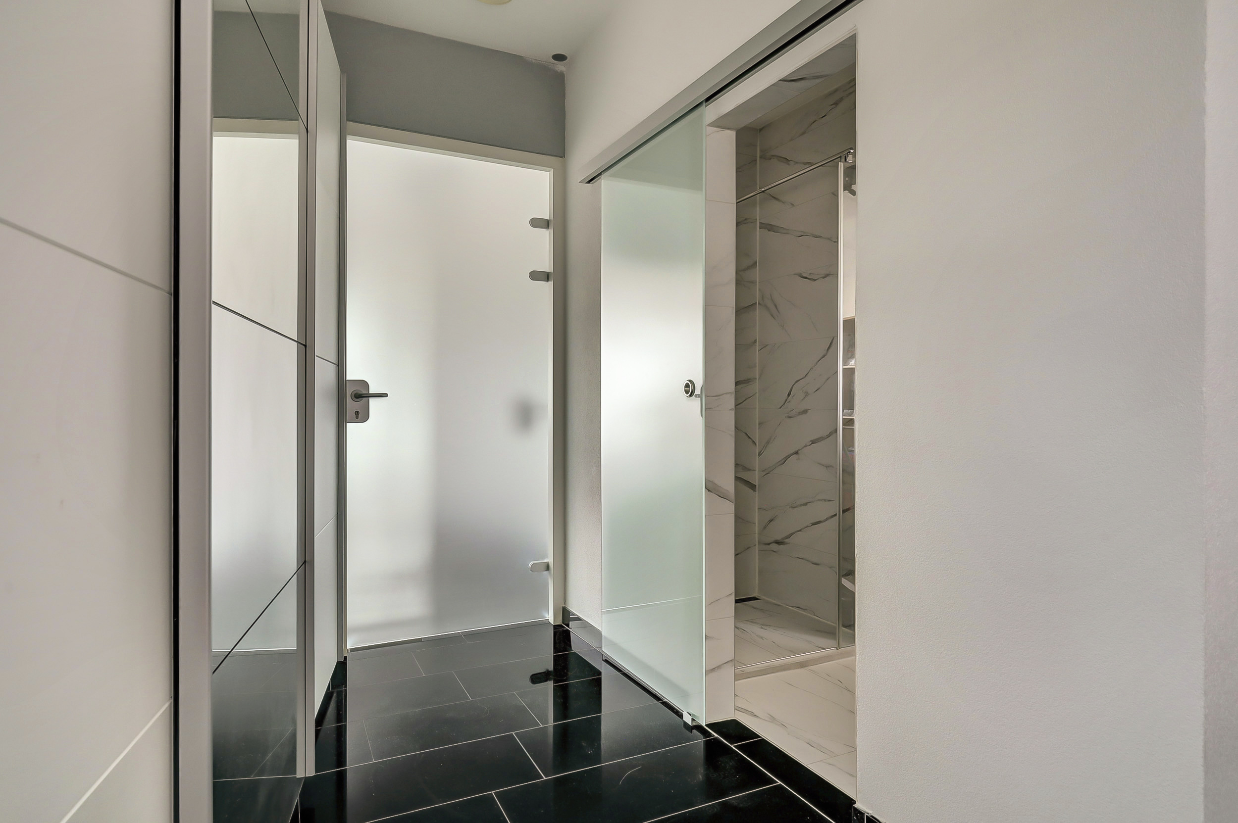 In de gang bevindt zich een ruime inbouwkast met schuifdeuren waar de wasmachine en de droger zijn geplaatst. Tevens is er veel opbergruimte.