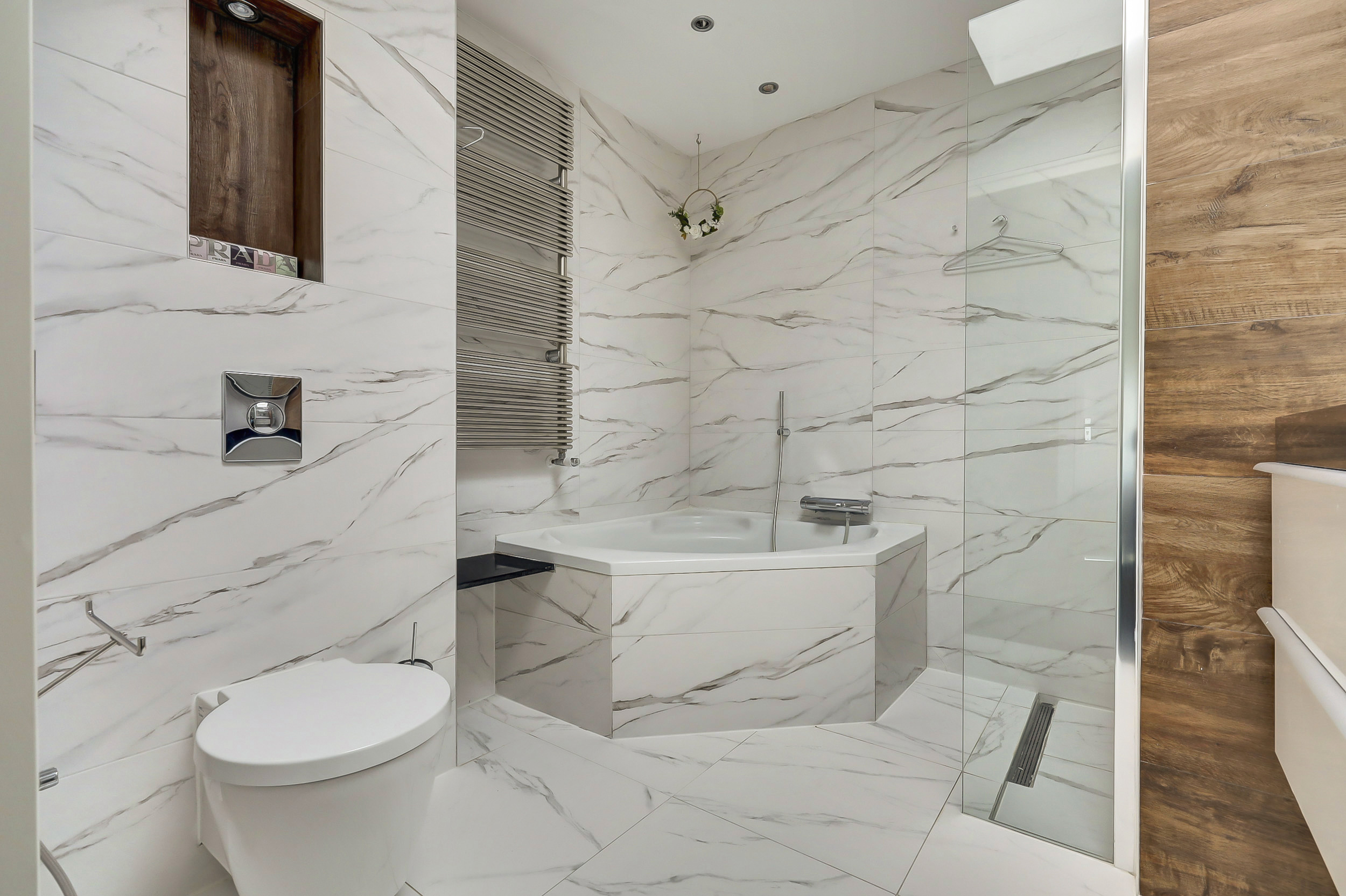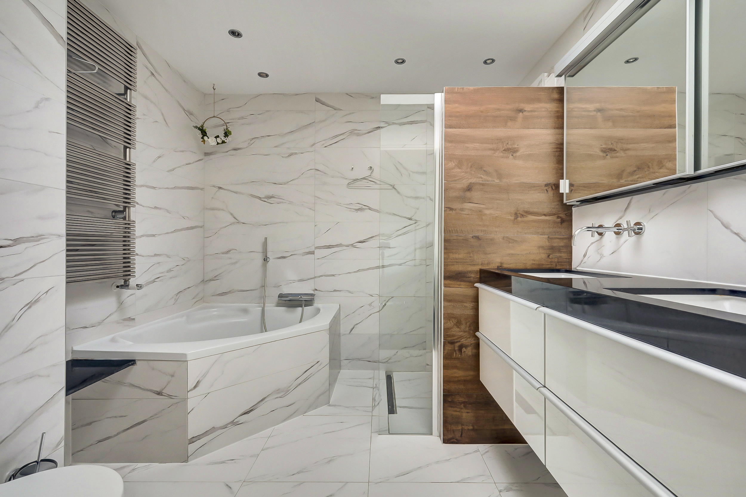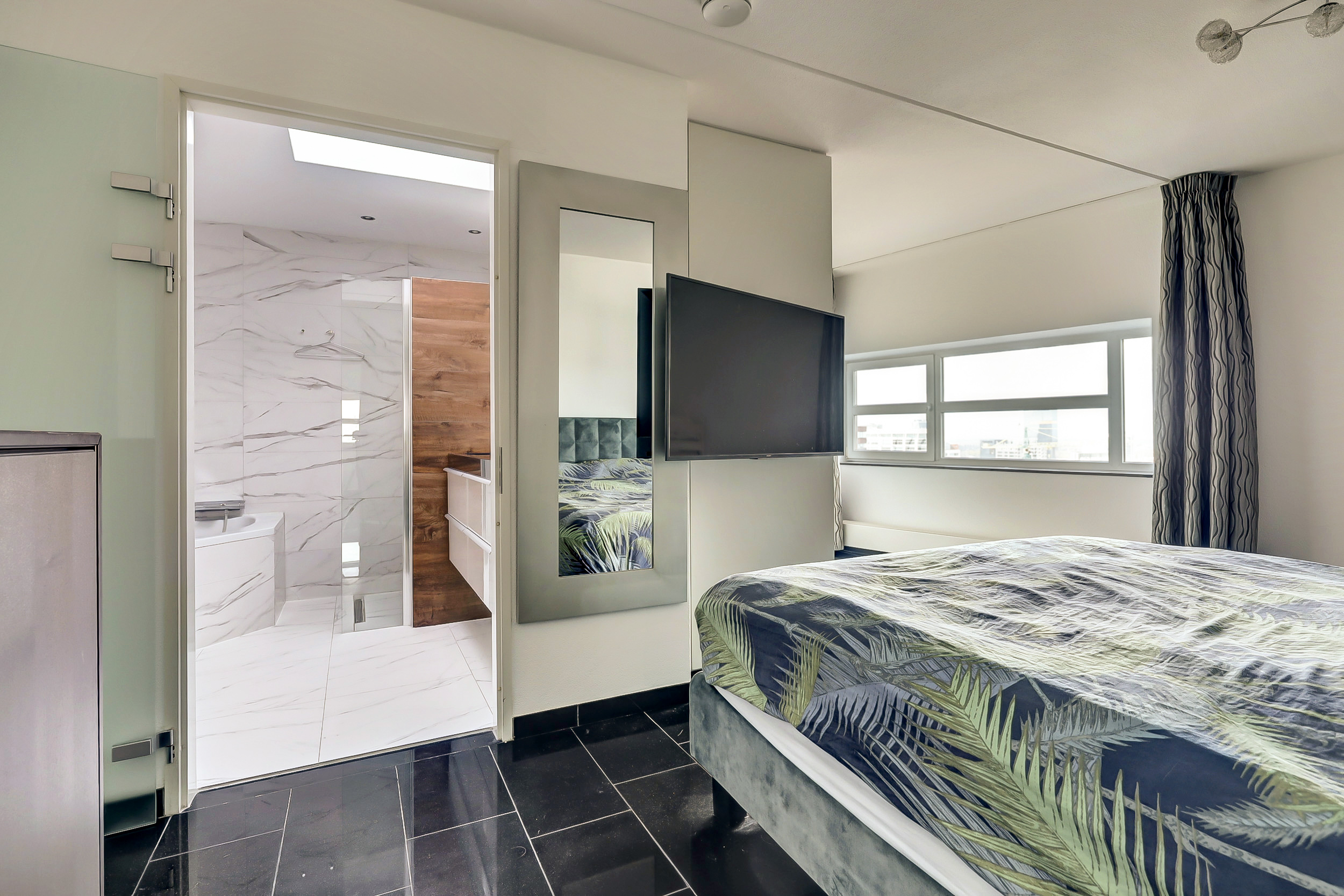 This hallway leads to the master bedroom—a 40 m² room with a large walk-in closet and a private bathroom. From this room, you have a truly stunning view of the northern side of Rotterdam. The luxurious bathroom features a separate walk-in shower with a rainshower, a large corner bathtub, a double sink with a vanity unit, a large mirrored cabinet with built-in lighting, and the second toilet.