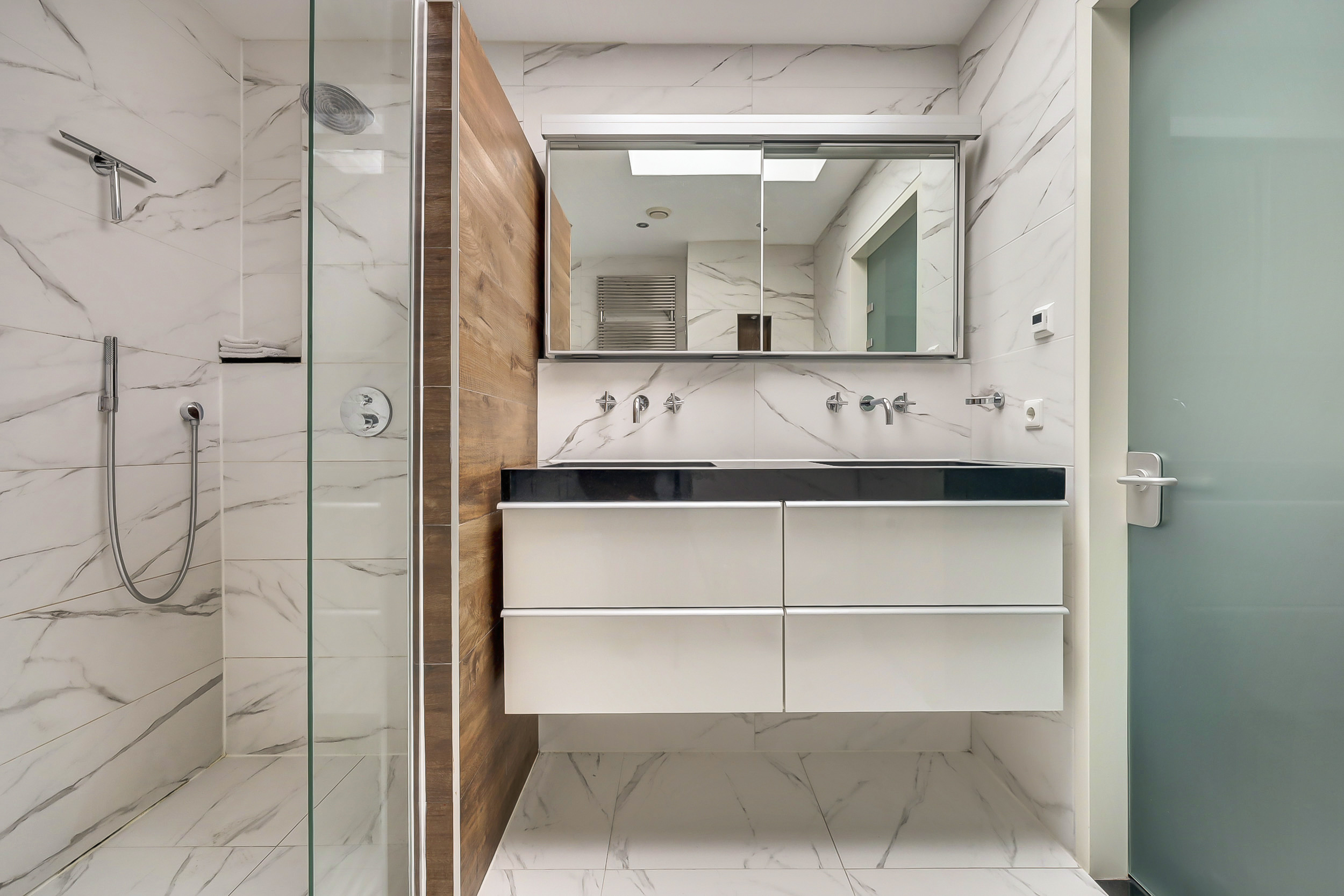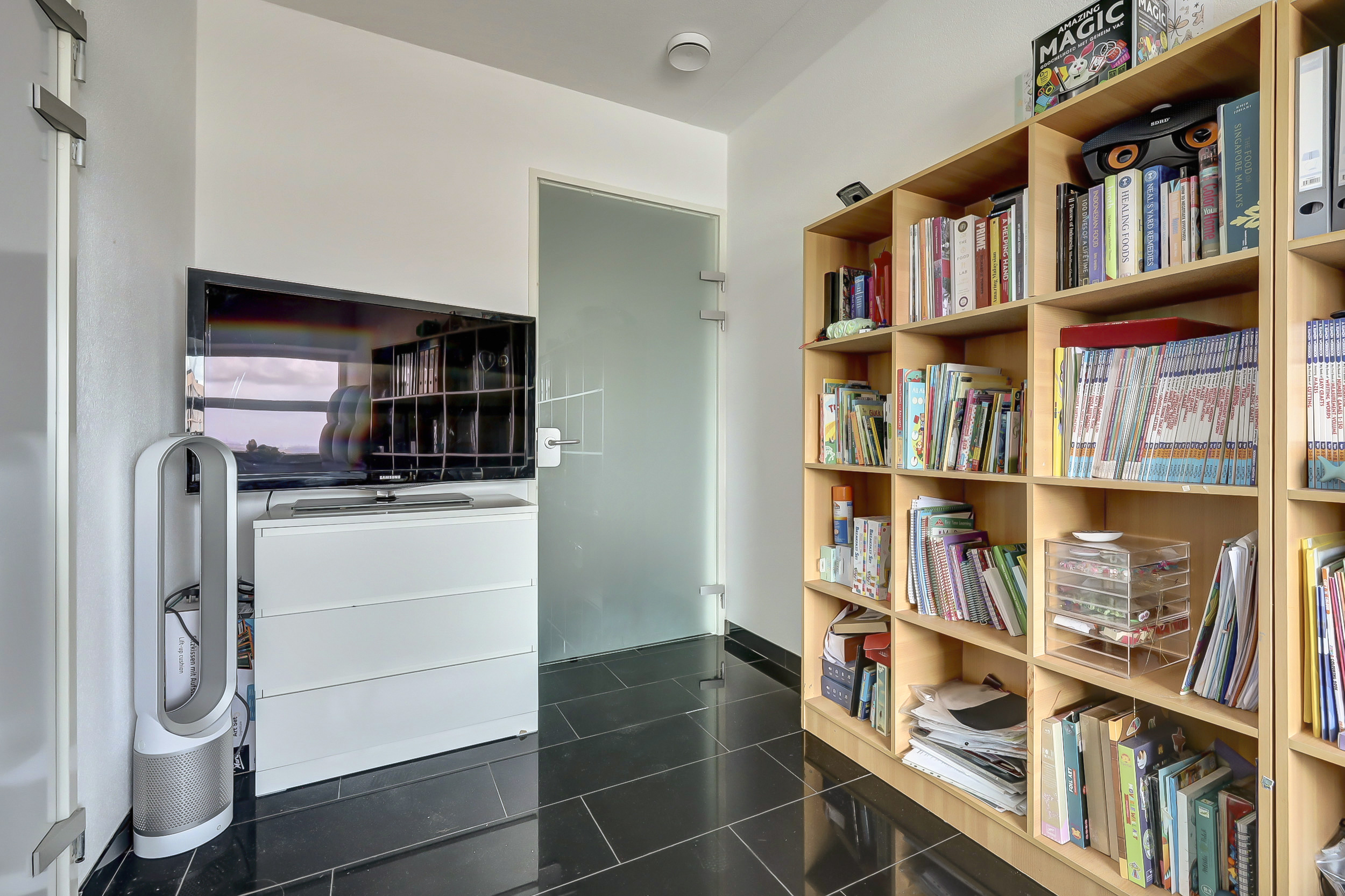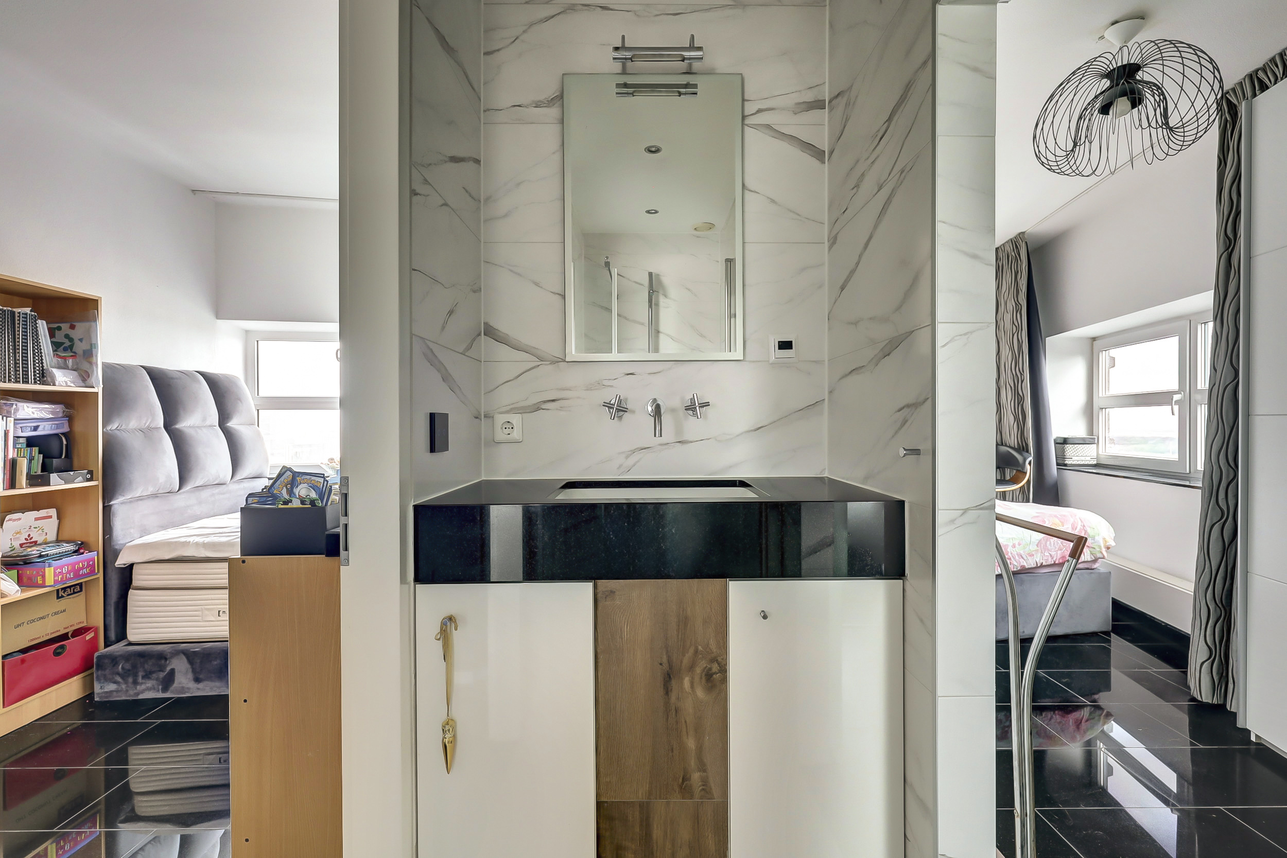 Through the hallway, which has several windows offering captivating views, you walk to the back of the apartment where three spacious rooms are located. Previously, these were two rooms, but the layout has been positively transformed, especially if you frequently have guests, as a guest bathroom has also been added. Both rooms are large enough for a double bed and offer beautiful views—one over the southeast of the city, the other over the north. Currently, one of the rooms is set up as a gym. Between the two rooms, there is a bathroom with a spacious shower and a vanity unit with a sink.