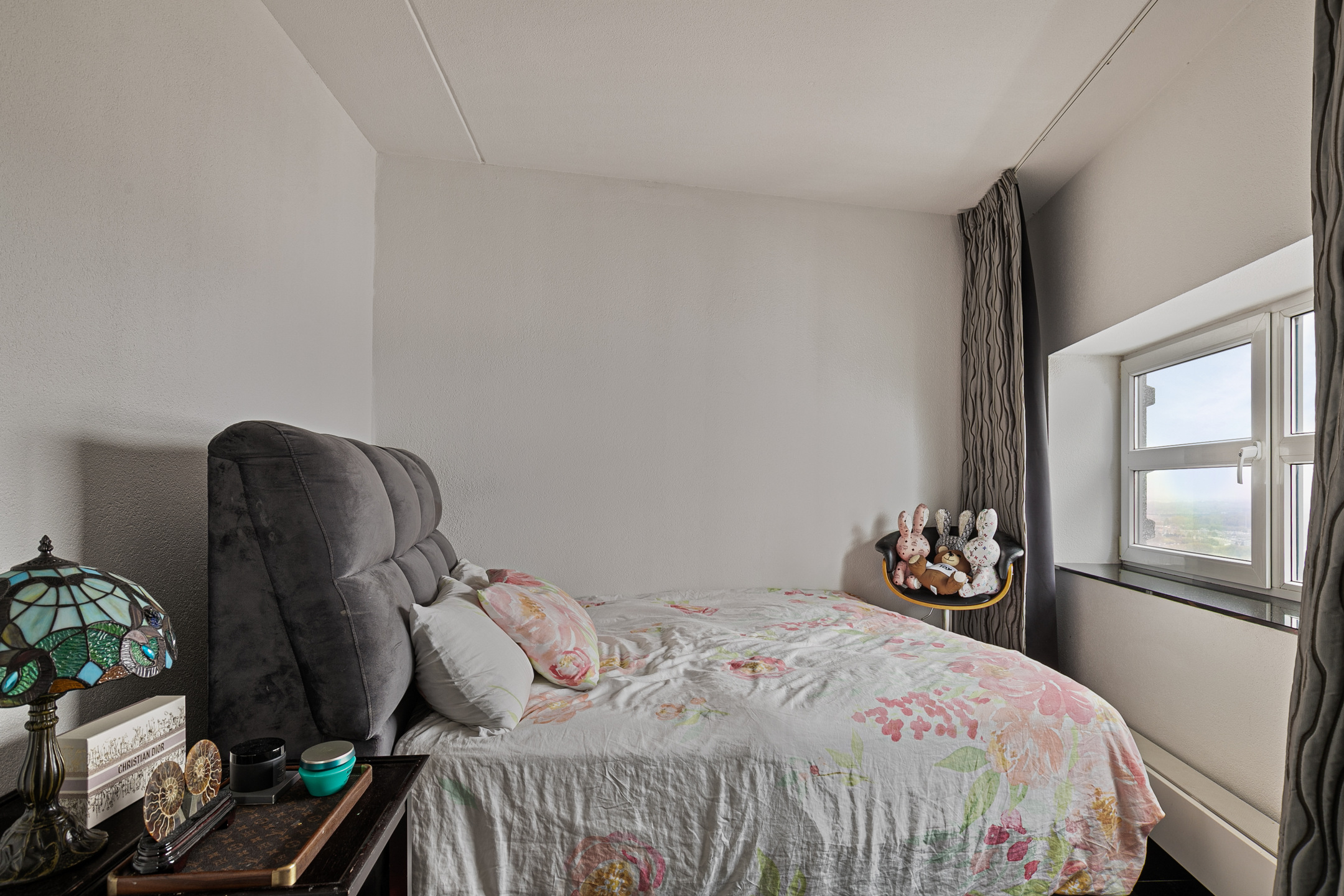 Via de gang, voorzien van een aantal ramen waar je steeds blijft hangen voor het uitzicht loop je naar de achterkant van het appartement waar zich een 3-tal ruime kamers bevinden. Voorheen waren dit 2 kamers, maar, zeker wanneer je vaker gasten ontvangt, is de indeling zeer positief veranderd omdat er ook een gastenbadkamer is toegevoegd. Beide kamers bieden voldoende ruimte voor een tweepersoonsbed, en hebben een prachtig uitzicht, de 1 over het Zuid-Oosten van de stad, de ander over het Noorden van de stad. Op dit moment is 1 van de 2 kamers ingericht als gym. Tussen beide kamers bevindt zich een badkamer voorzien van een ruime douche en een wastafel met meubel.
